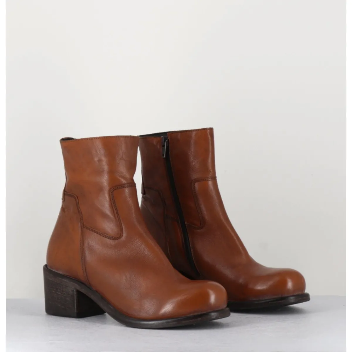 Bottines en cuir camel tige courte, zip intérieur, bout rond, empiècements rétro & coutures ton sur ton, montées sur un talon bloc confortable et une semelle cousue main.