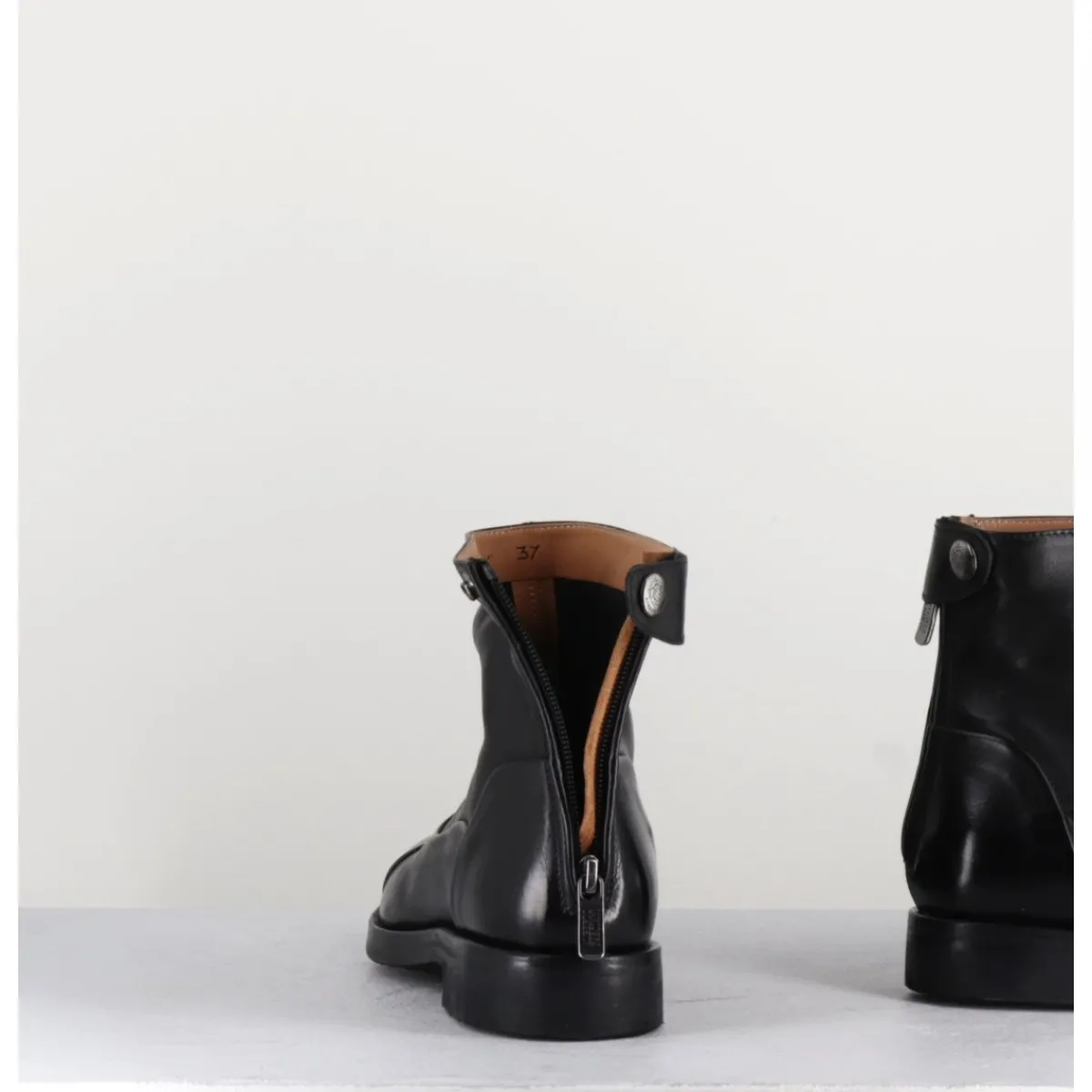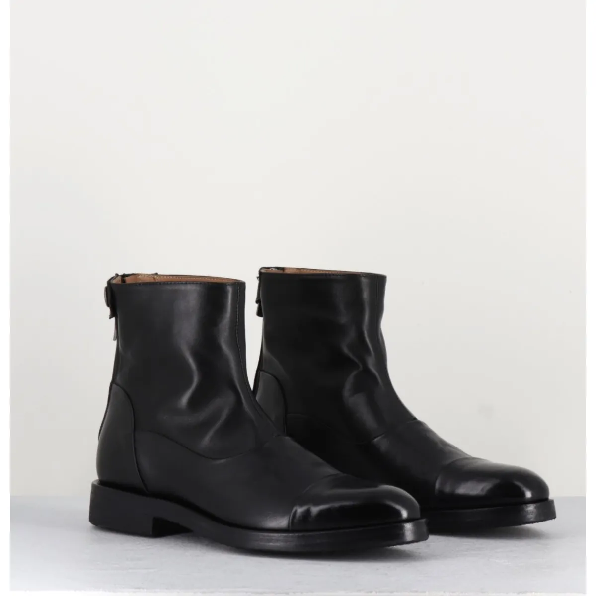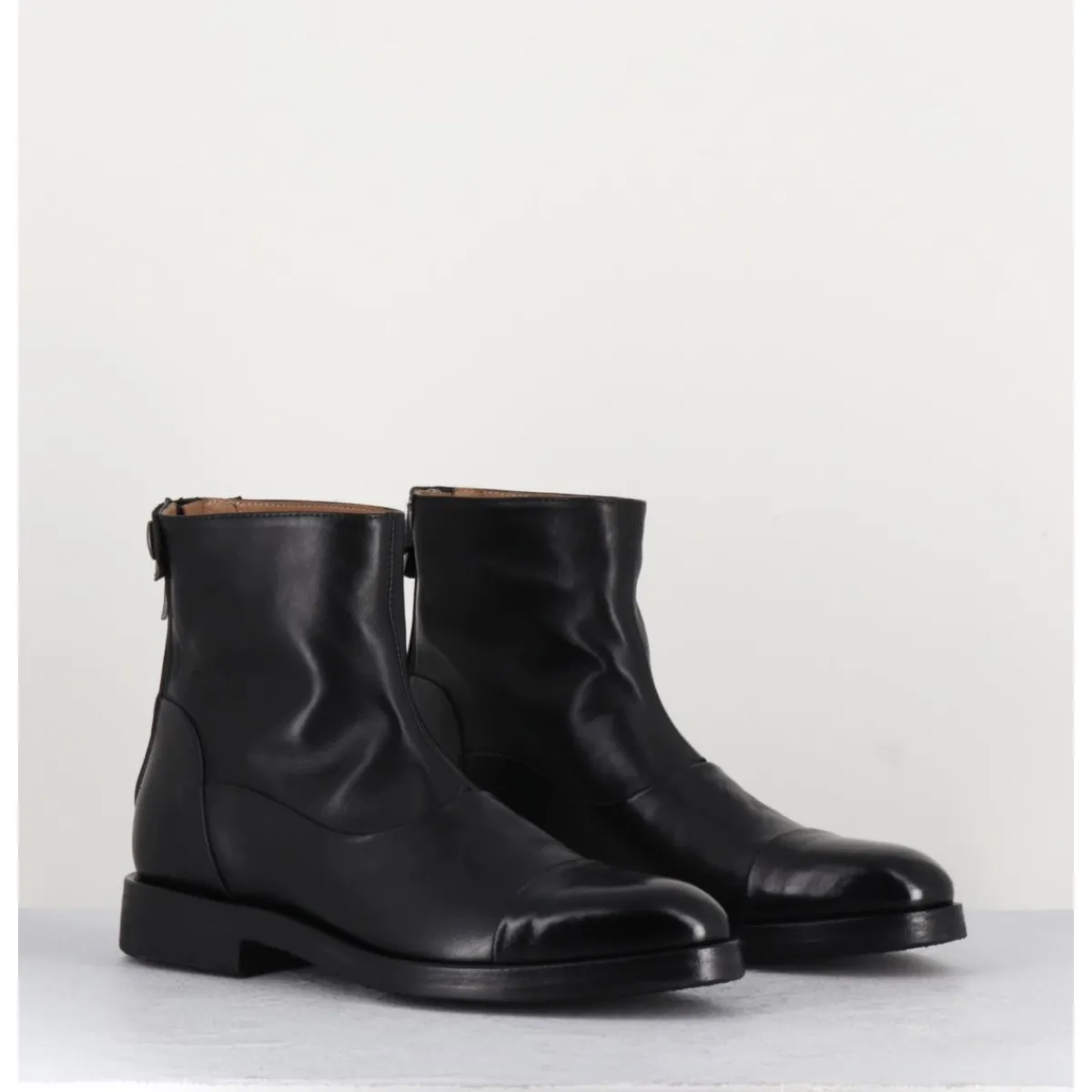 Bottines plates en cuir souple noir, bout en amande rapporté et zip arrière avec pression signature de la Maison Fasciani, montées sur une semelle en gomme très souple. D’un extrême confort.