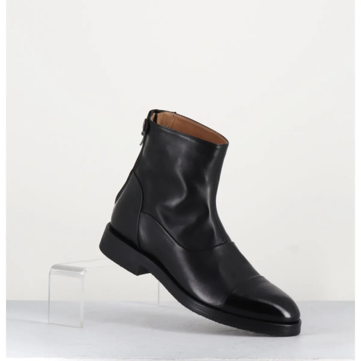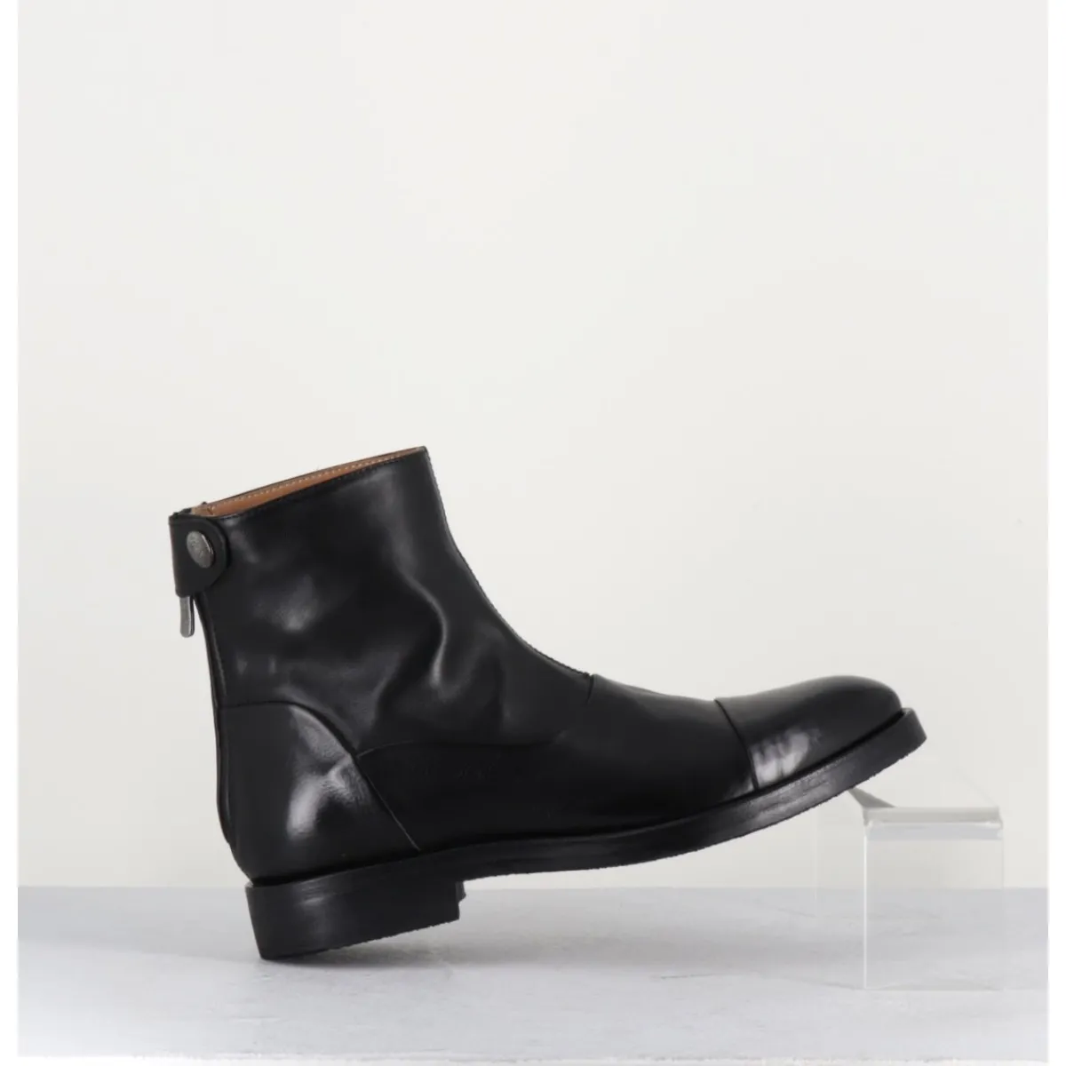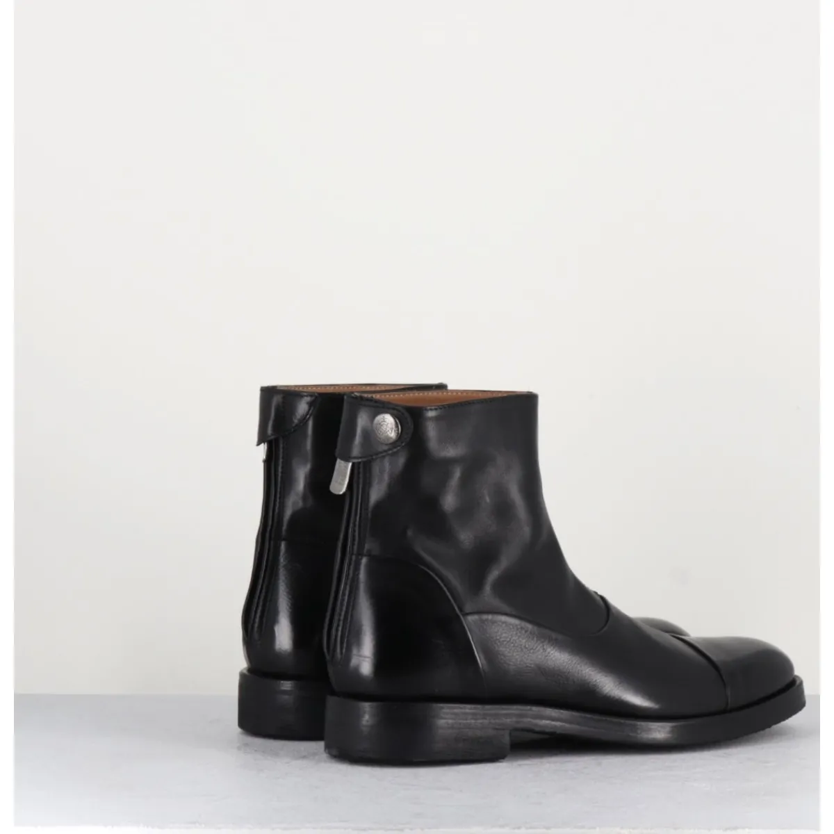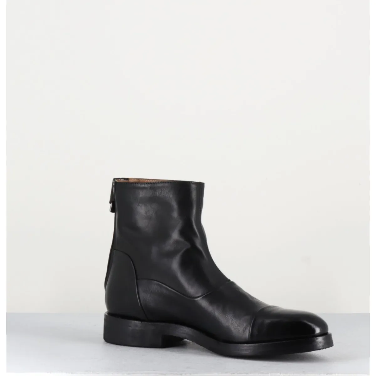 Bottines plates en cuir souple noir, bout en amande rapporté et zip arrière avec pression signature de la Maison Fasciani, montées sur une semelle en gomme très souple. D’un extrême confort.
