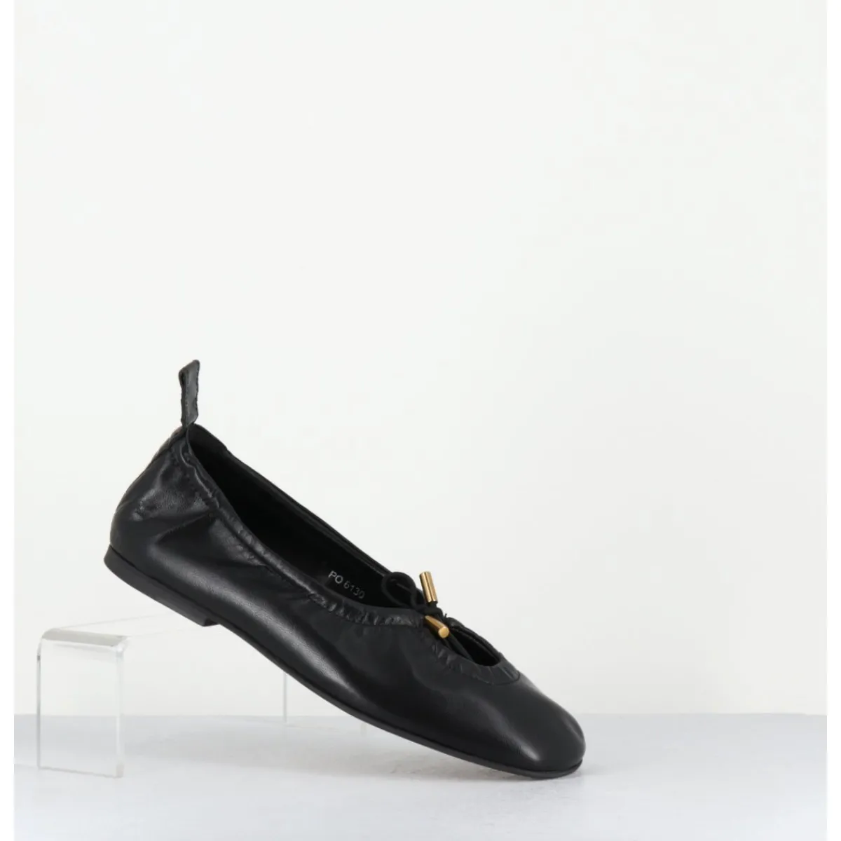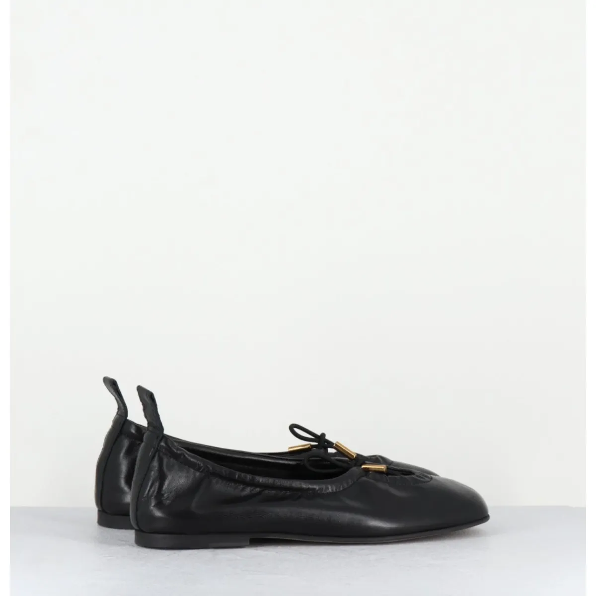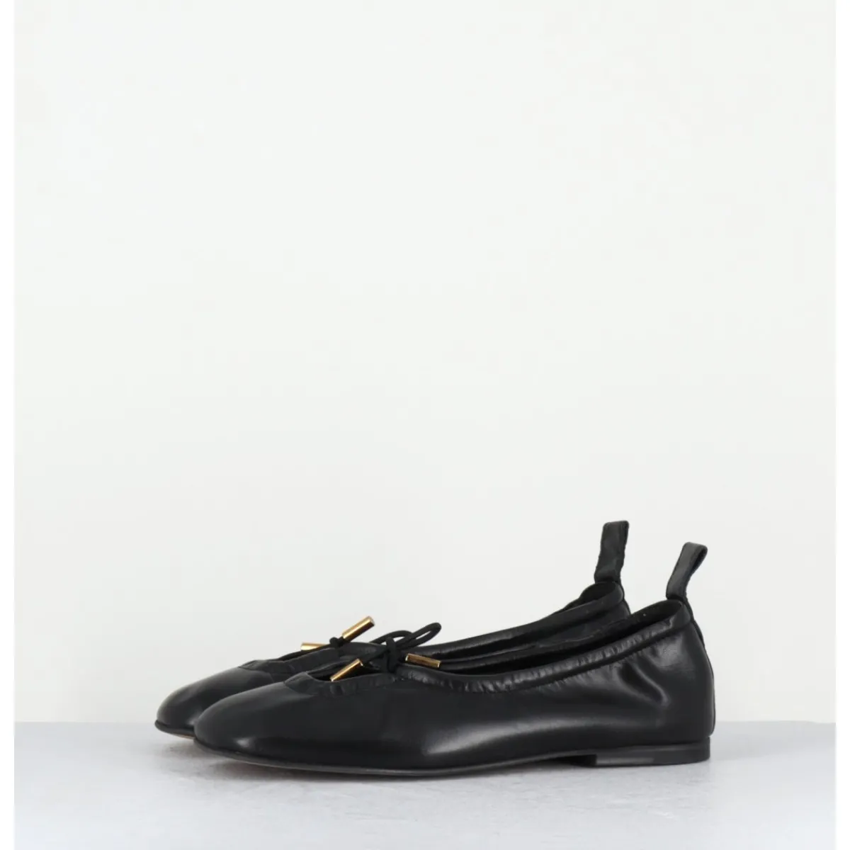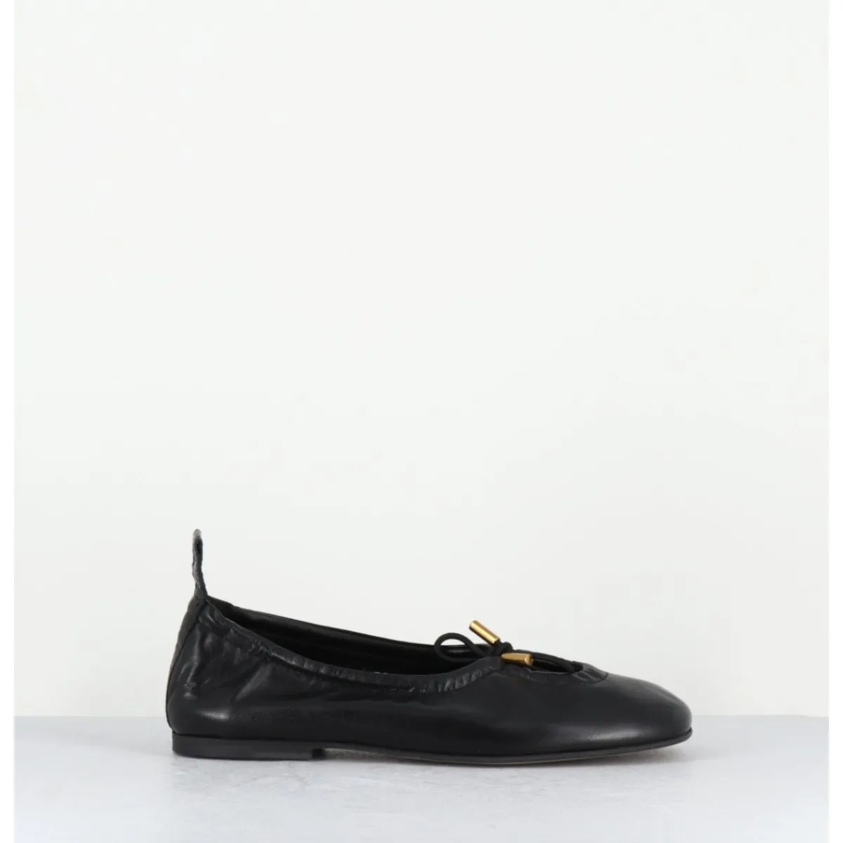 Ballerines plates en cuir noir, petit noeud élastique avec finitions dorées réglable à l’avant, bout carré arrondi