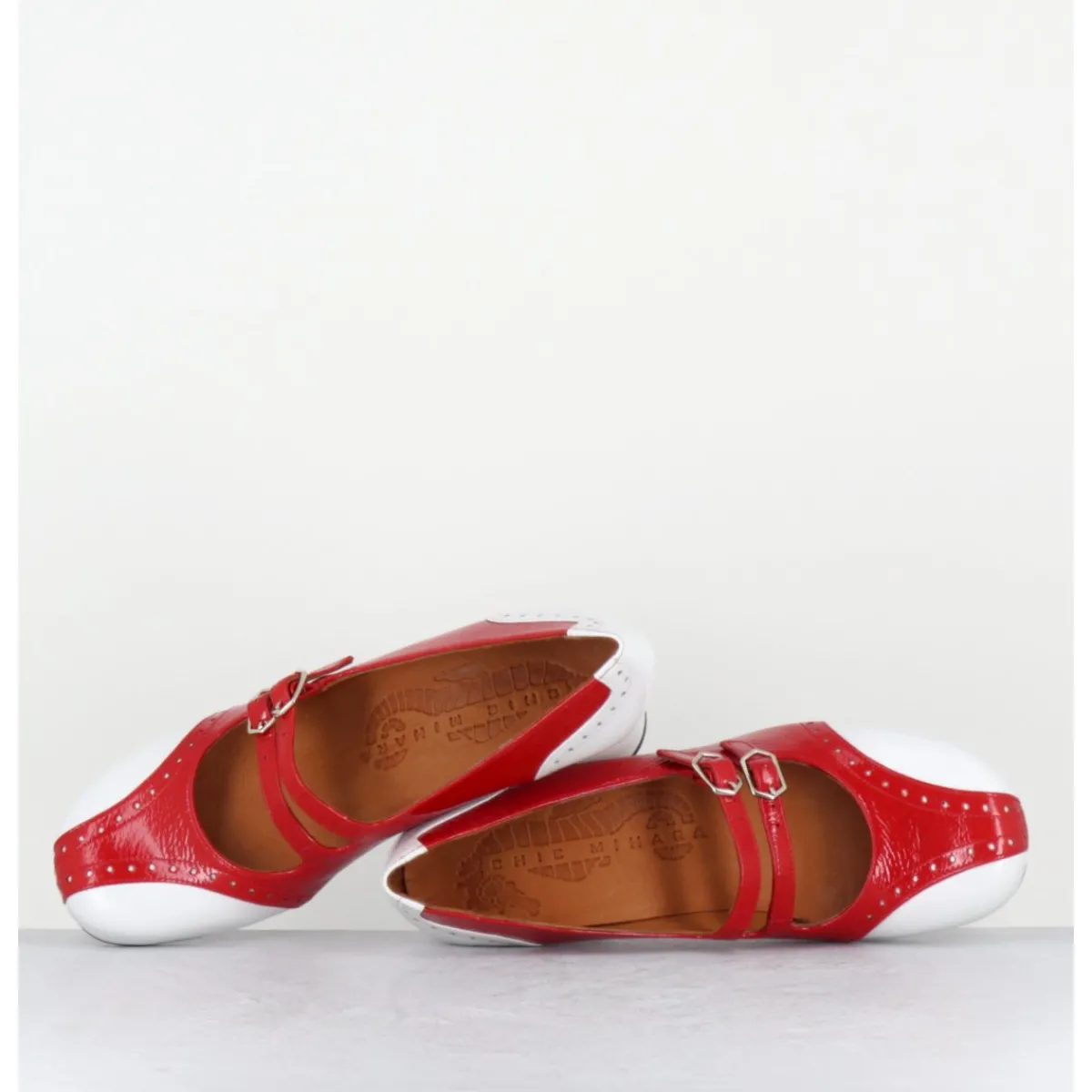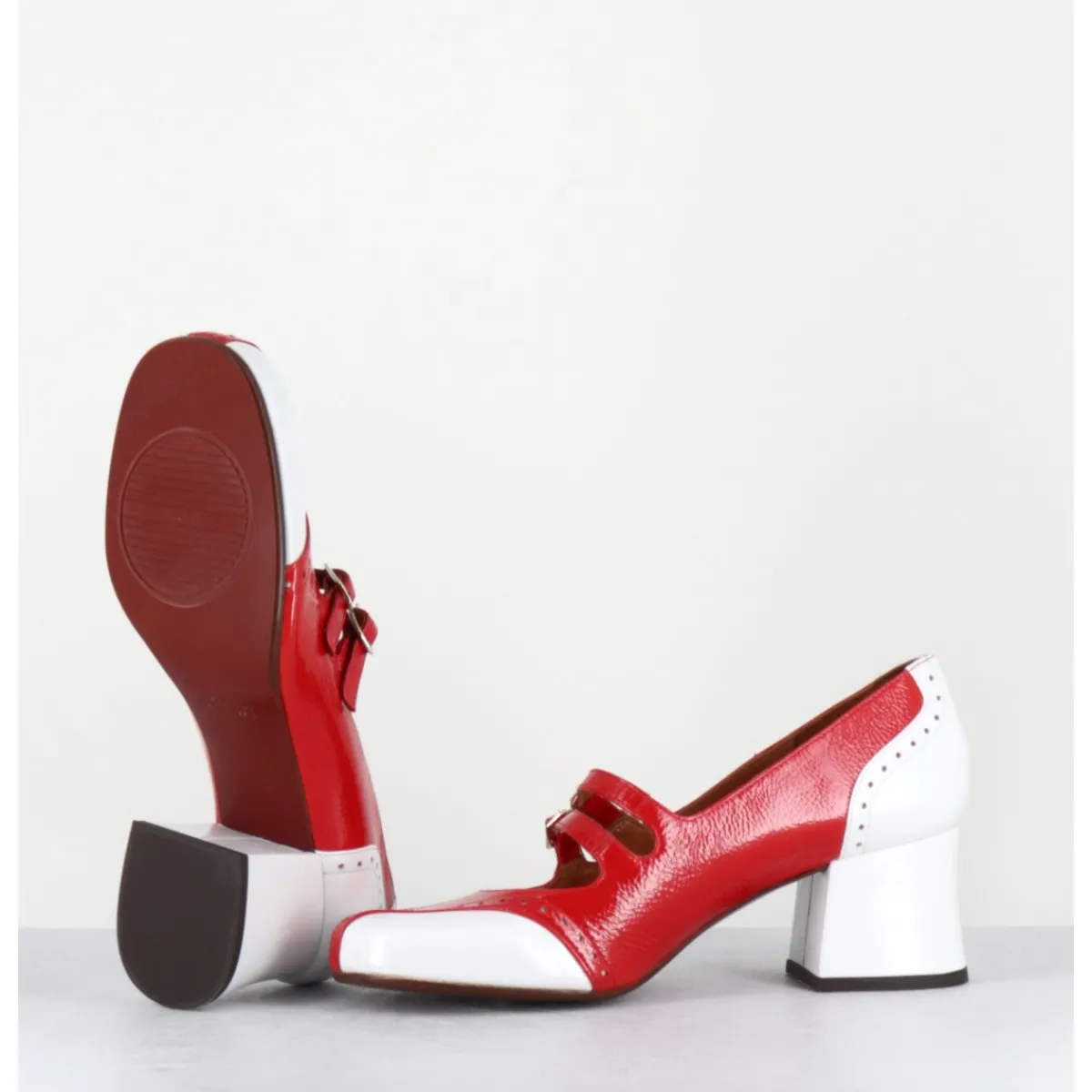 Chaussures – babies double brides réglables en cuir vernis souple effet brillant rouge & blanc, bout arrondie, détails de petits trous esprit vintage, montées sur un petit talon trotteur légèrement évasé