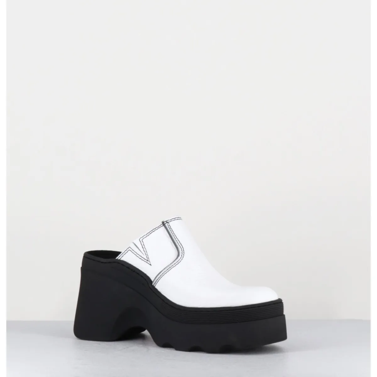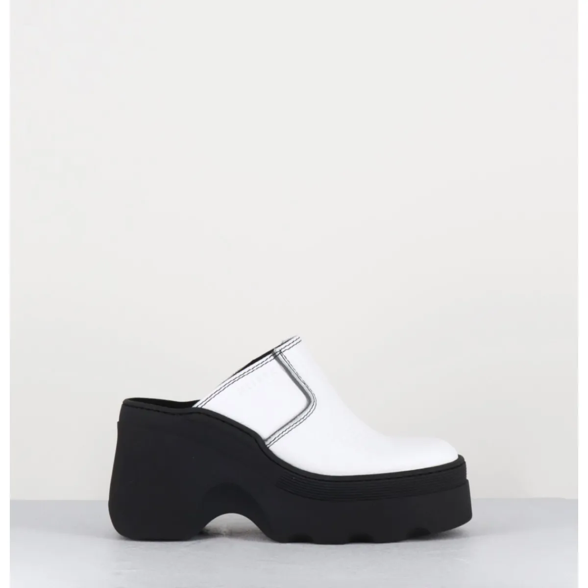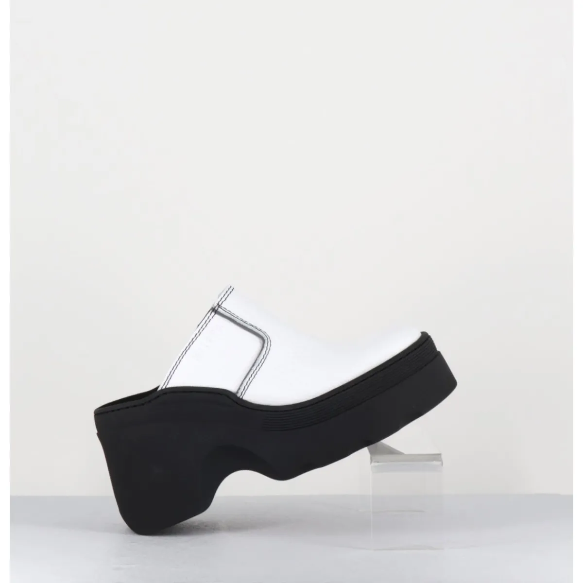 Mules compensées en cuir blanc esprit années 90, montées sur une plateforme bloc stylisée avec surpiqures contrastantes à l’avant & détails gris 3M réfléchissants, muni d’un petit élastique intérieur pour plus d’aisance + Signature de la Maison Miista ton sur ton. Ultra confortable