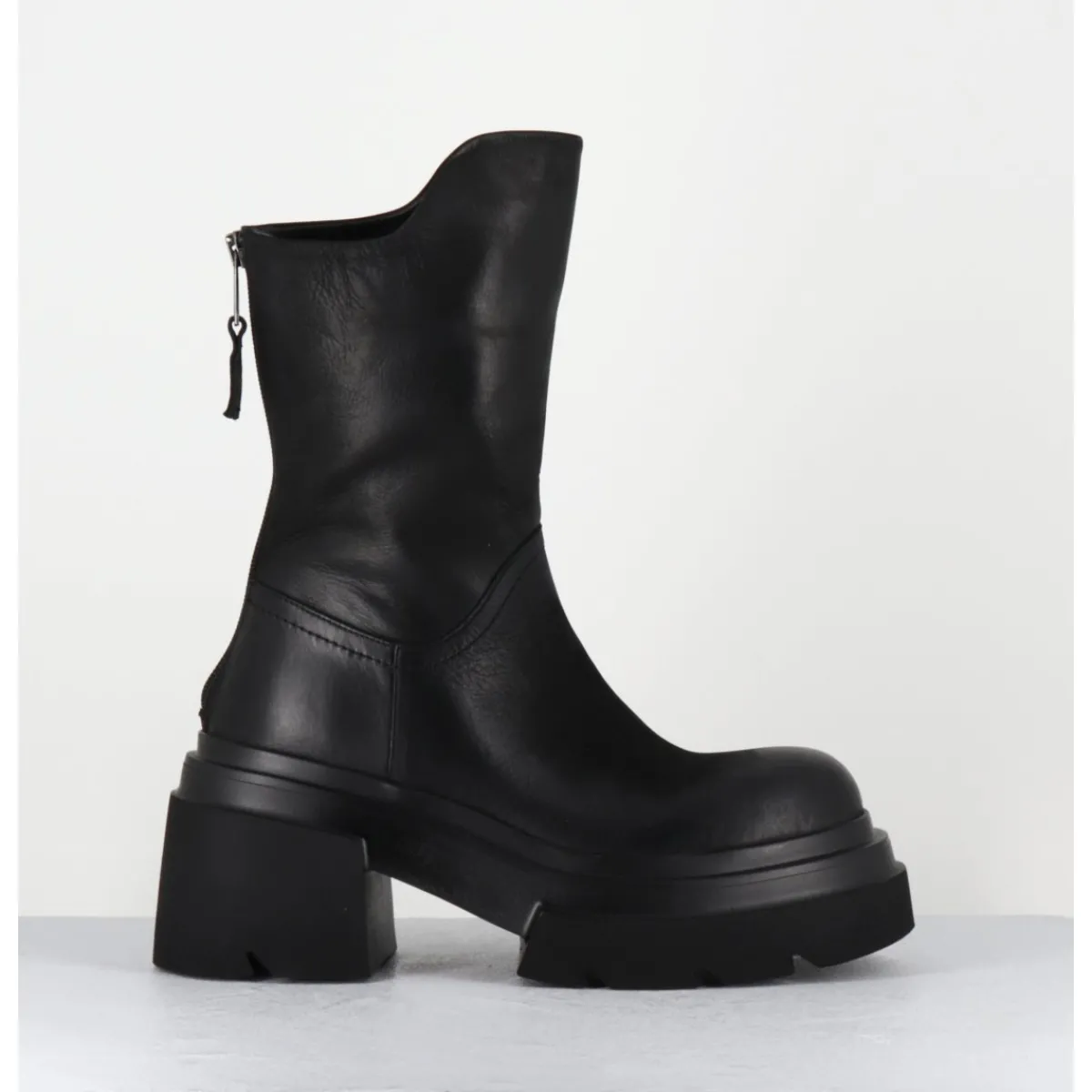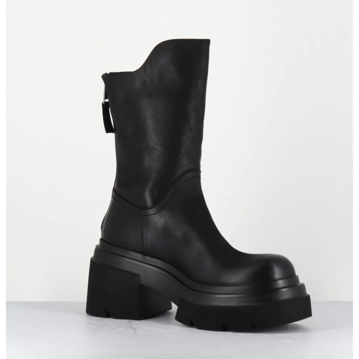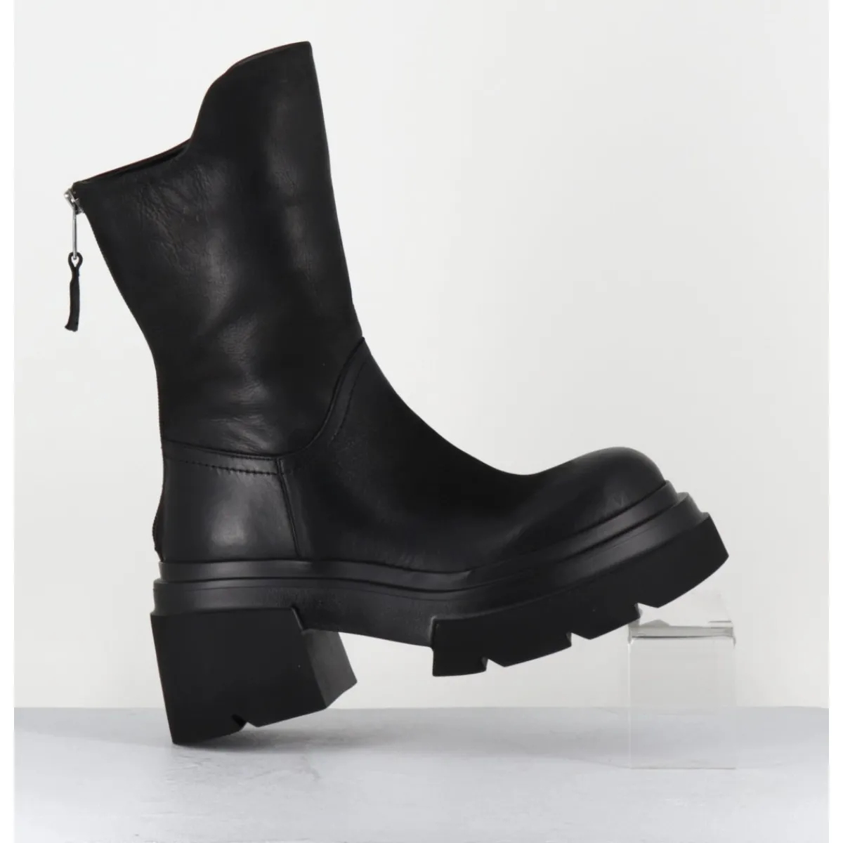 Boots en cuir noir patiné à la main pour un effet légèrement vieilli, bout arrondi, zip arrière avec découpe asymétrique sur la jambe, montées sur une semelle chunky ultra légère