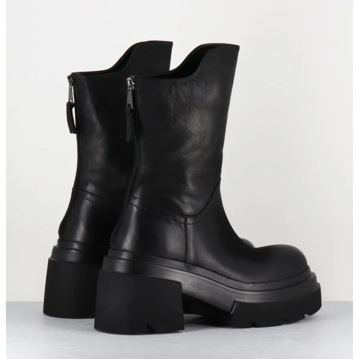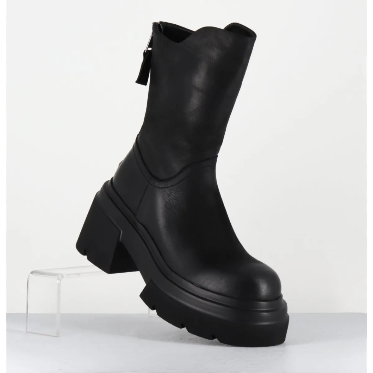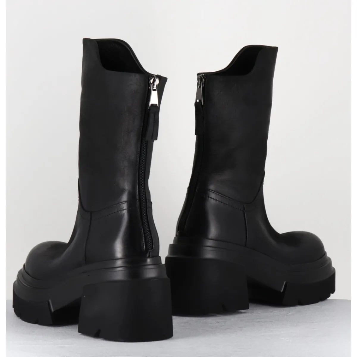 Boots en cuir noir patiné à la main pour un effet légèrement vieilli, bout arrondi, zip arrière avec découpe asymétrique sur la jambe, montées sur une semelle chunky ultra légère