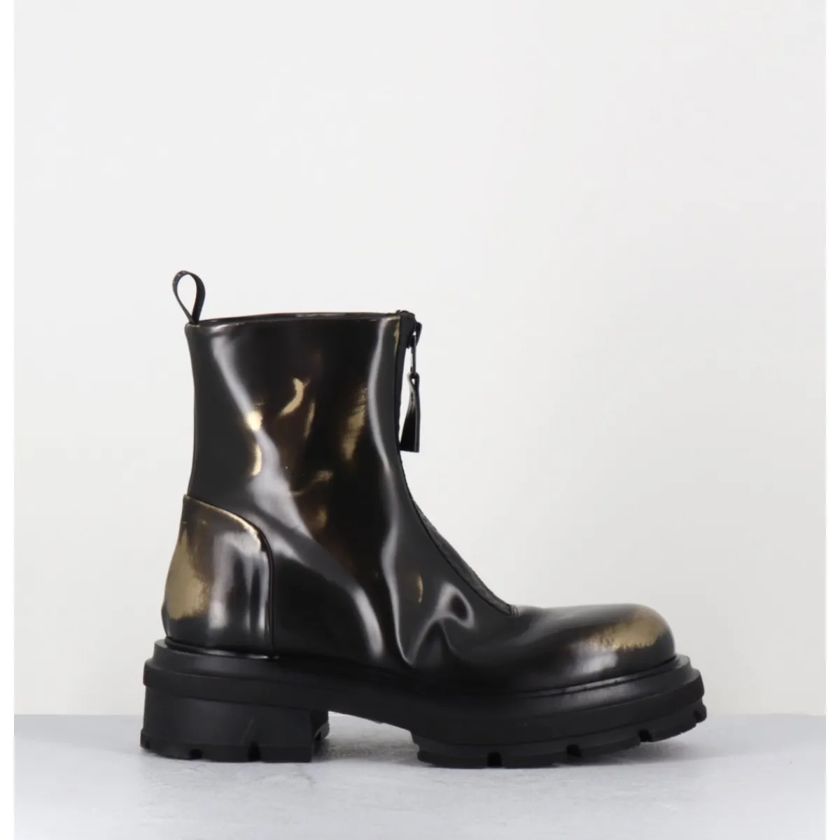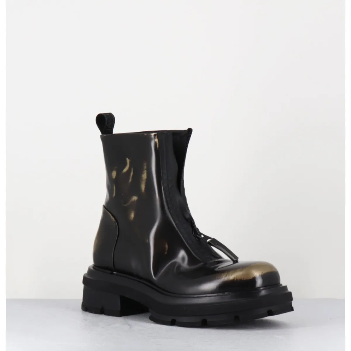 Boots effet glacé marron et or brossé pour un effet volontairement ‘usé’, bout arrondi et zip à l’avant, montées sur une semelle épaisse légère