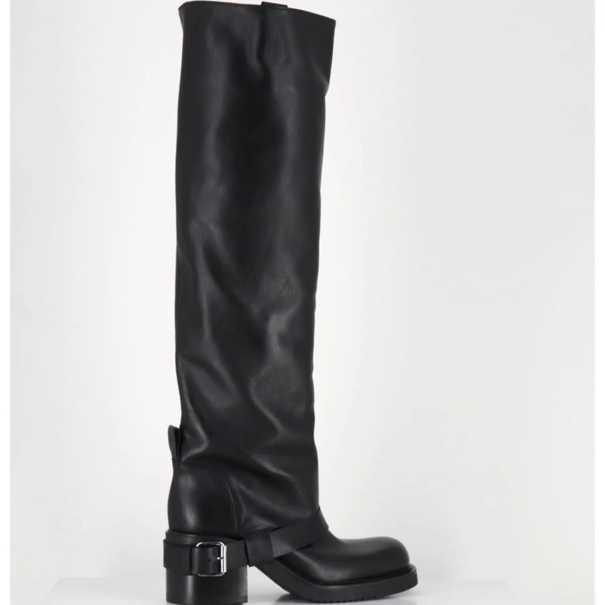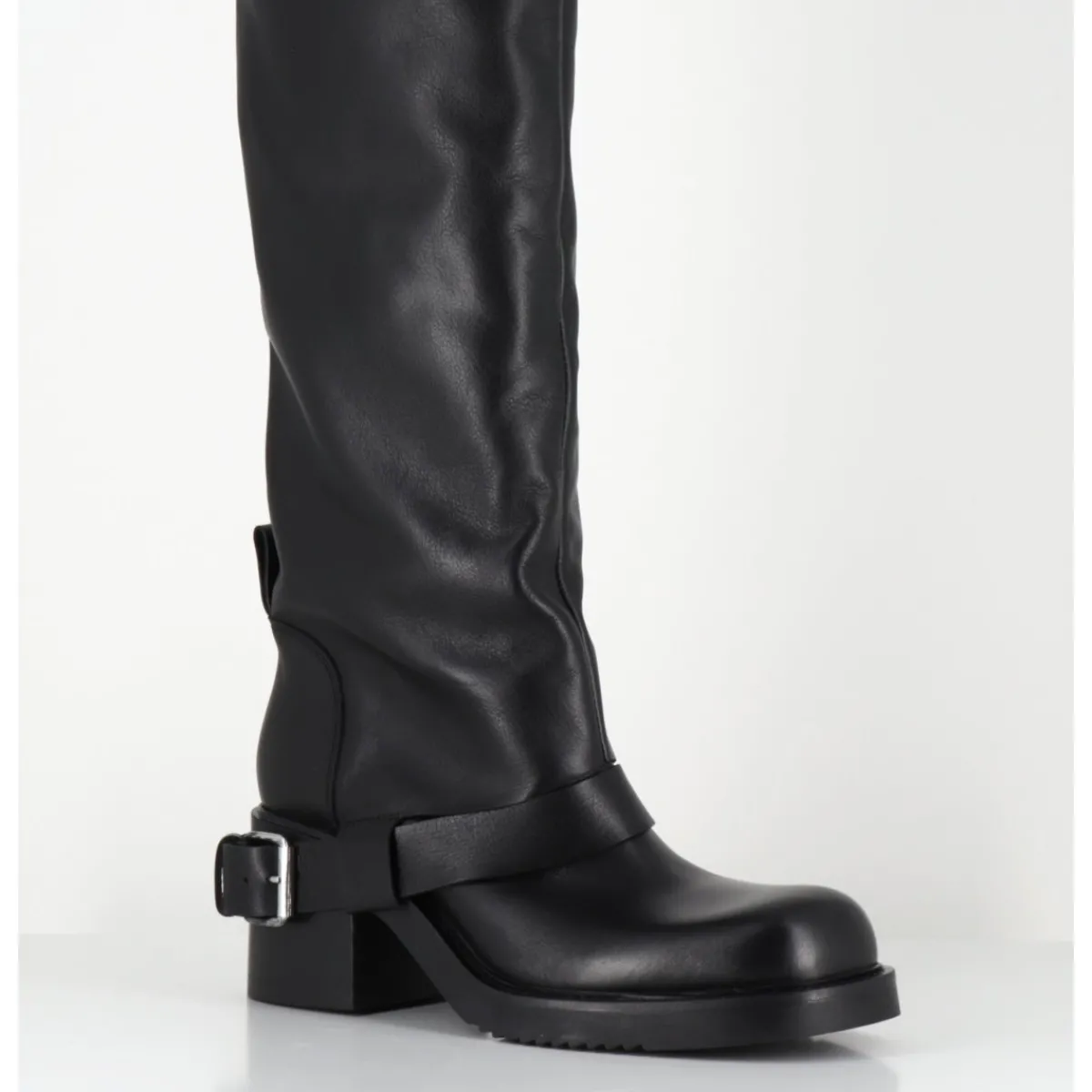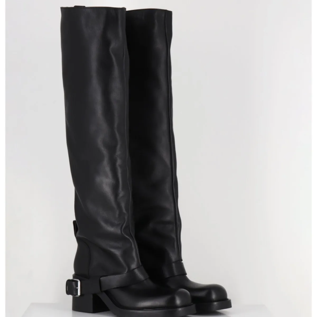 Bottes genouillères en cuir noir souple, ligne pure esprit bikers à tige haute tubulaire avec passant à boucle, montées sur un talon bloc et une semelle en gomme légère
