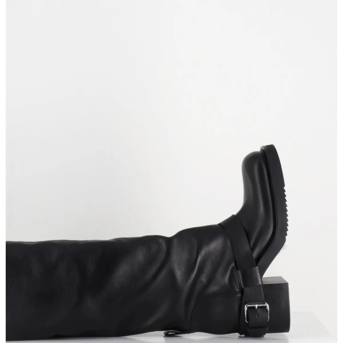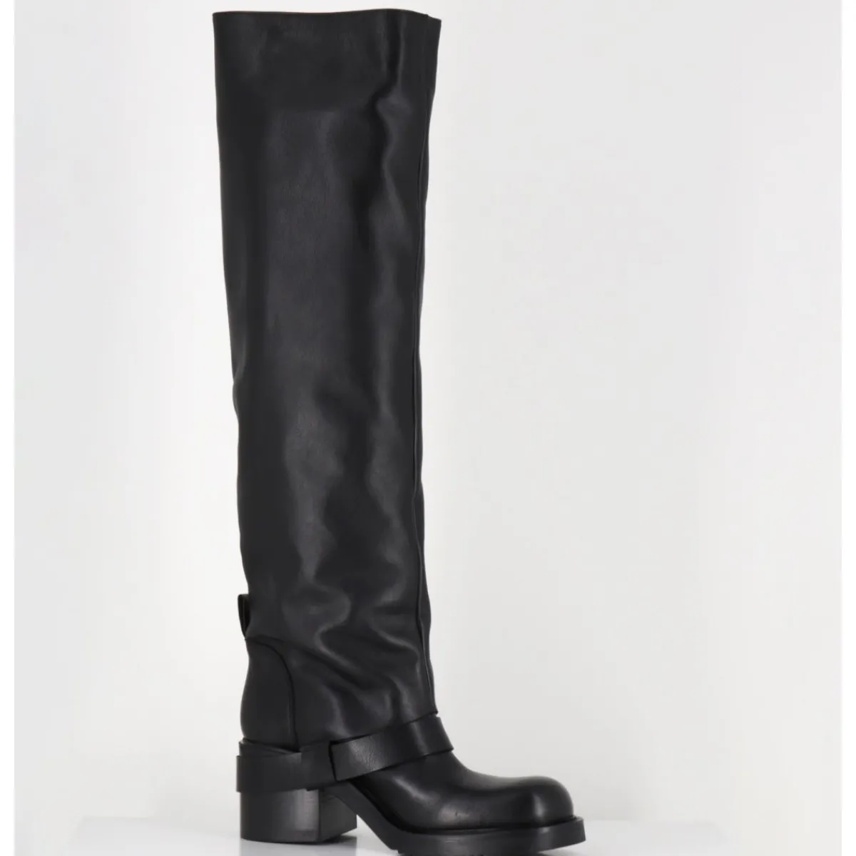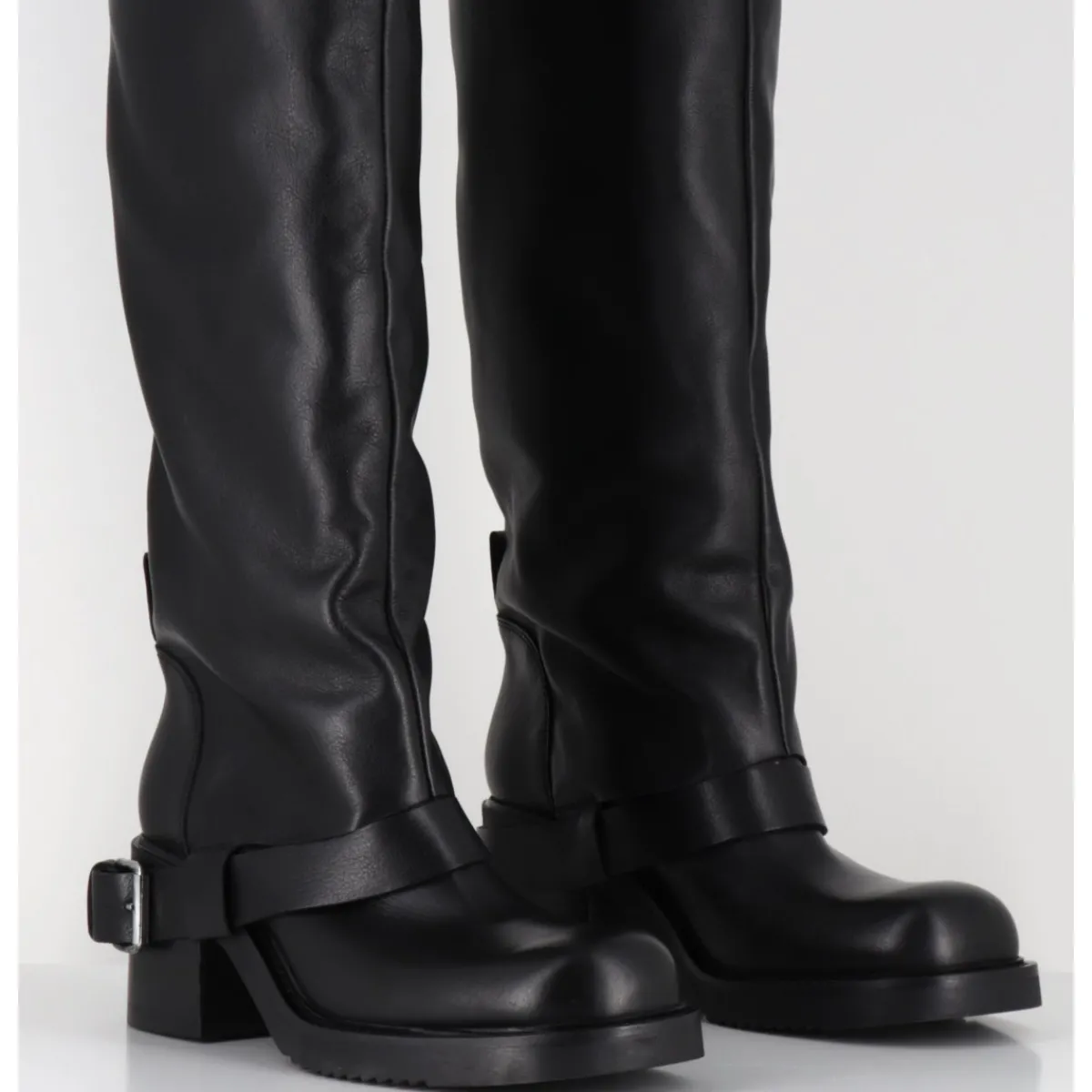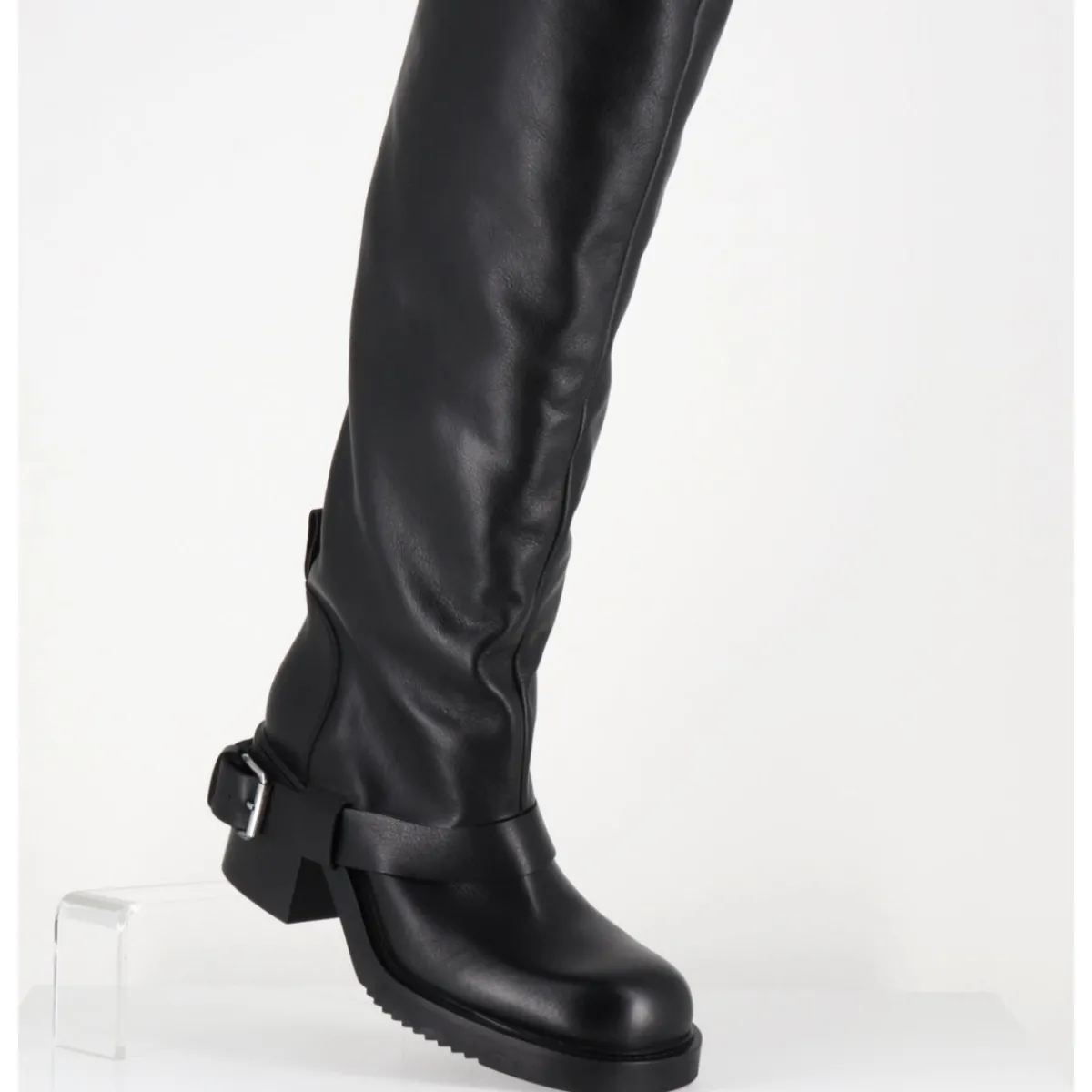 Bottes genouillères en cuir noir souple, ligne pure esprit bikers à tige haute tubulaire avec passant à boucle, montées sur un talon bloc et une semelle en gomme légère