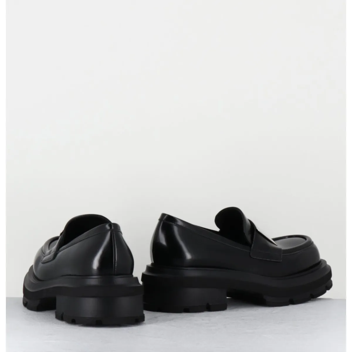 Mocassins effet glacé noir avec empiècement métallique à l’avant, montées sur une semelle épaisse en gomme légère
