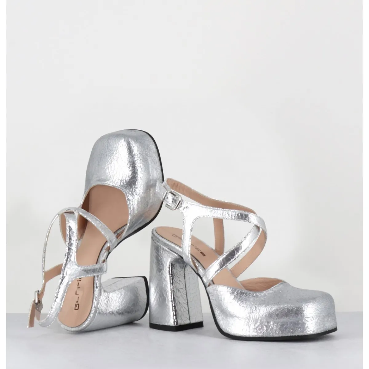 Babies à plateforme brides croisés en cuir effet craquelé argenté, bout carré recouvert, ligne pure, montées sur un talon large stylisé