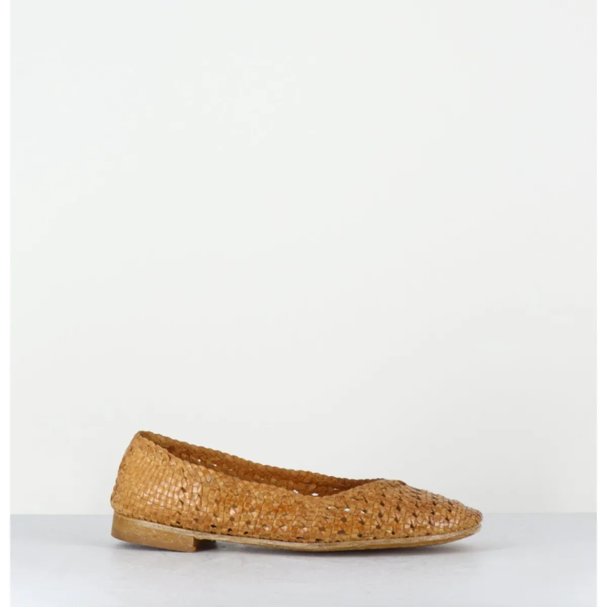 Ballerines en cuir tressé jaune moutarde non doublé extrêmement souple, bout en amande, semelle cuir cousue main