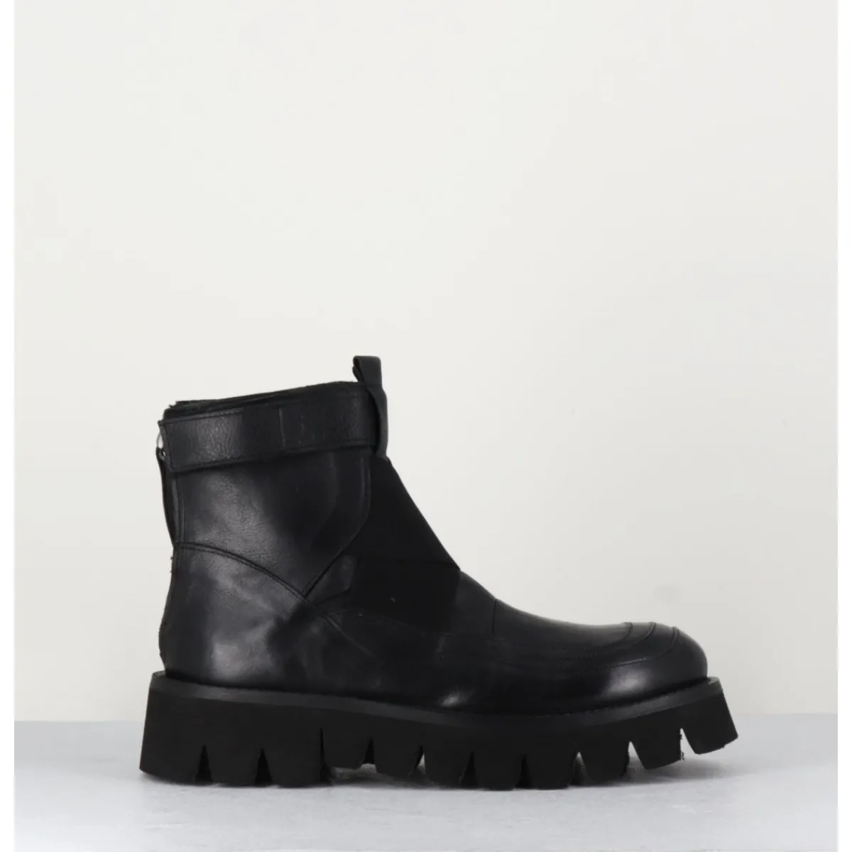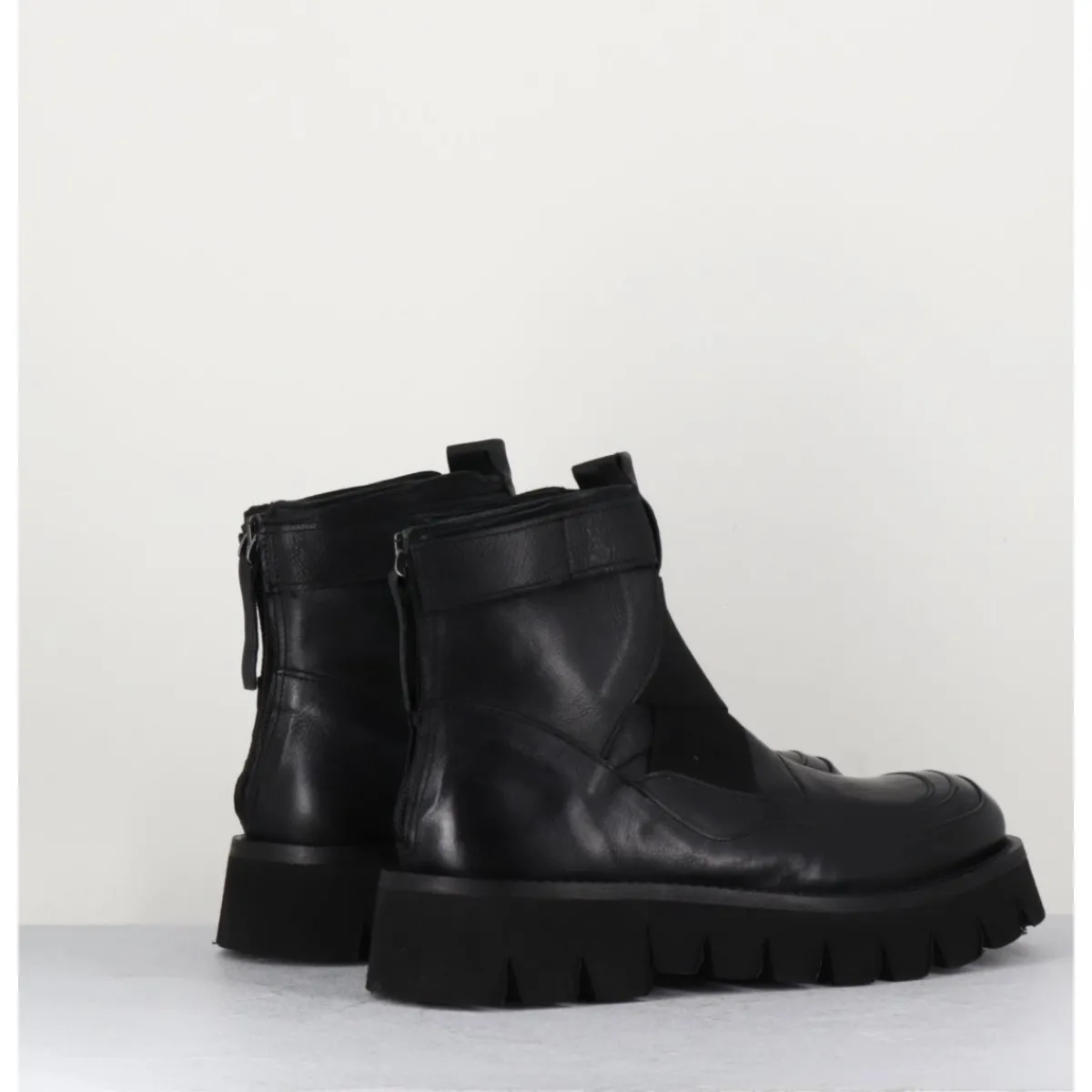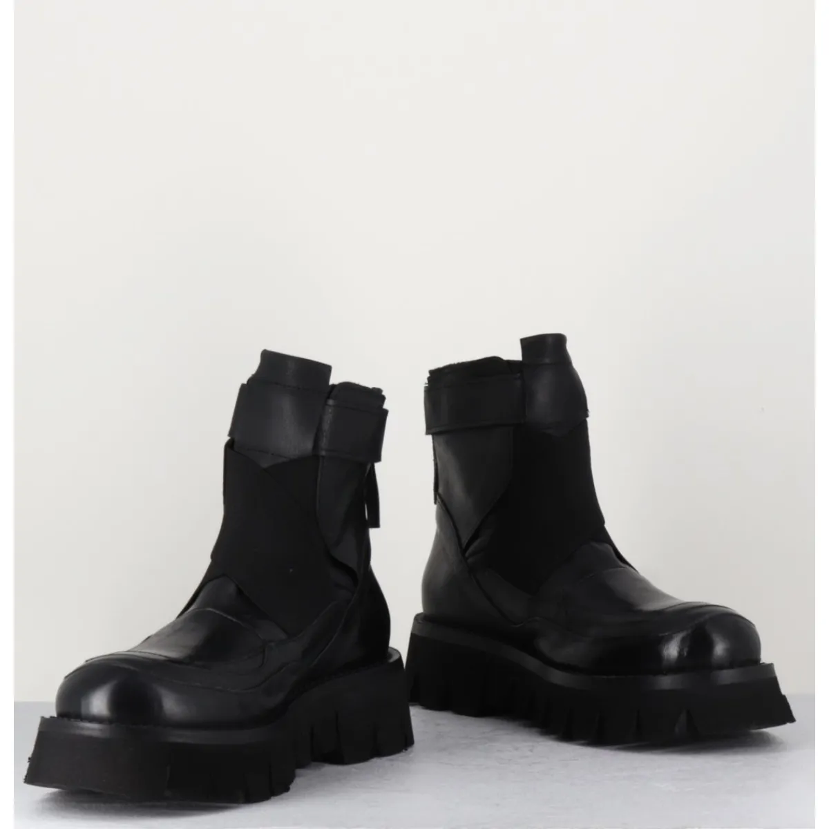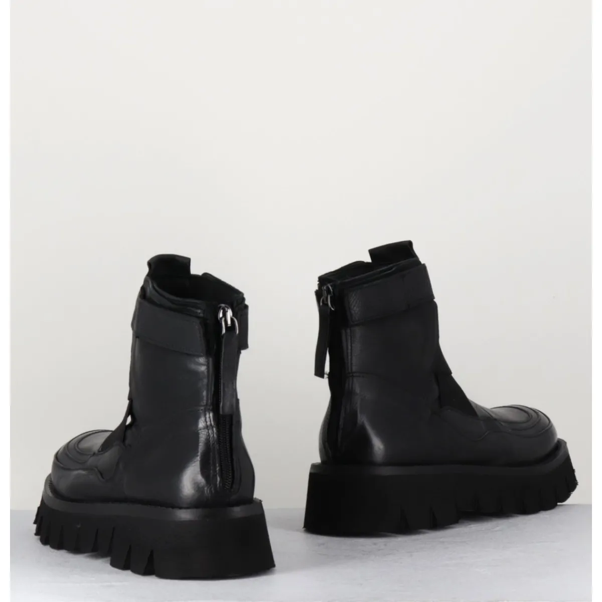 Boots en cuir très souple noir, bout rond, élastiques croisés sur le coup de pieds, bride à scratch sur la cheville, zip arrière, montées sur une semelle épaisse crantée en micro-fibre extra légère.