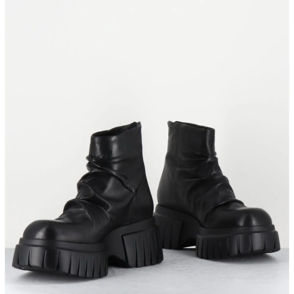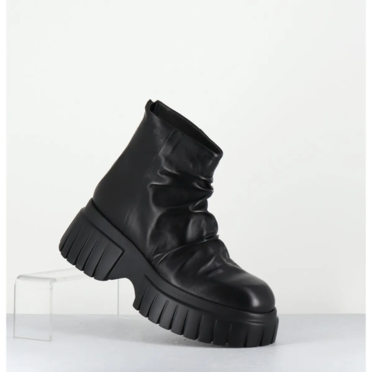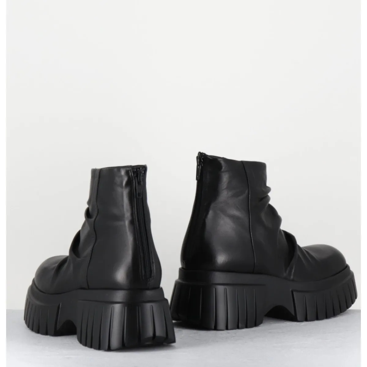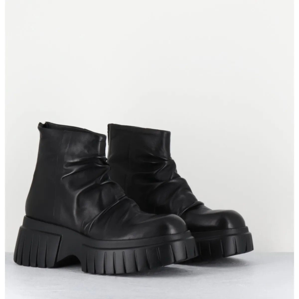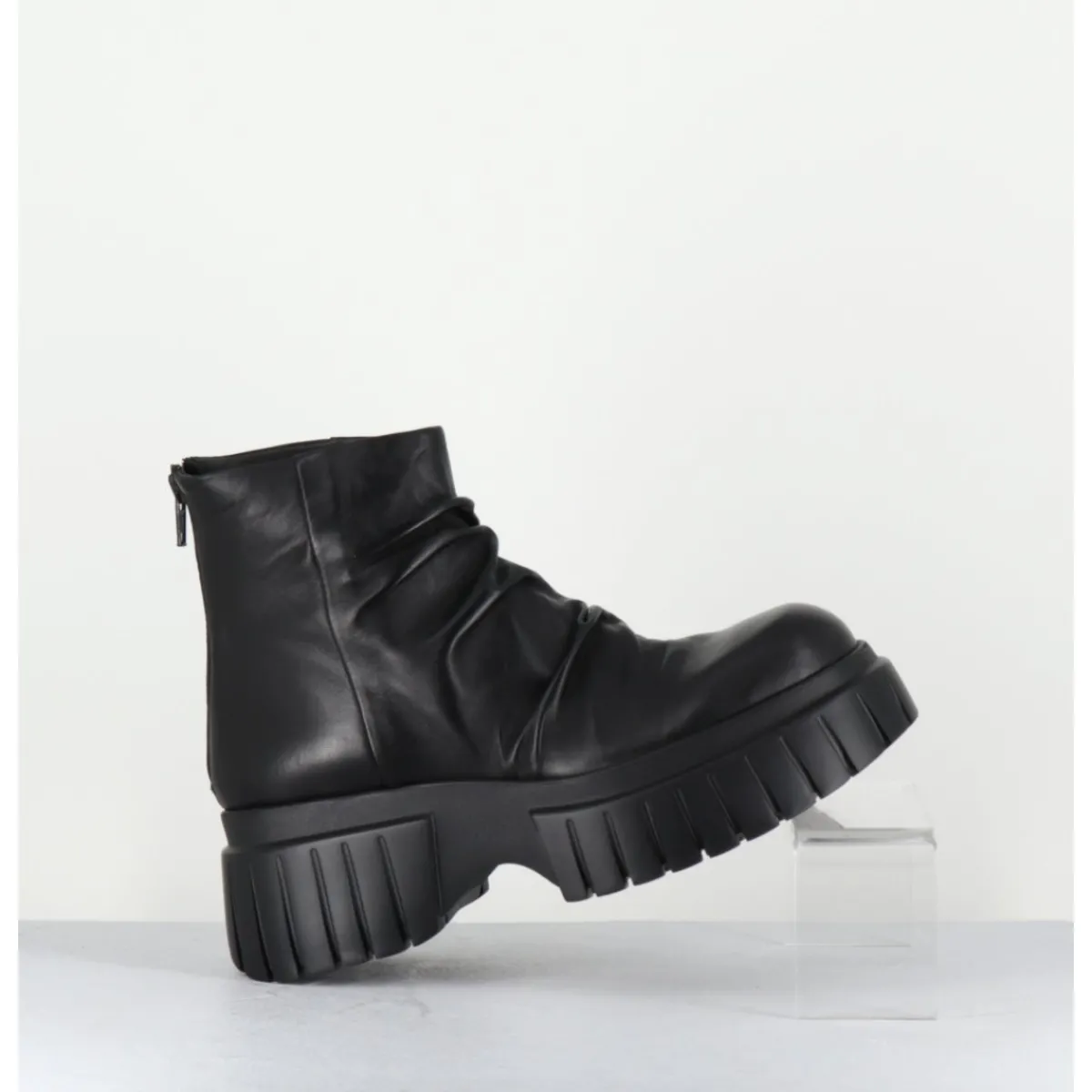 Boots tige courte en cuir noir ultra souple effet plissé, zip arrière, montées sur une semelle épaisse légère en gomme crantée