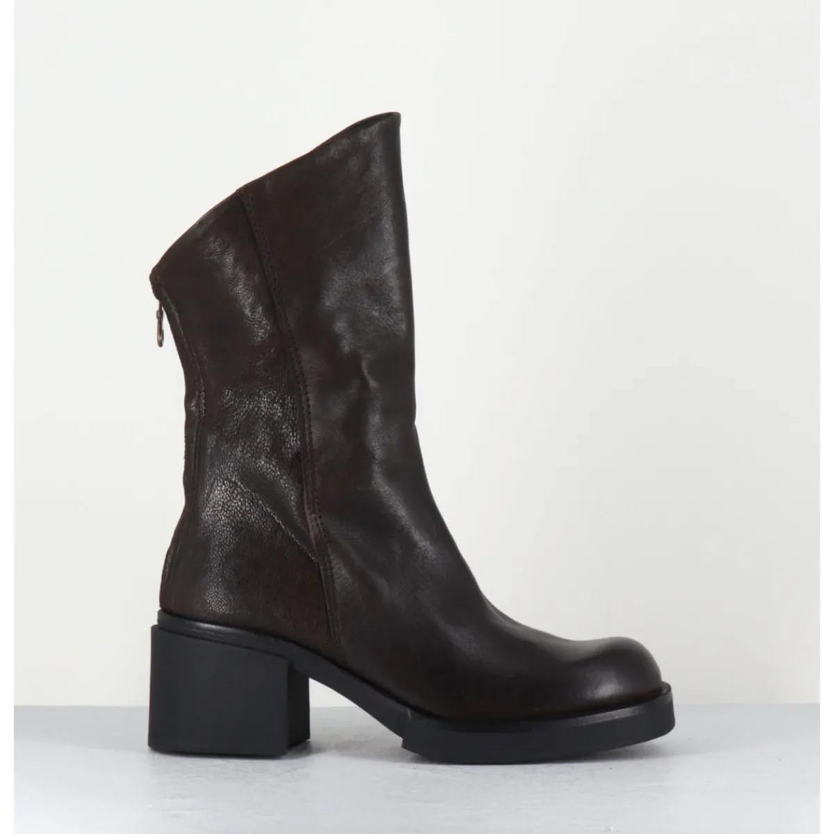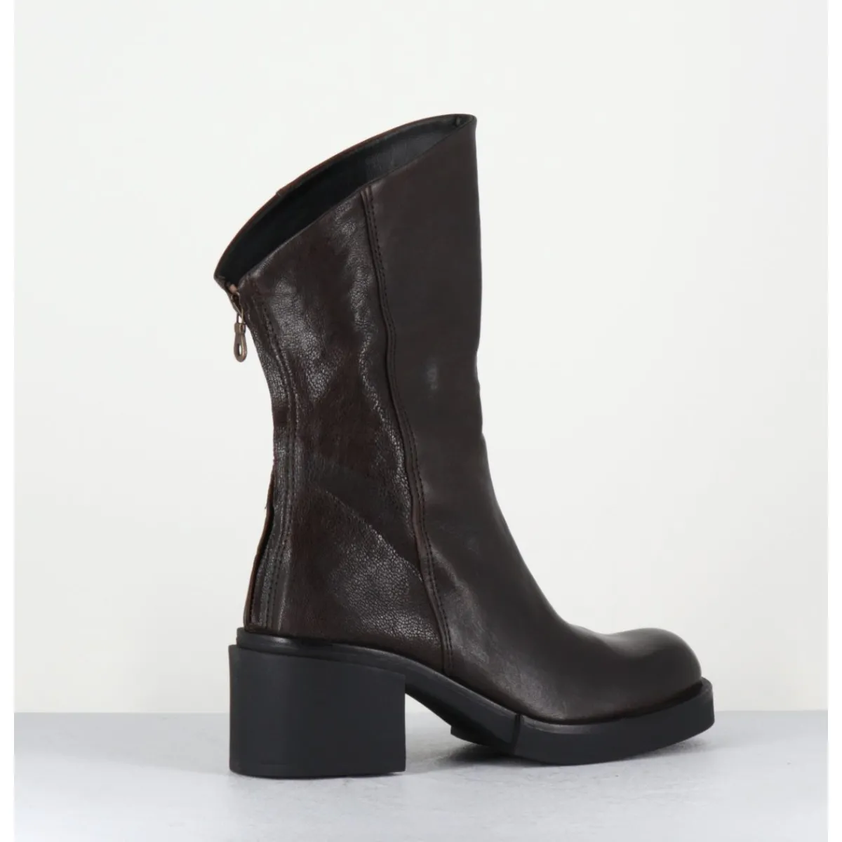 Boots esprit biker en cuir grainé marron effet froissé sur la jambe, tige mis-haute à découpe asymétrique, zip arrière, montées sur une semelle en gomme ultra légère et un talon bloc confortable