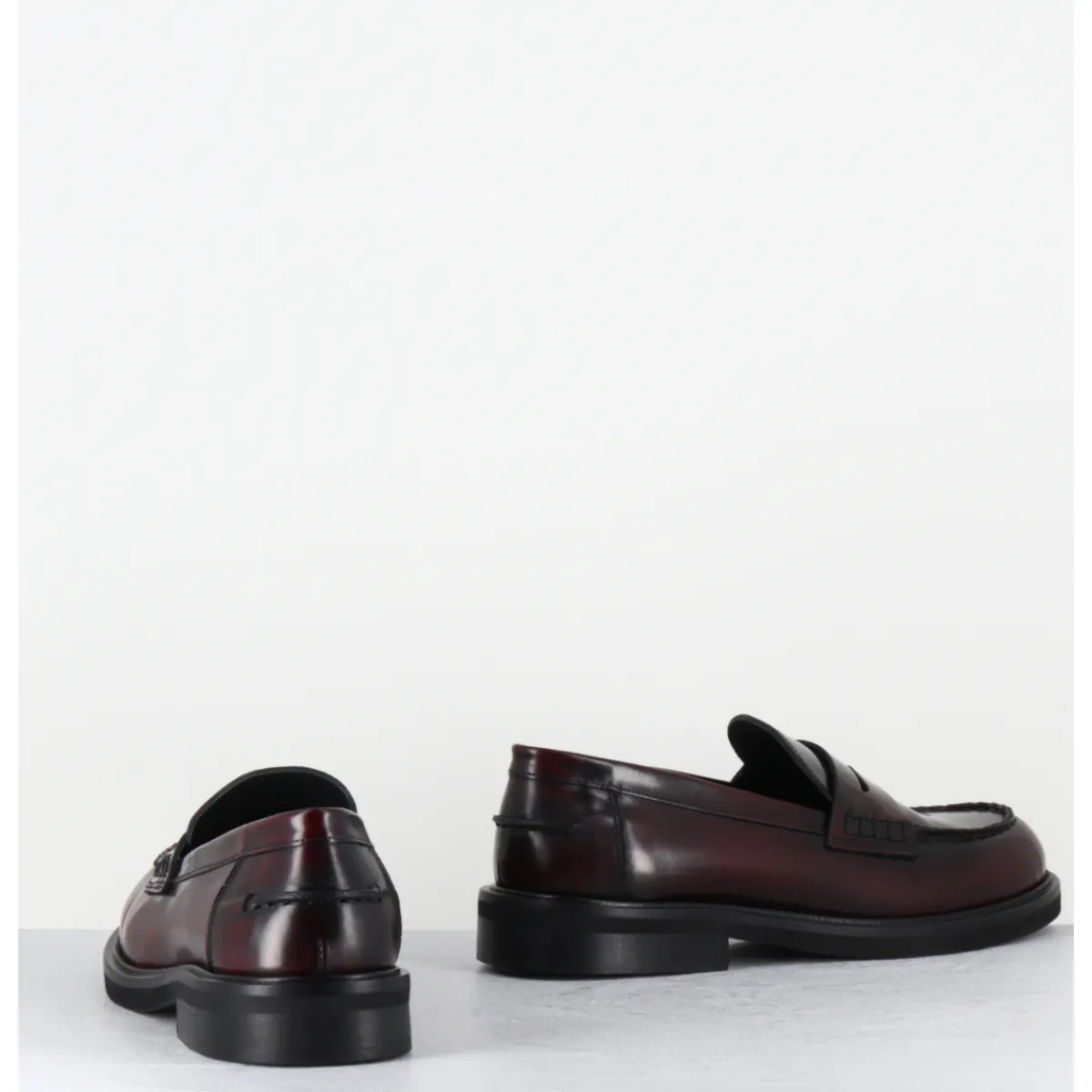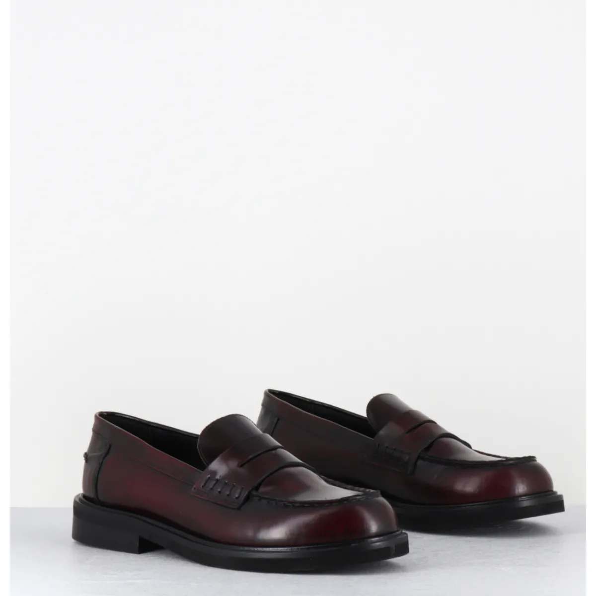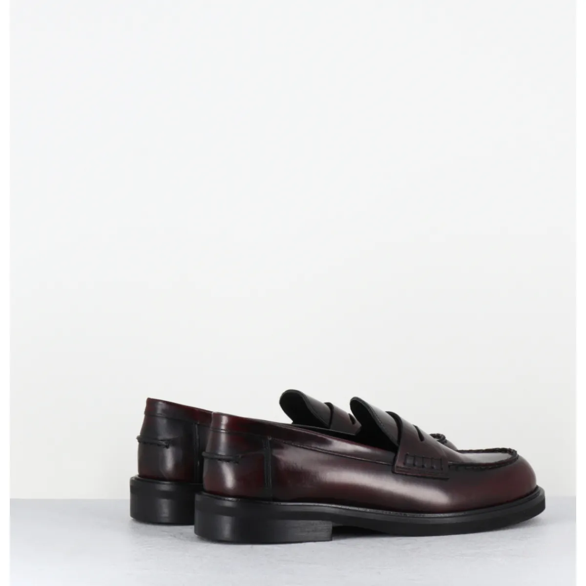 Mocassins plats en cuir bordeaux légèrement glacé, bout rond esprit collège, montés sur une semelle légère en gomme