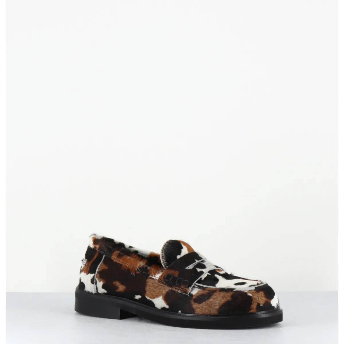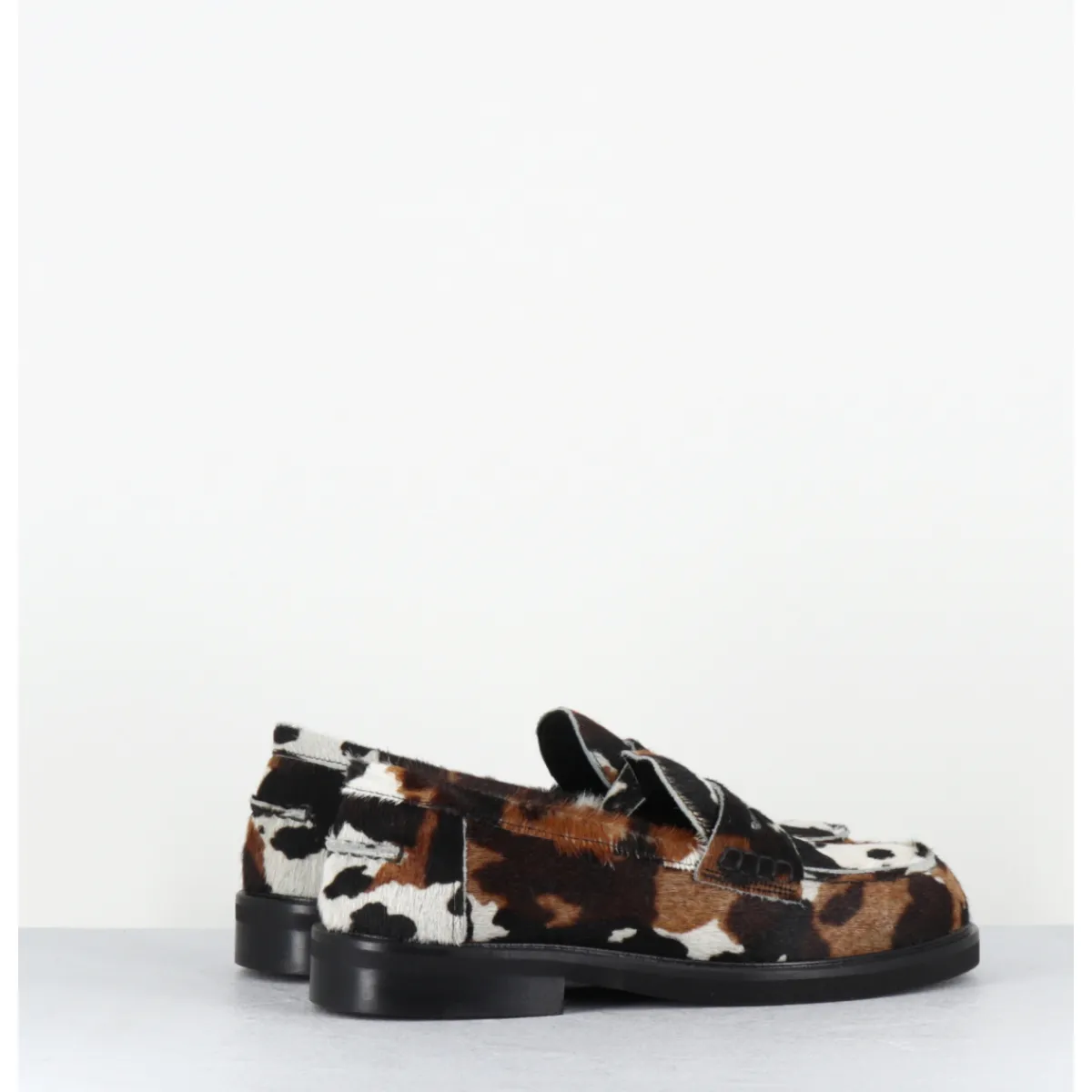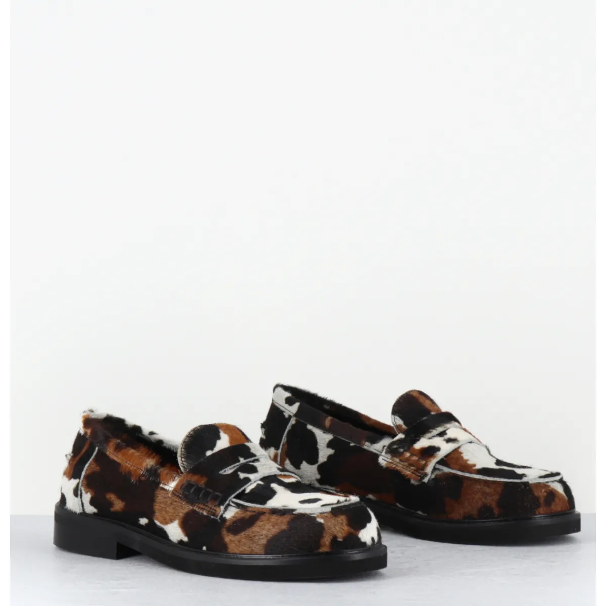 Mocassins plats en cuir poils ‘pony’ imprimé vache, bout rond esprit collège, montés sur une semelle légère en gomme
