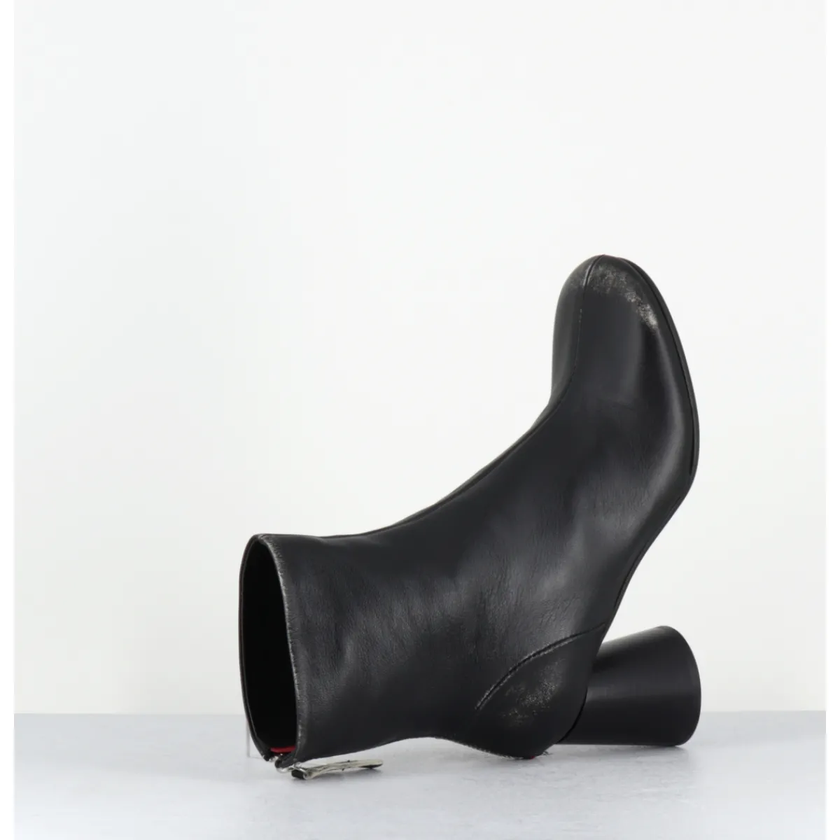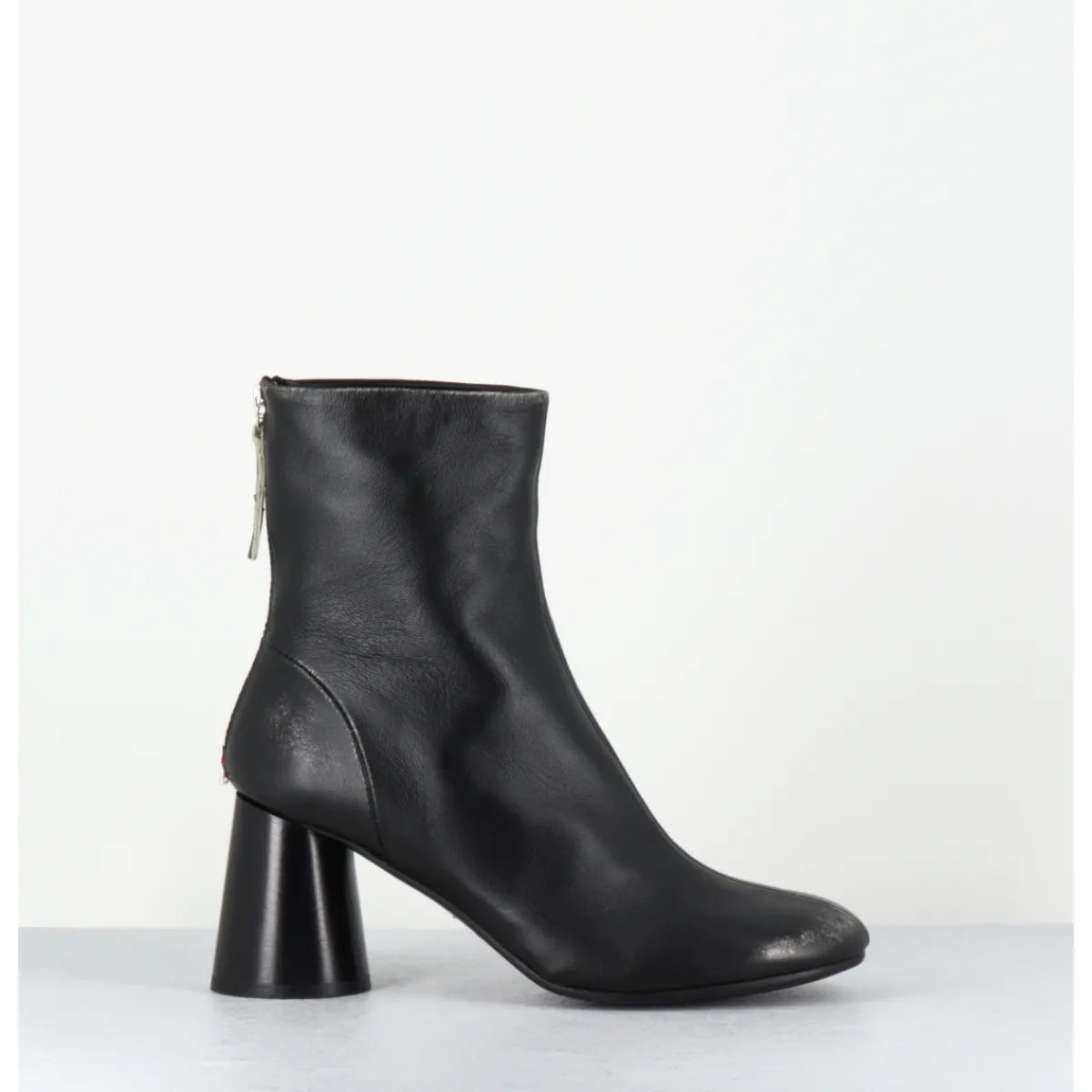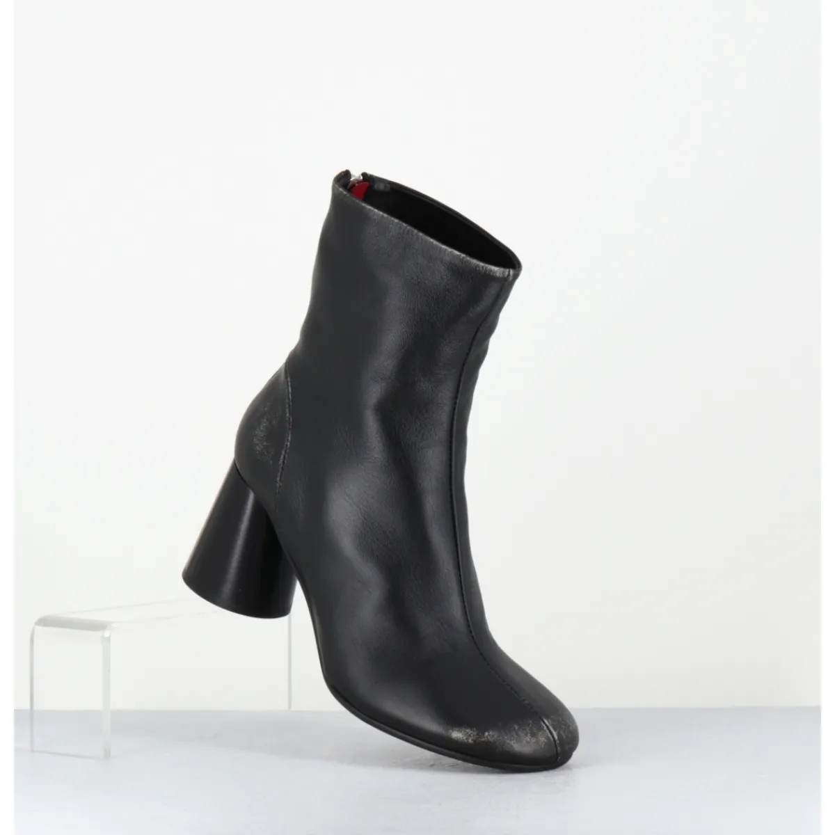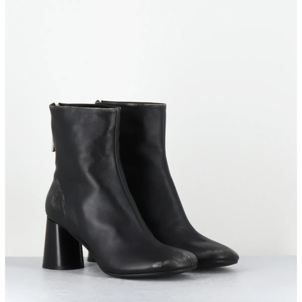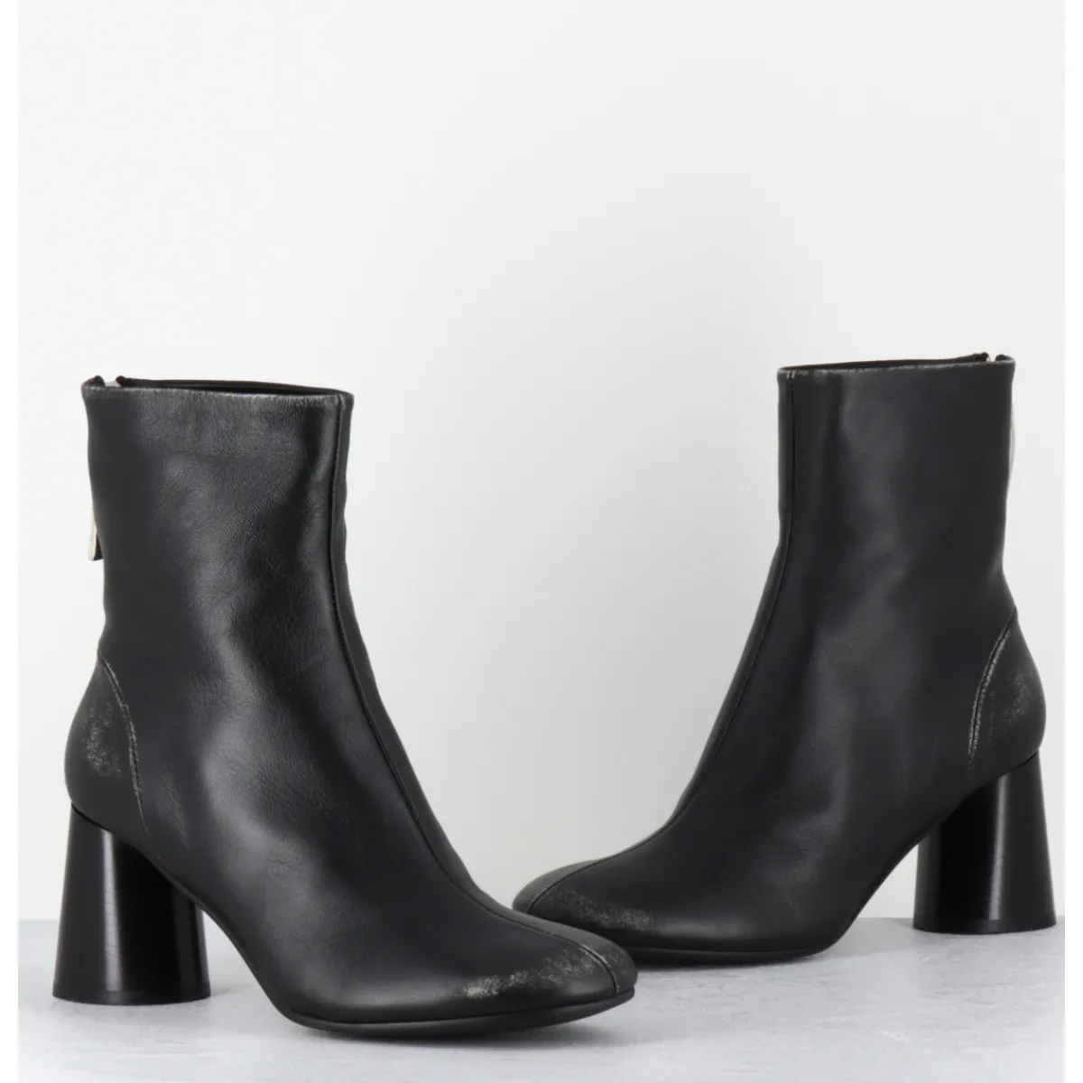 Boots en cuir noir souple brossé pour un effet volontairement ‘usé’, bout rond, zip arrière, couture signature de la maison sur le contrefort, montés sur un talon haut cylindrique peint à la main en noir