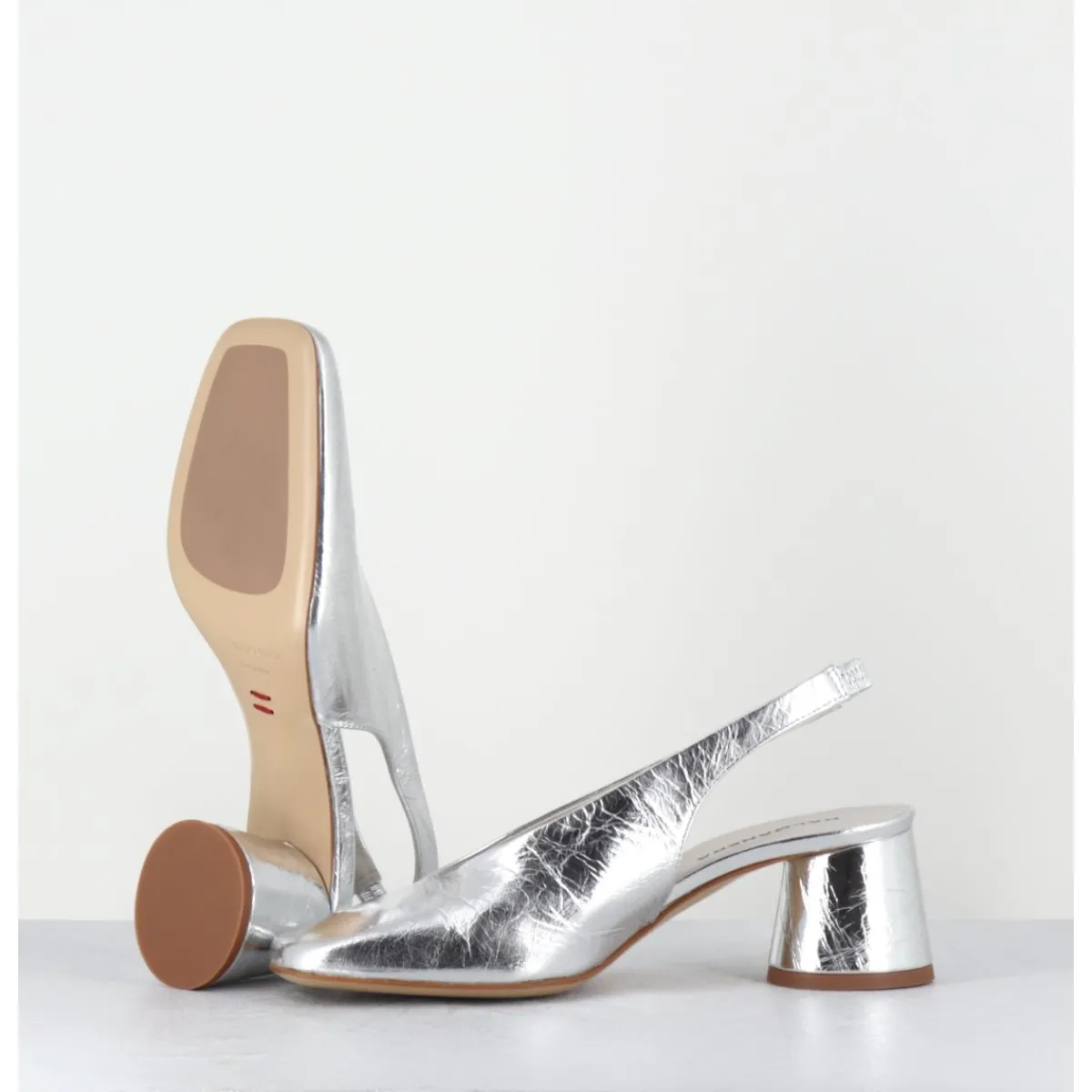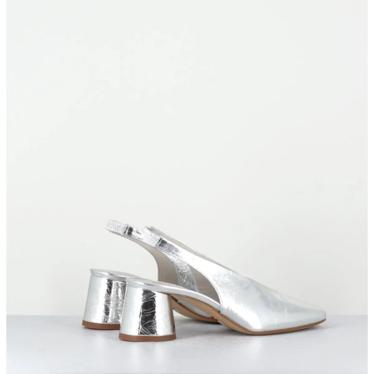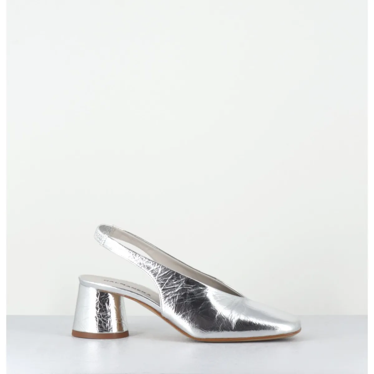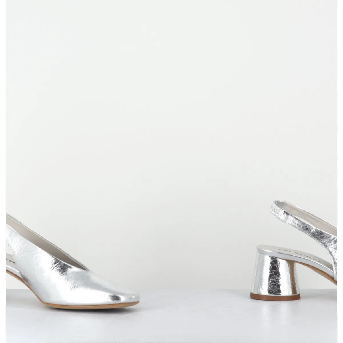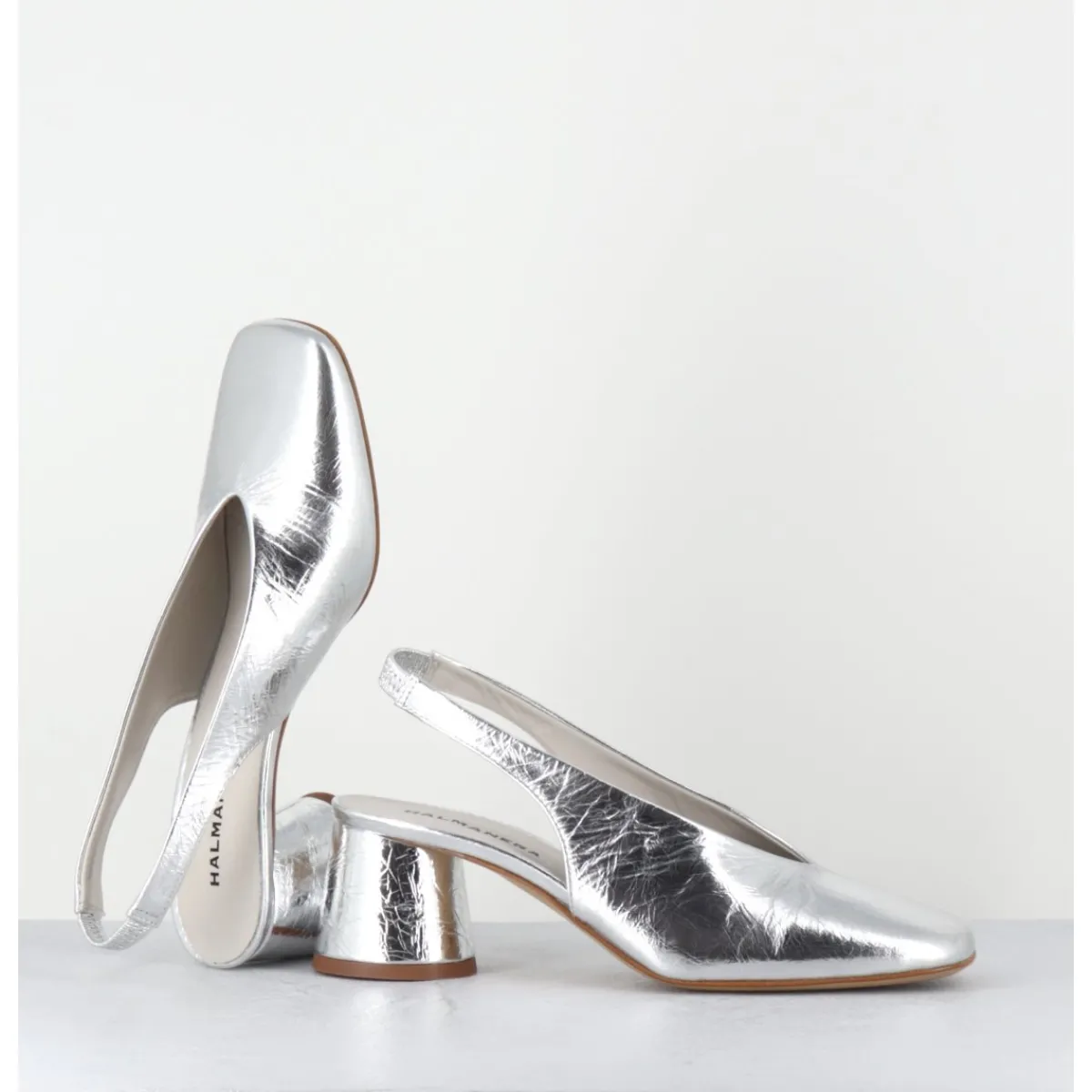 Escparins – slingback en cuir souple métallisé effet légèrement froissé, ligne pure à bout carré doux au look rétro, bride arrière élastiquée pour plus de confort, montés sur un petit talon cylindrique