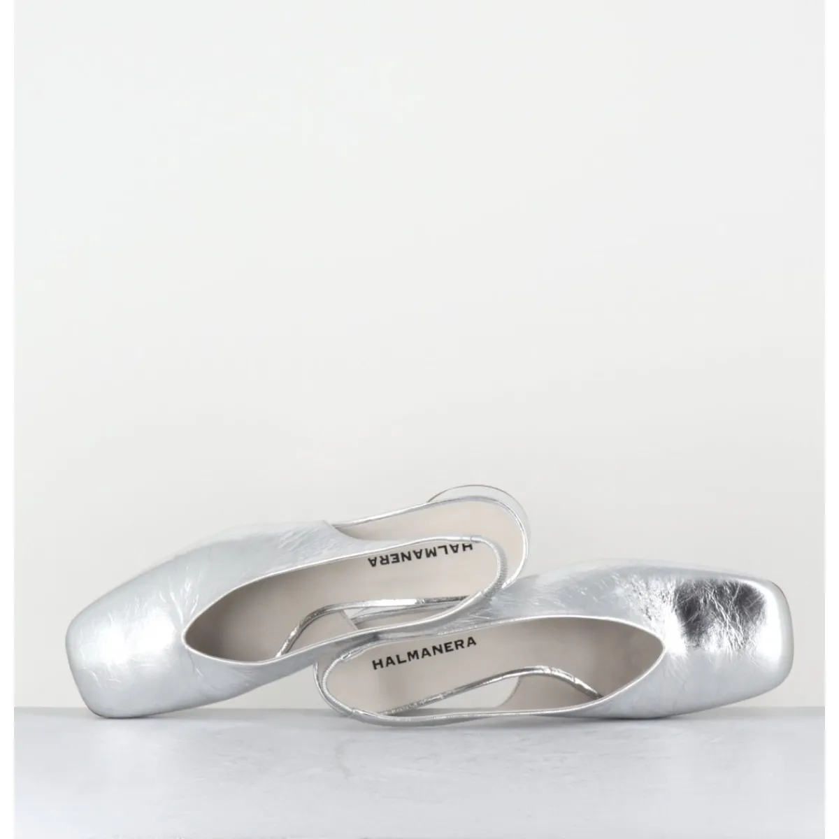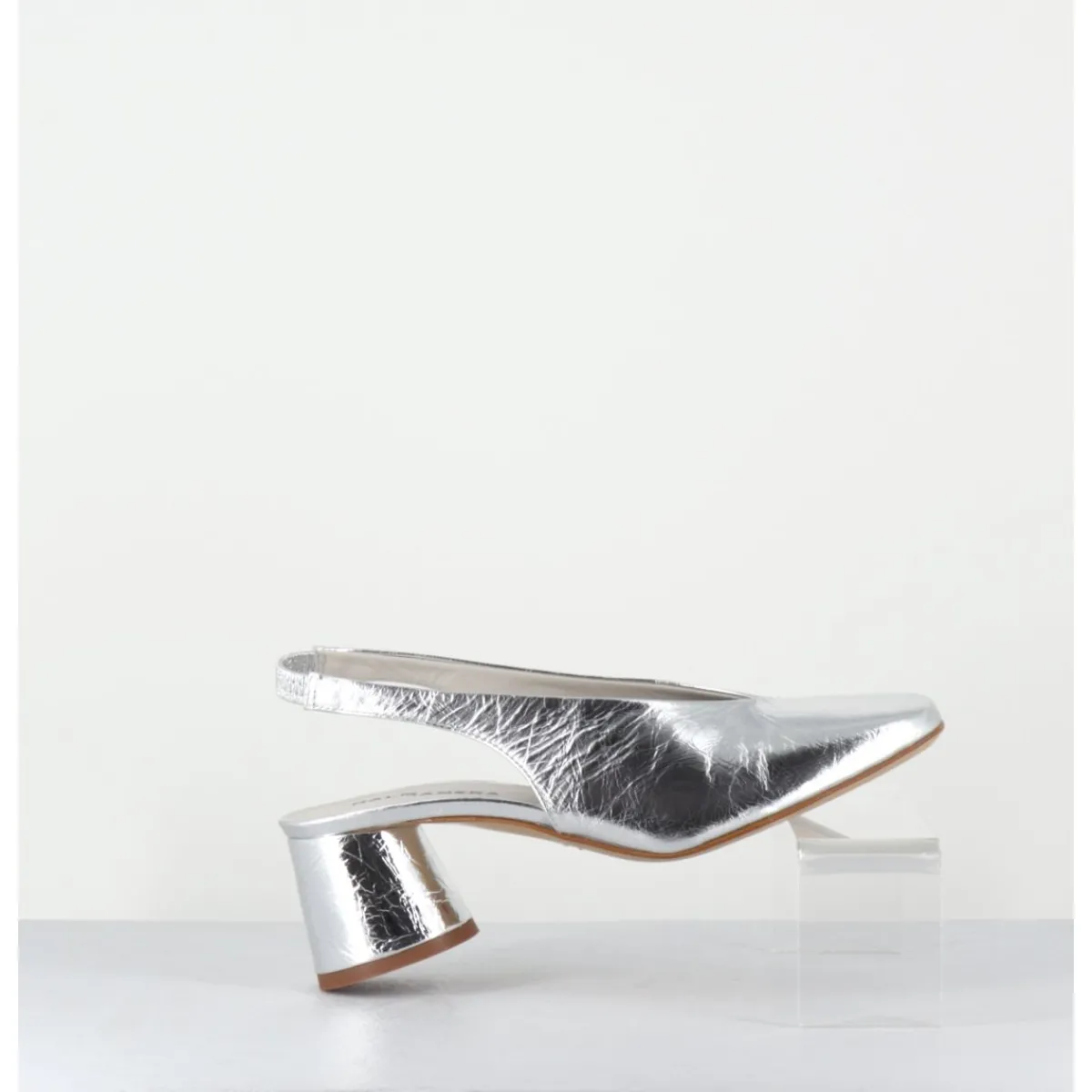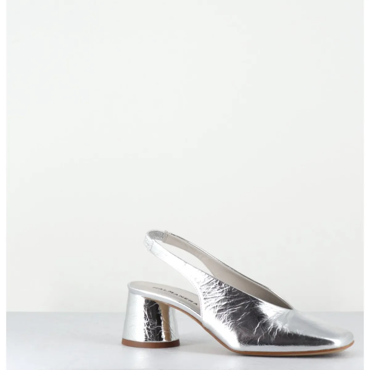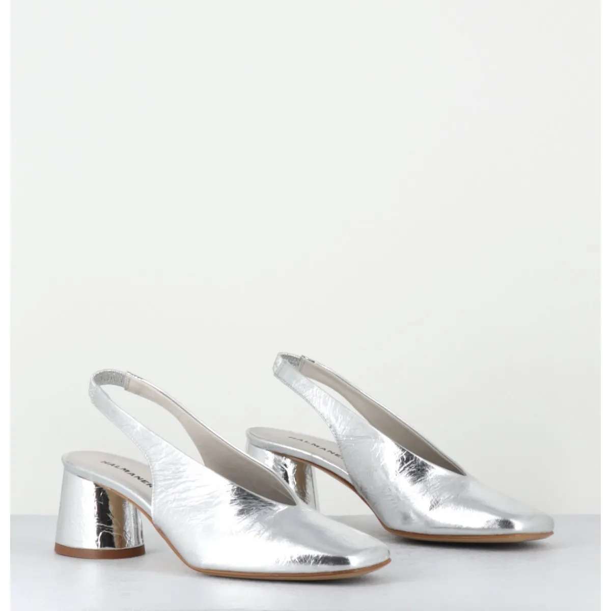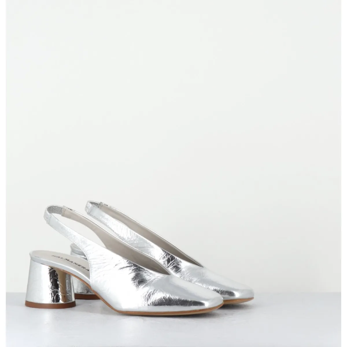 Escparins – slingback en cuir souple métallisé effet légèrement froissé, ligne pure à bout carré doux au look rétro, bride arrière élastiquée pour plus de confort, montés sur un petit talon cylindrique
