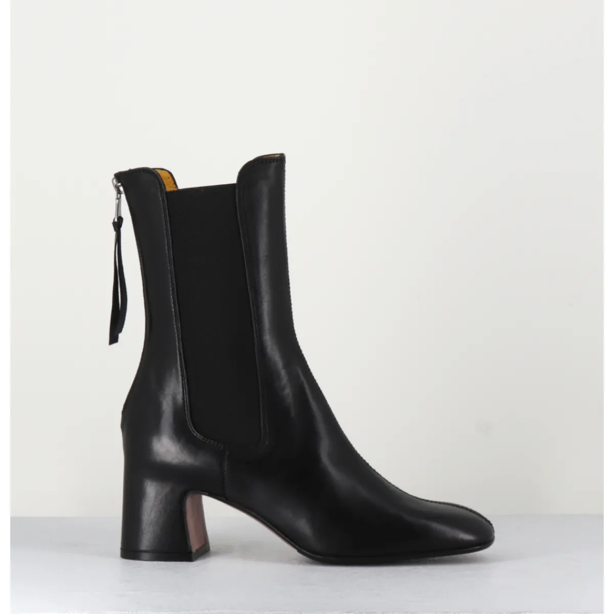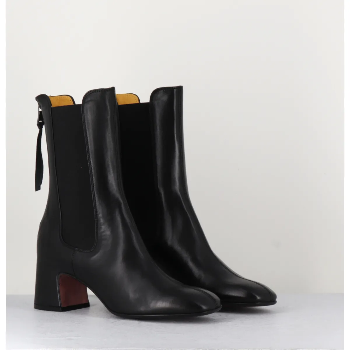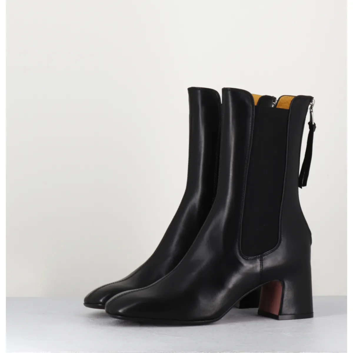Boots en cuir noir extrêmement souple avec élastiques, bout carré doux, zip arrière, montées sur un petit talon carré esprit 70s. Chic & confortable !
