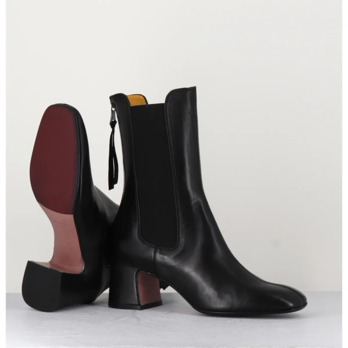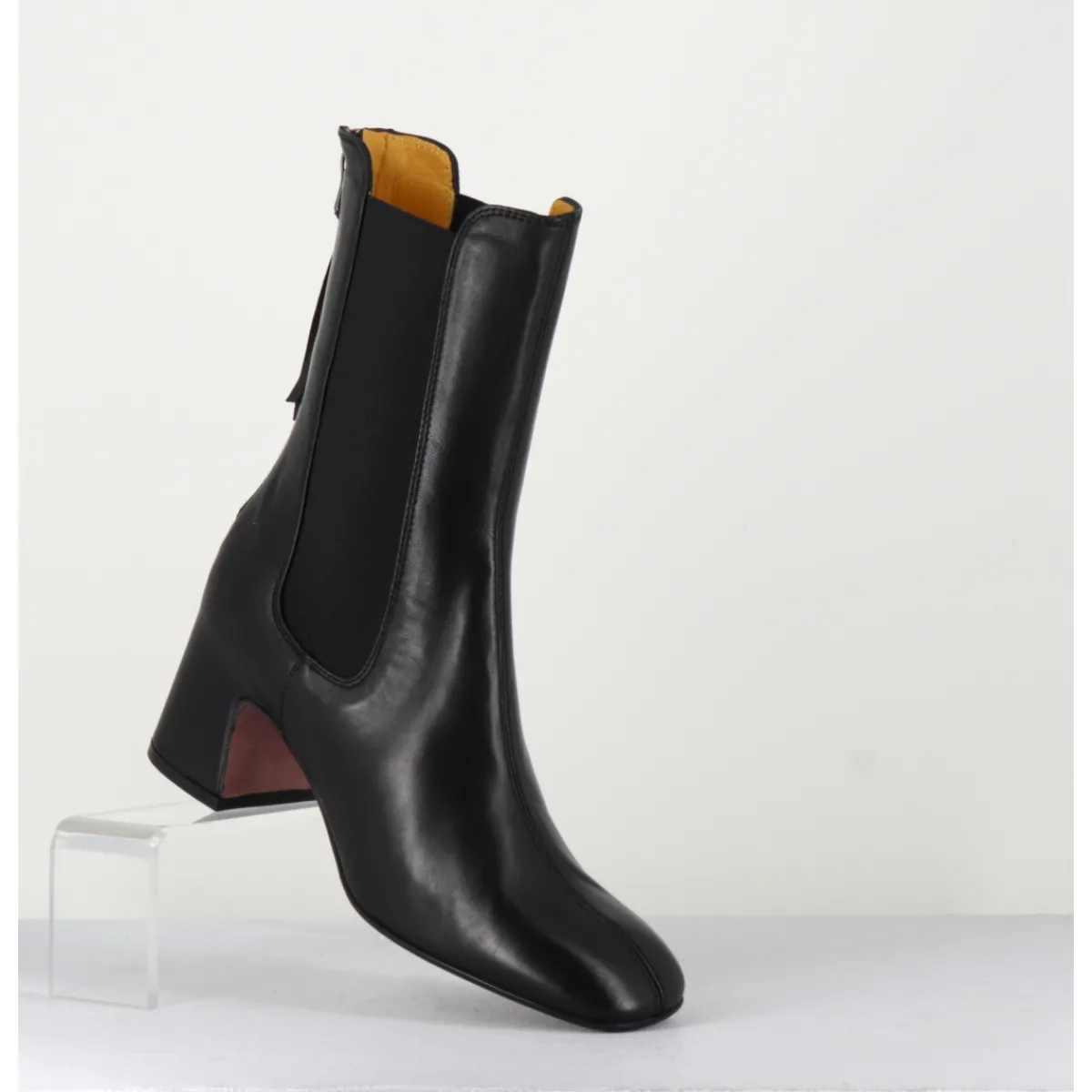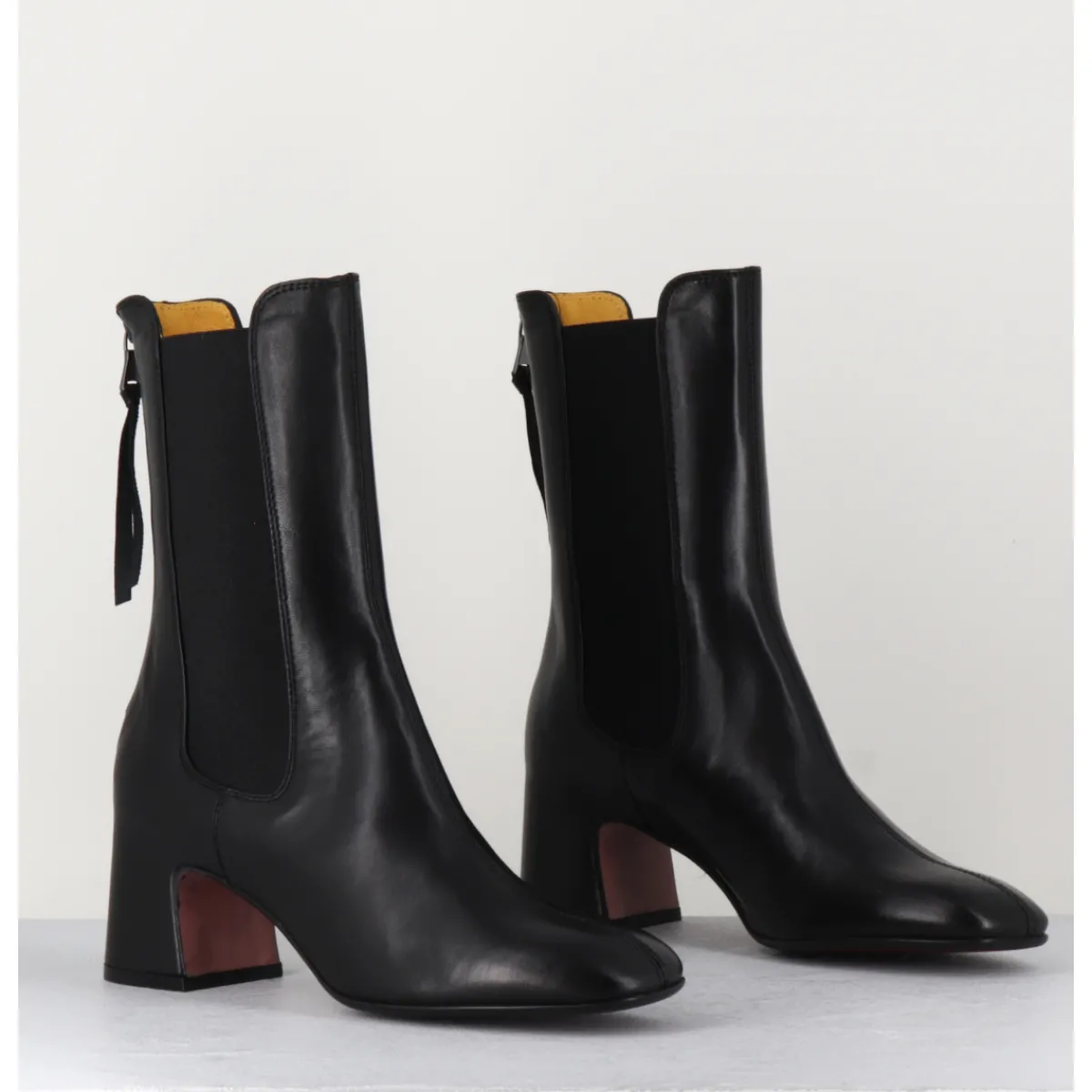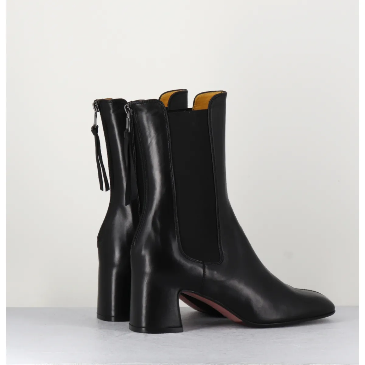 Boots en cuir noir extrêmement souple avec élastiques, bout carré doux, zip arrière, montées sur un petit talon carré esprit 70s. Chic & confortable !