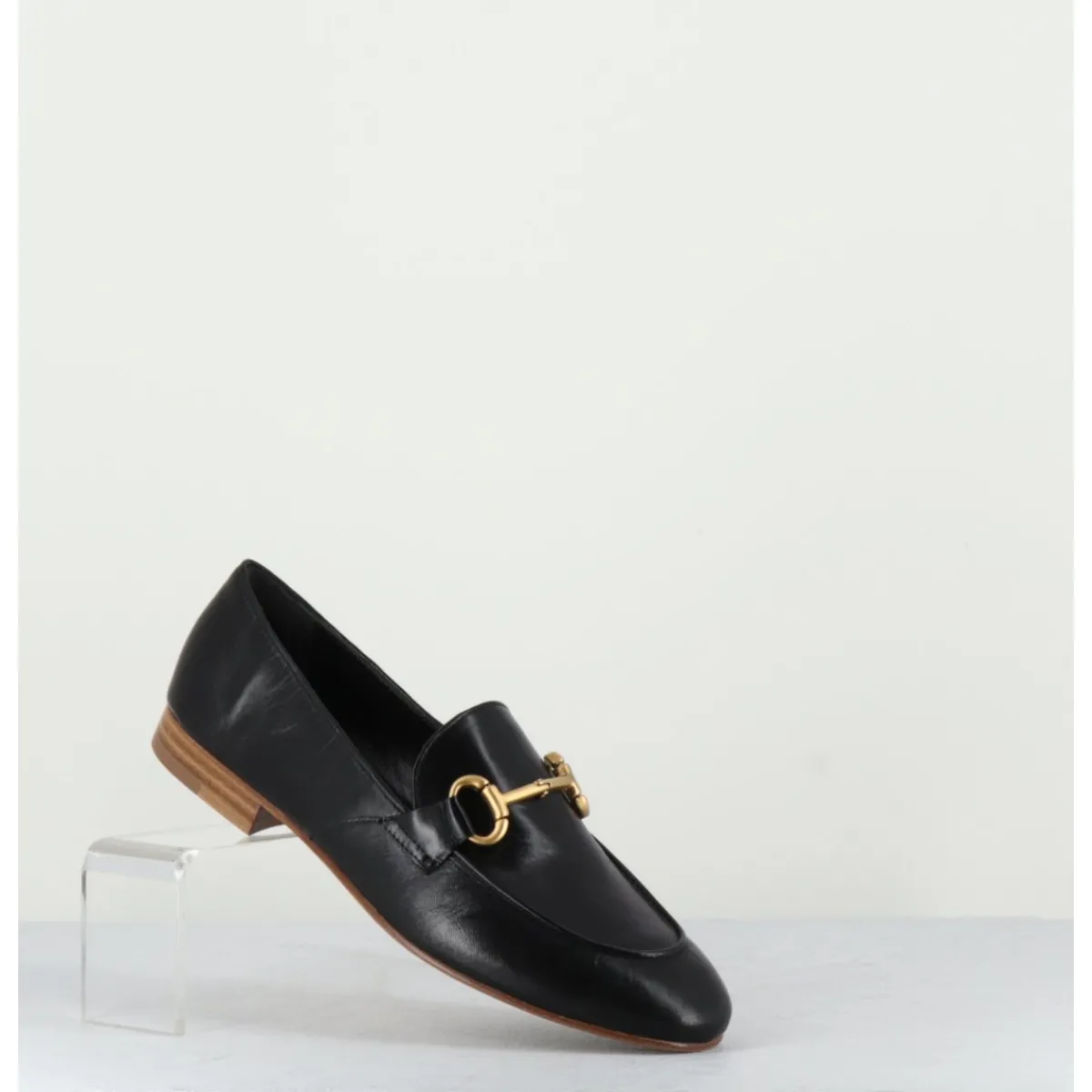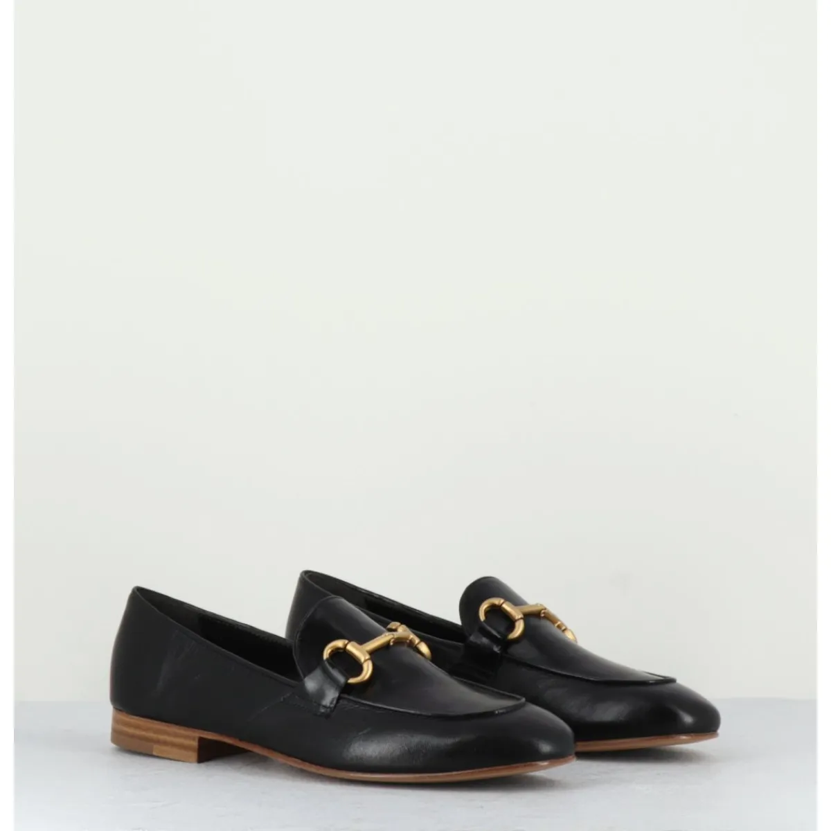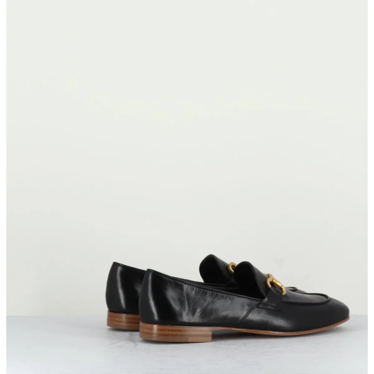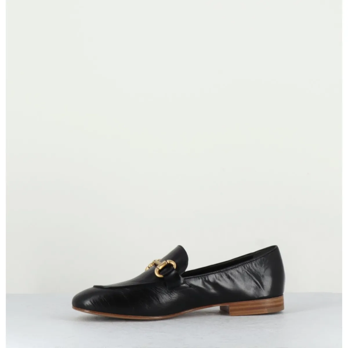 Mocassins plats en cuir noir extrêmement souple avec mors doré mat 70s et bout en amande. Chic & confortable !
