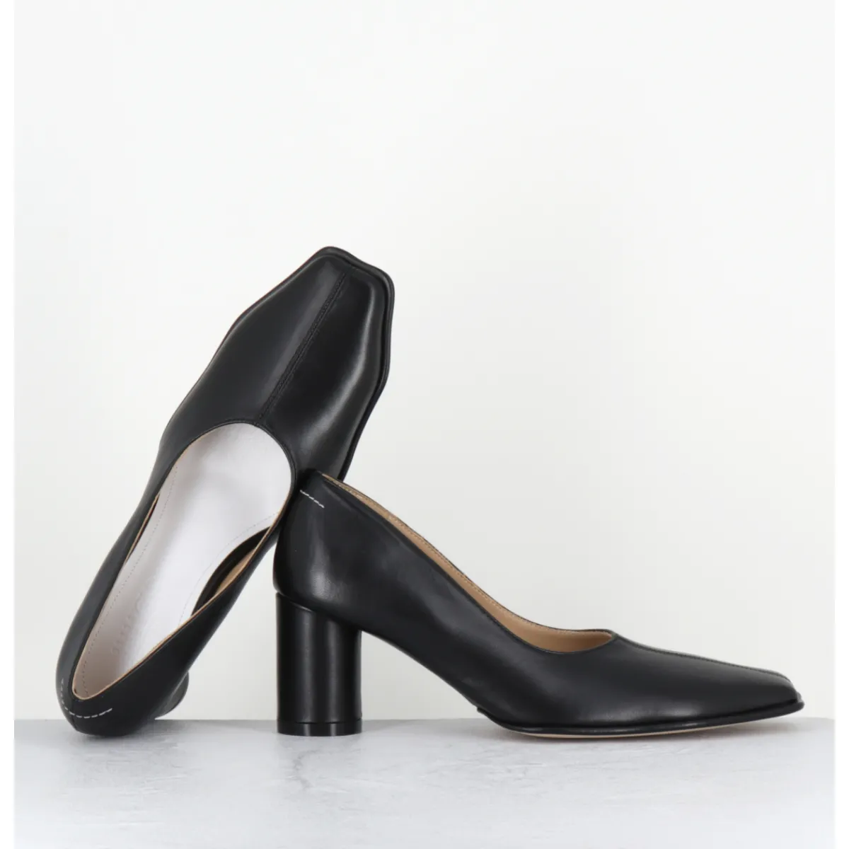 Escarpins en cuir noir, forme exagérée à pointe carrée avec couture centrale accentuant l’effet allongé, dotées du fameux talon cylindrique laqué avec le logo 6 imprimé sur la base et surpiqûres blanches à l’arrière et talo signature de la Maison