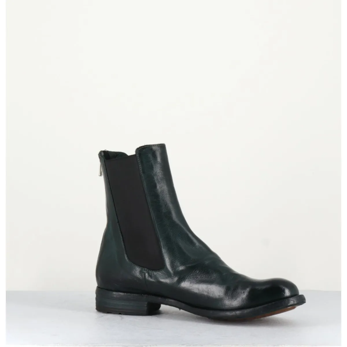 Bottines plates en cuir souple vert à élastique Chelsea et zip arrière, bout en amande, montées sur une semelle flexible cousue main avec insert de gomme