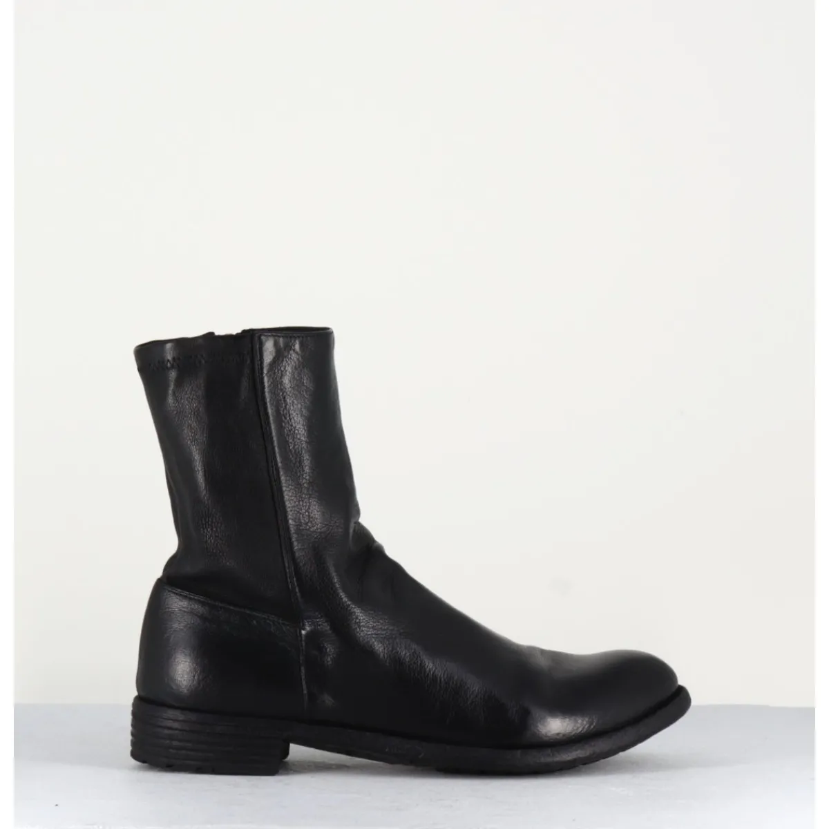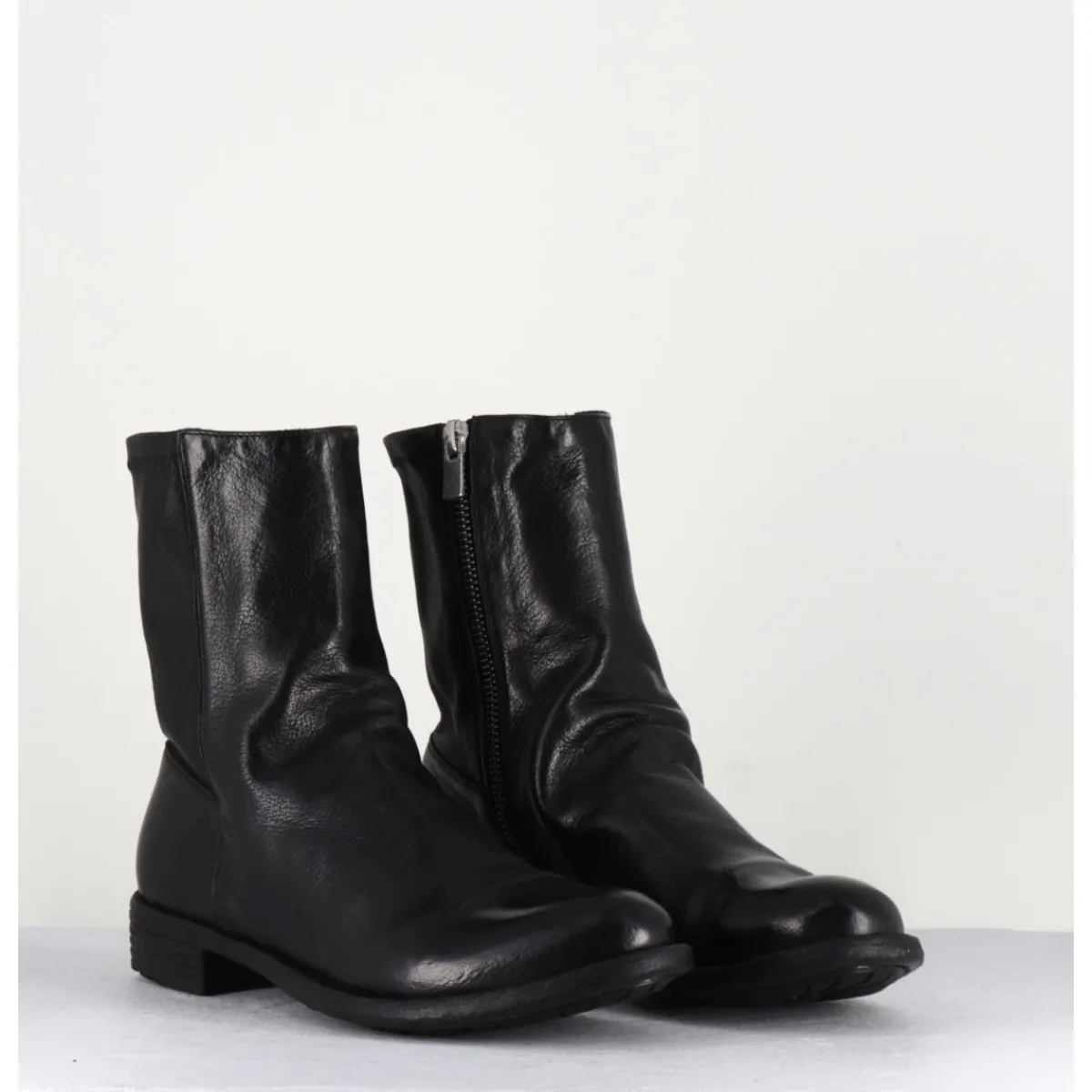 Bottines en cuir souple noir à bout en amande, présentant à l’arrière une partie en cuir stretch galbant élégamment la cheville; fermeture éclaire intérieure, montées sur un petit talon.