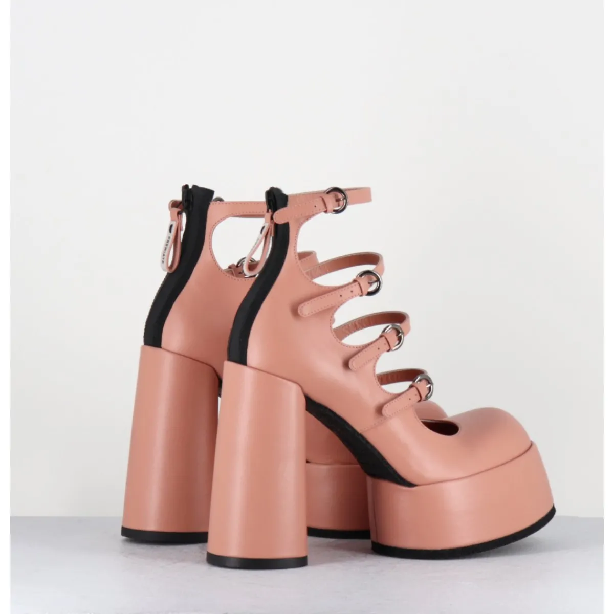 Babies à plateforme en cuir rose poudré, multi-brides réglables, zip arrière, forme ronde légèrement évasée, montées sur un large talon haut