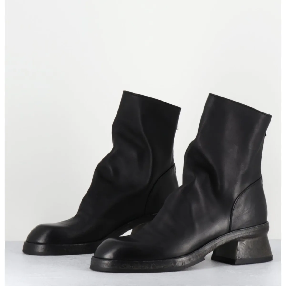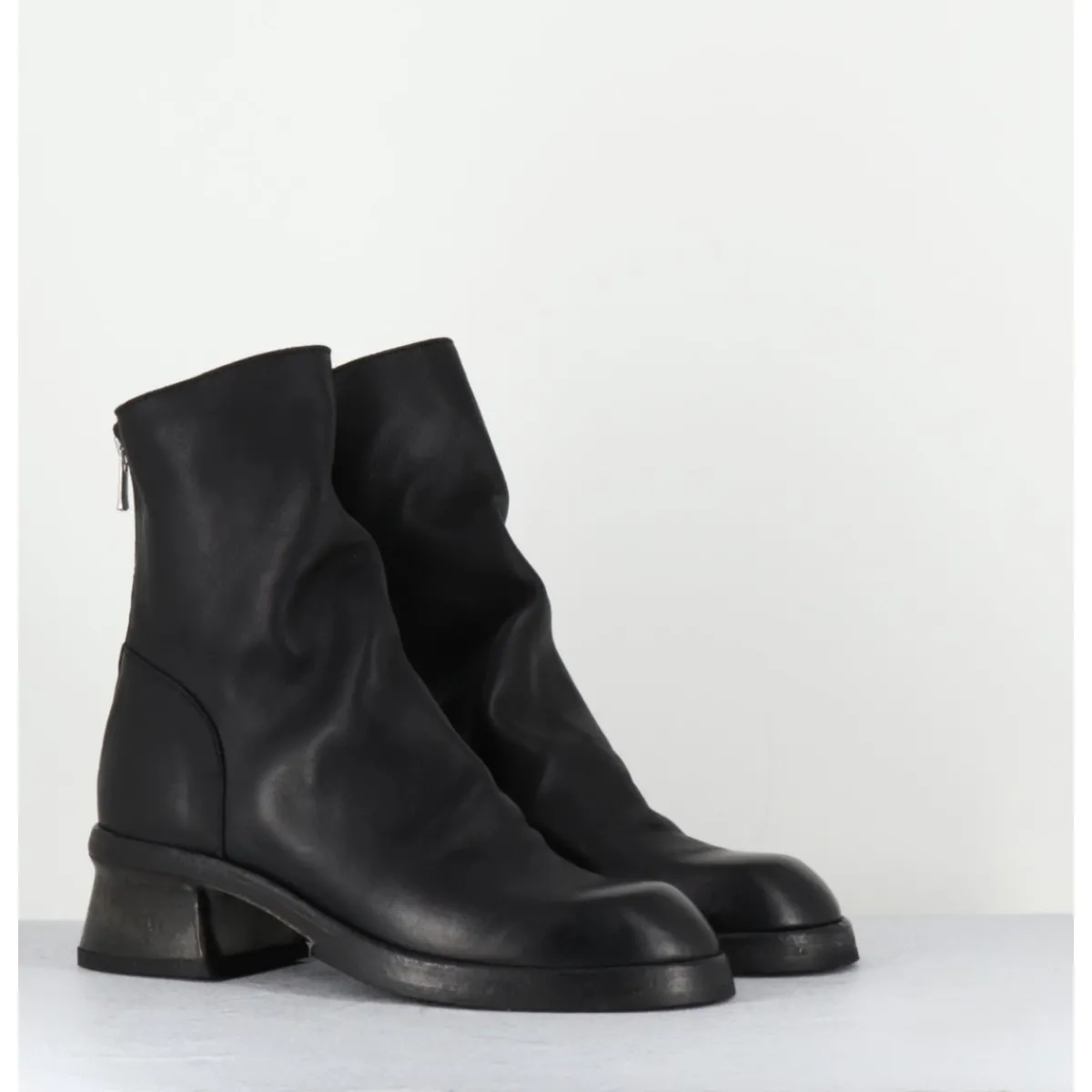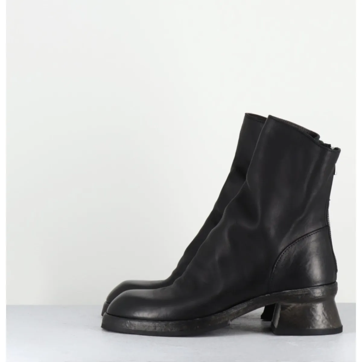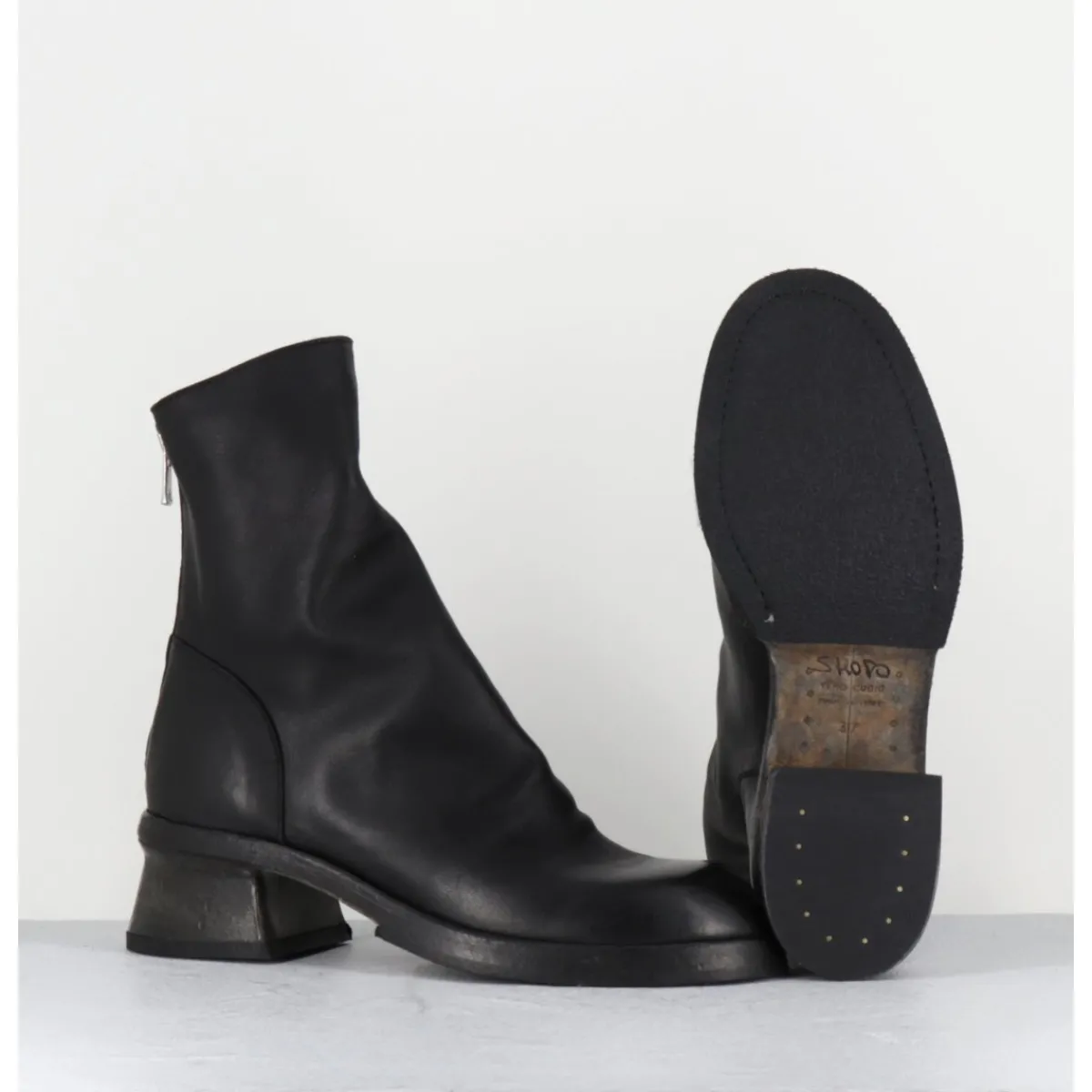 Boots en cuir noir souple lavé à la main pour un effet vintage « usé » sur la semelle, zip arrière, montées sur une double semelle cousue intégral et un petit talon légèrement déstructuré