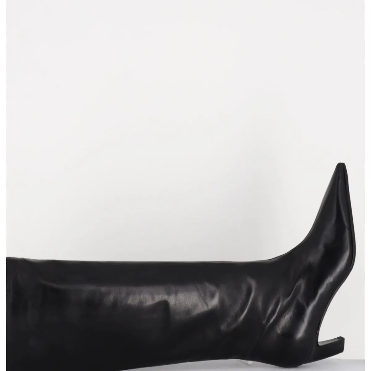 Bottes en cuir noir souple, bout pointu, ligne pure à tige droite qui s’enfile, montées sur un petit talon légèrement incurvé