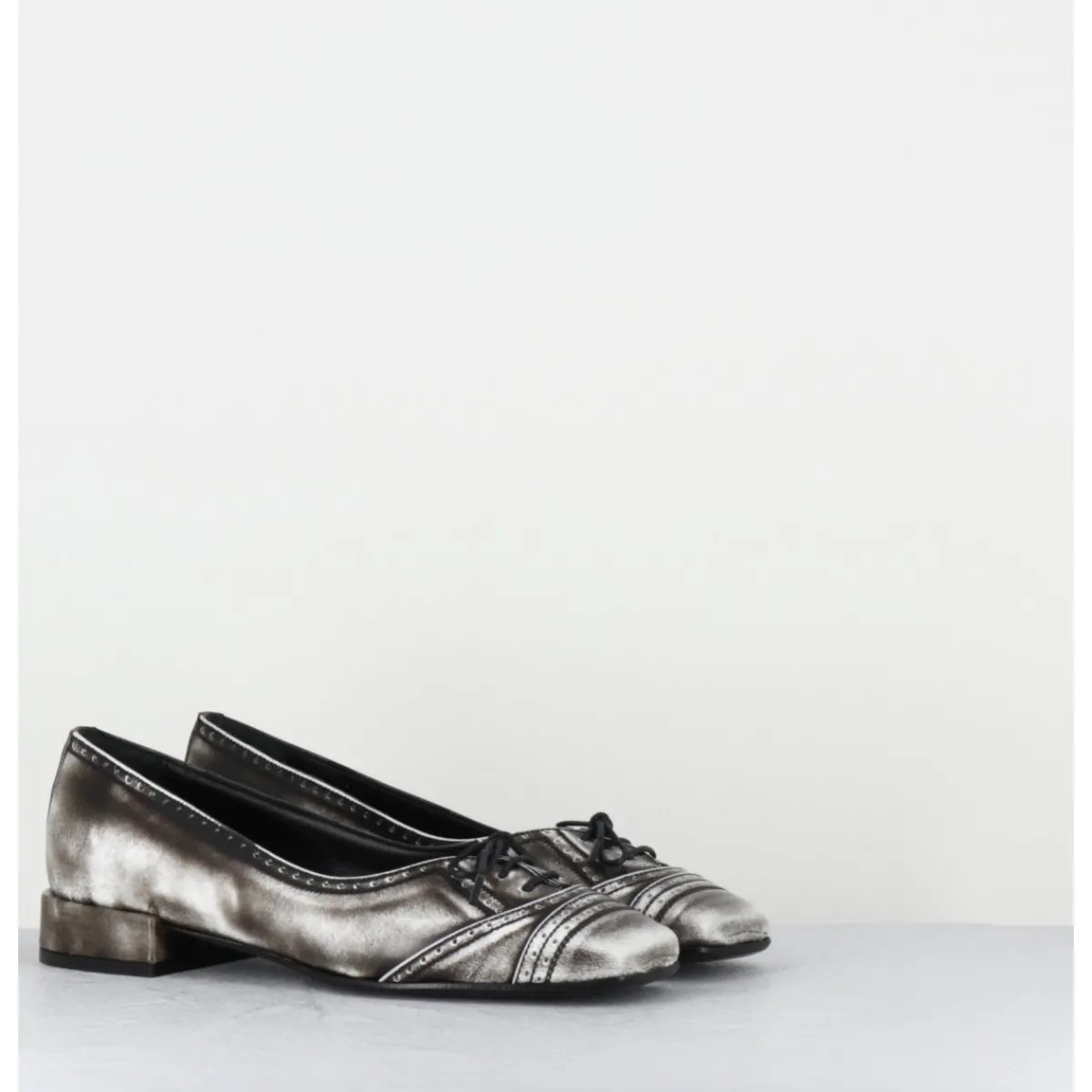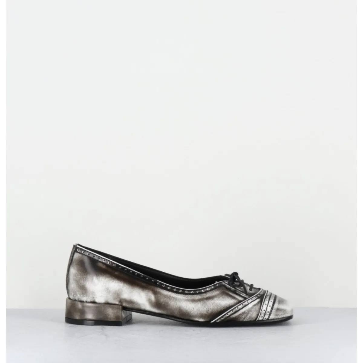 Ballerines en cuir glacé effet vintage noir et blanc, surpiqures trompe l’oeil et petit lacets à l’avant, montées sur un petit talon carré
