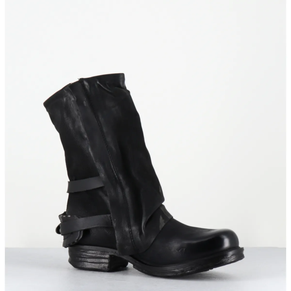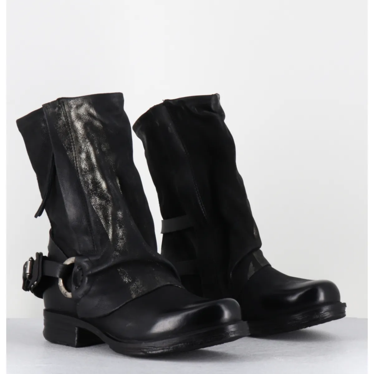 Boots bikers en cuir gras noir patiné pour un effet ‘vintage’ avec détails dorés, double zip, sangle réglable à l’arrière et empiècement volontairement froissé à l’avant. Ligne avant-gardiste, iconique de la Maison