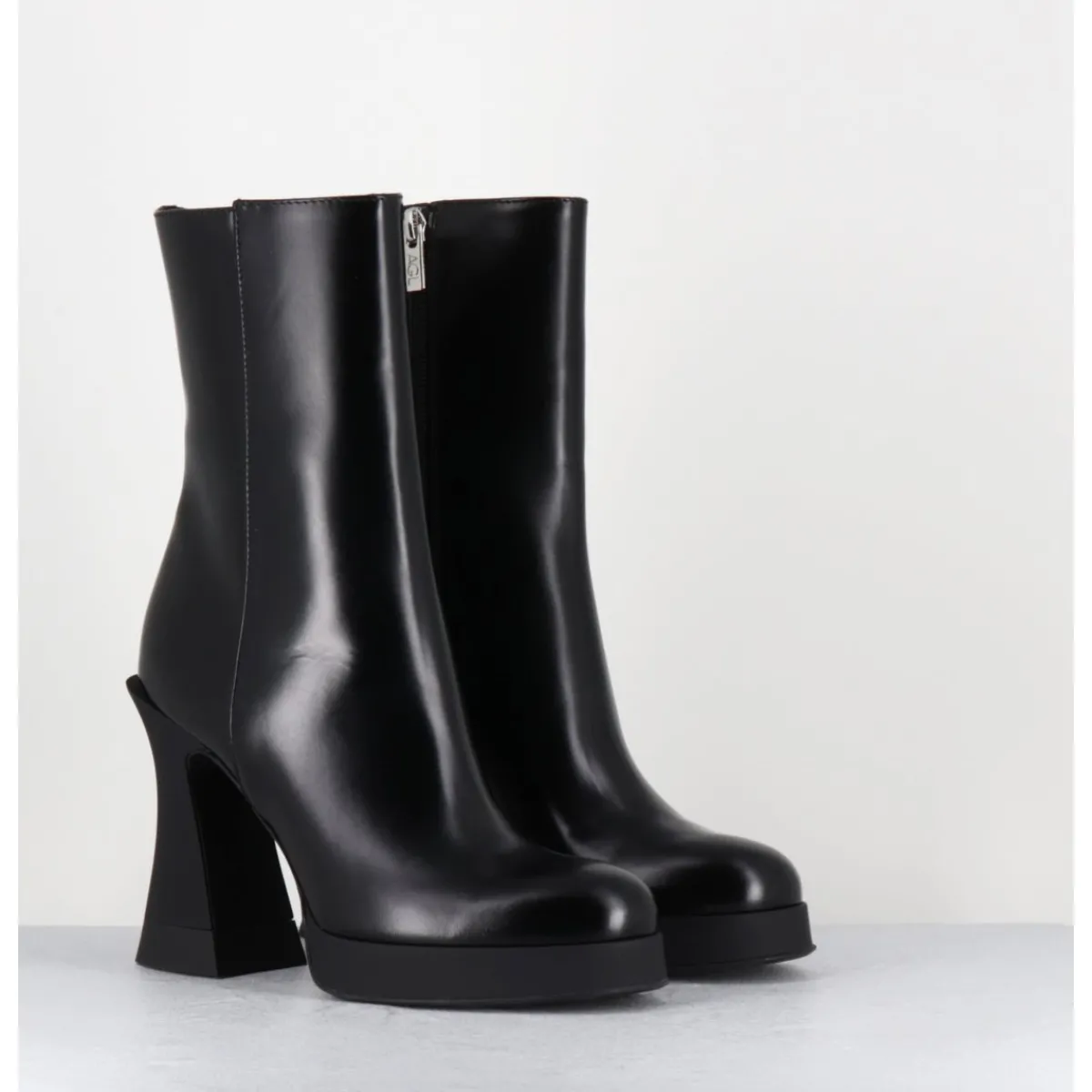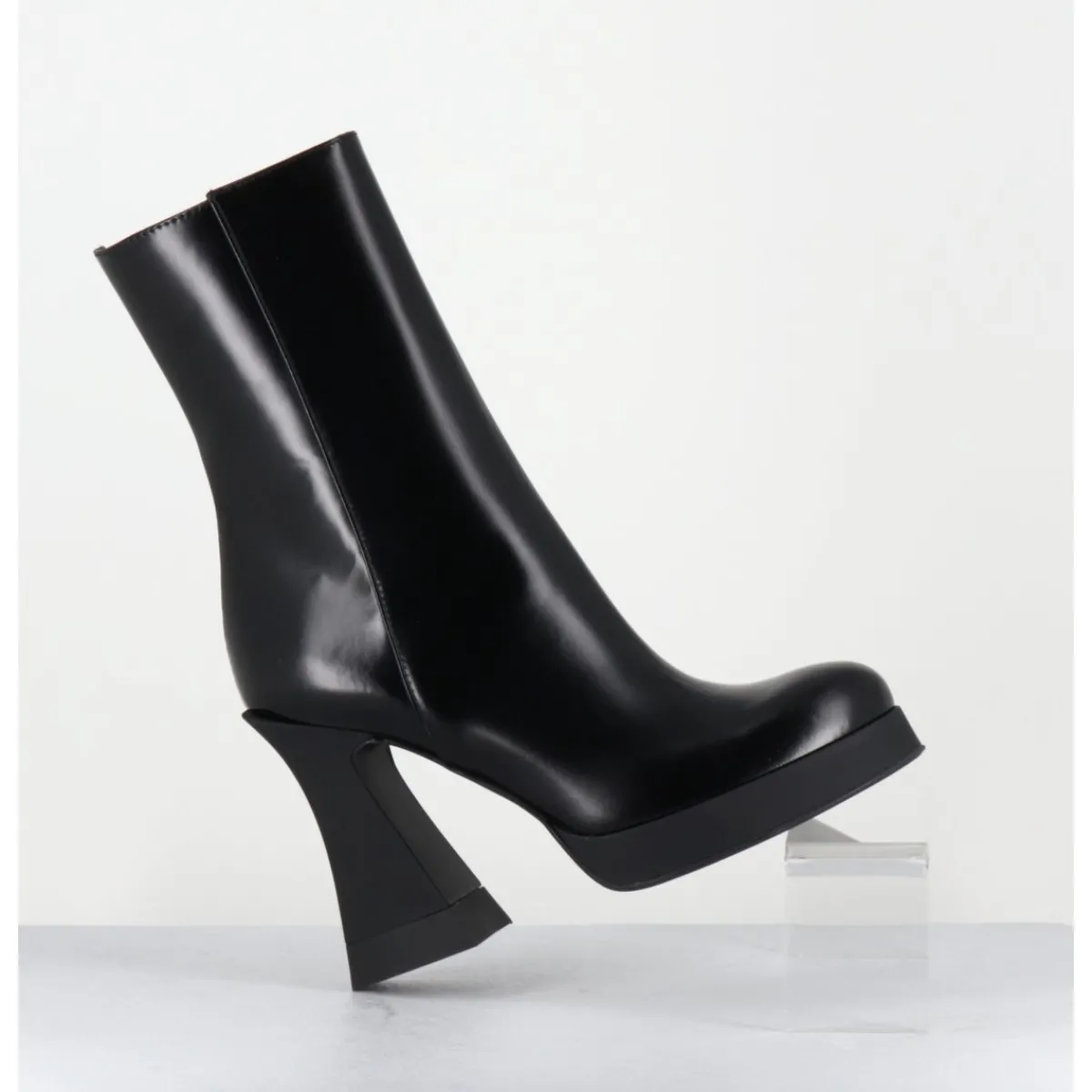 Boots en cuir noir légèrement glacé, montées sur une fine plateforme et un talon stylisé incurvé en gomme légère. D’un grand confort
