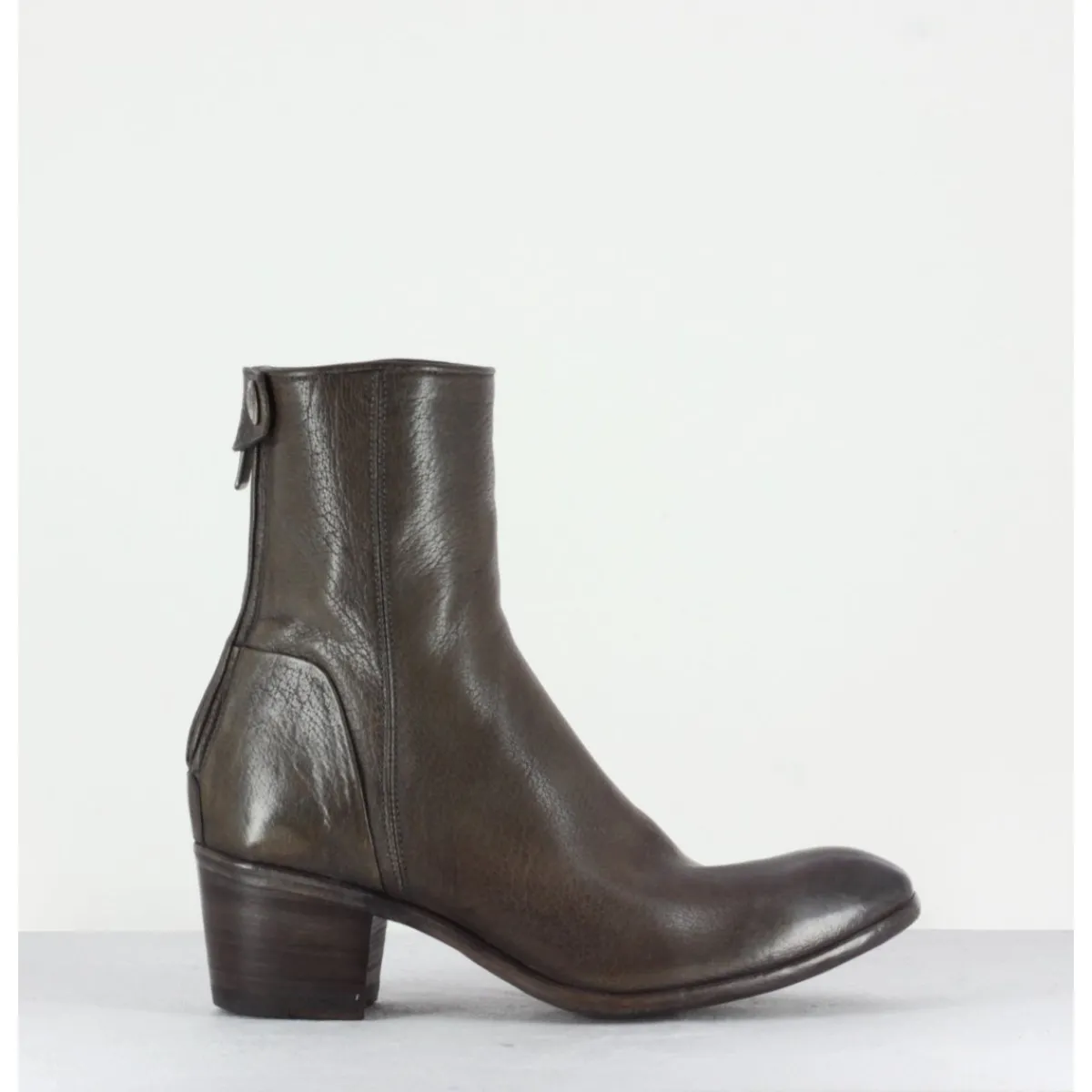 Bottine à tige mi-haute en cuir gris taupe souple avec fermeture arrière, montées sur un talon bottier. Fabrication artisanale.