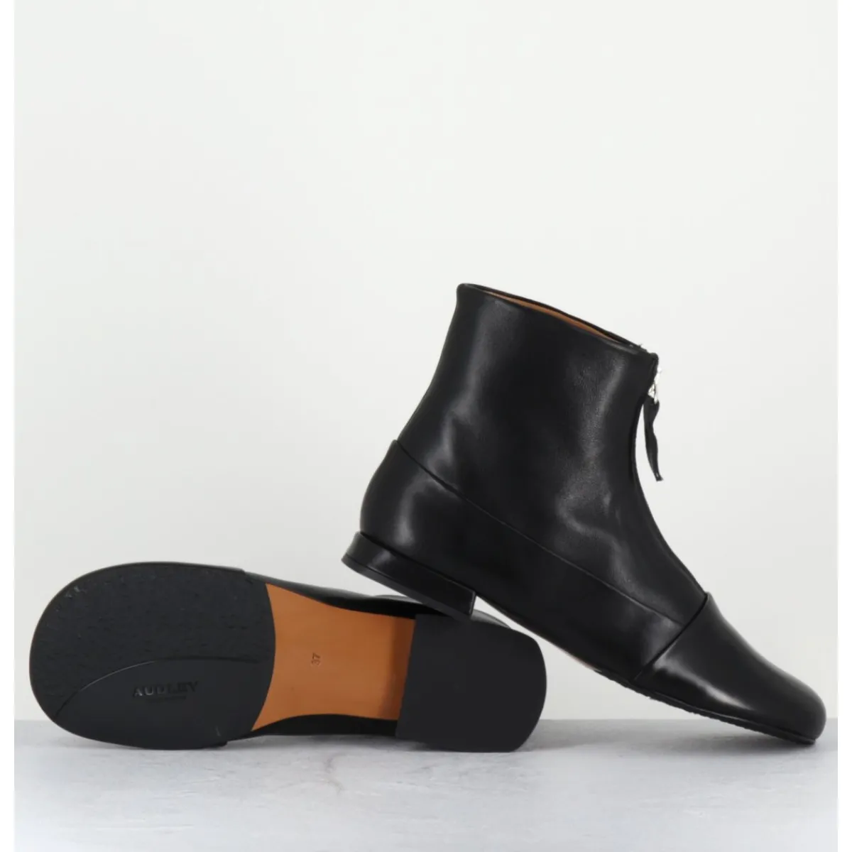 Boots plates en cuir extrêmement souple, zip central & bout rapporté large arrondi, ligne minimaliste japonisante au look 60s, montées sur un tout petit talon géométrique. D’un grand confort !