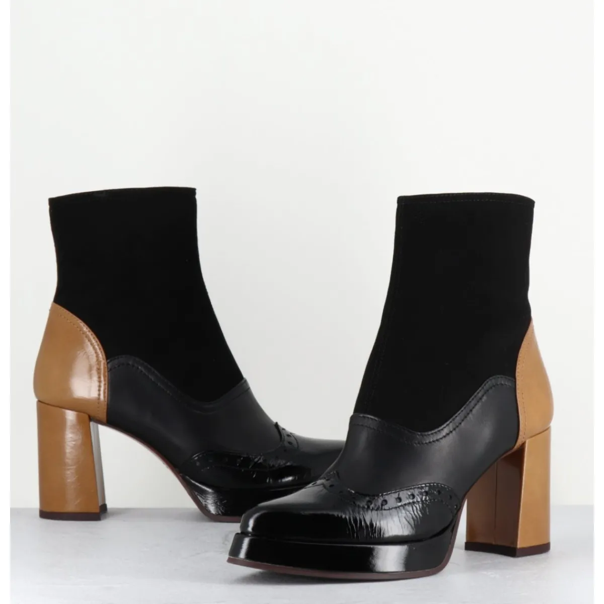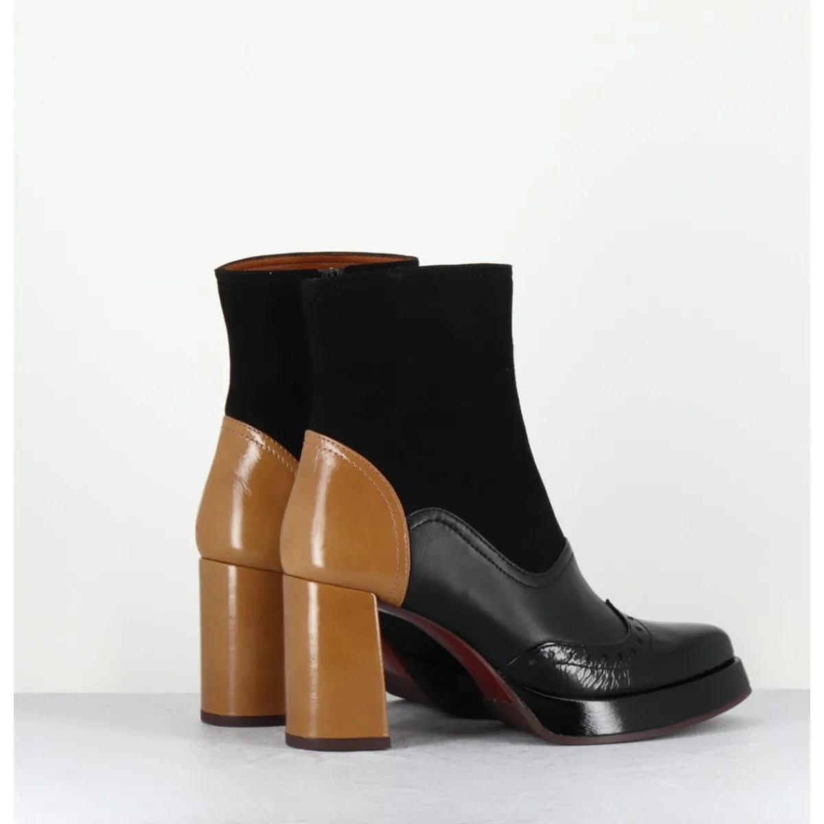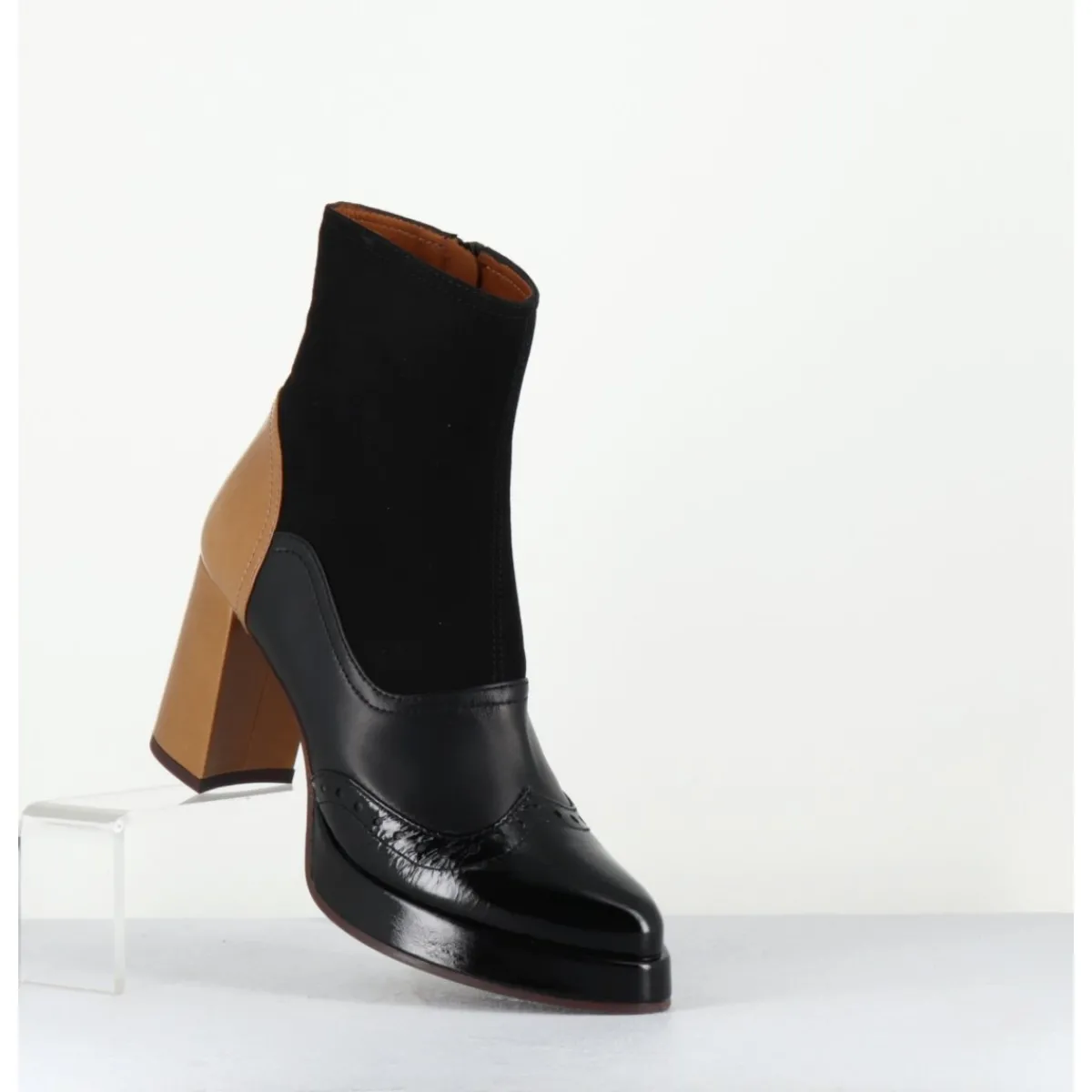 Boots multi-matière daim – cuir – vernis noir avec bout fleuri à l’avant et cuir beige légèrement brillant à l’arrière, bout effilé pointu doux, montées sur un talon droit, et une petite plateforme confortable.