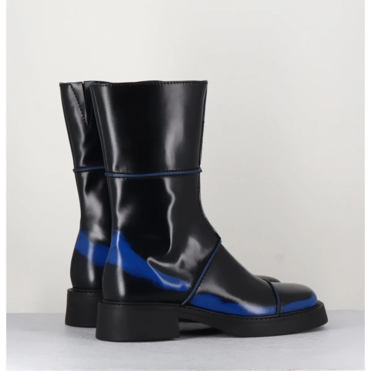 Boots tige mi-haute à bout carré large, cuir noir lisse brossé à la main pour obtenir cet effet bleu vieilli, faites d’une série d’empiècements aux coutures apparentes terminées par des bords bleus, zip intérieur, montées sur une semelle et un petit talon bloc en gomme.