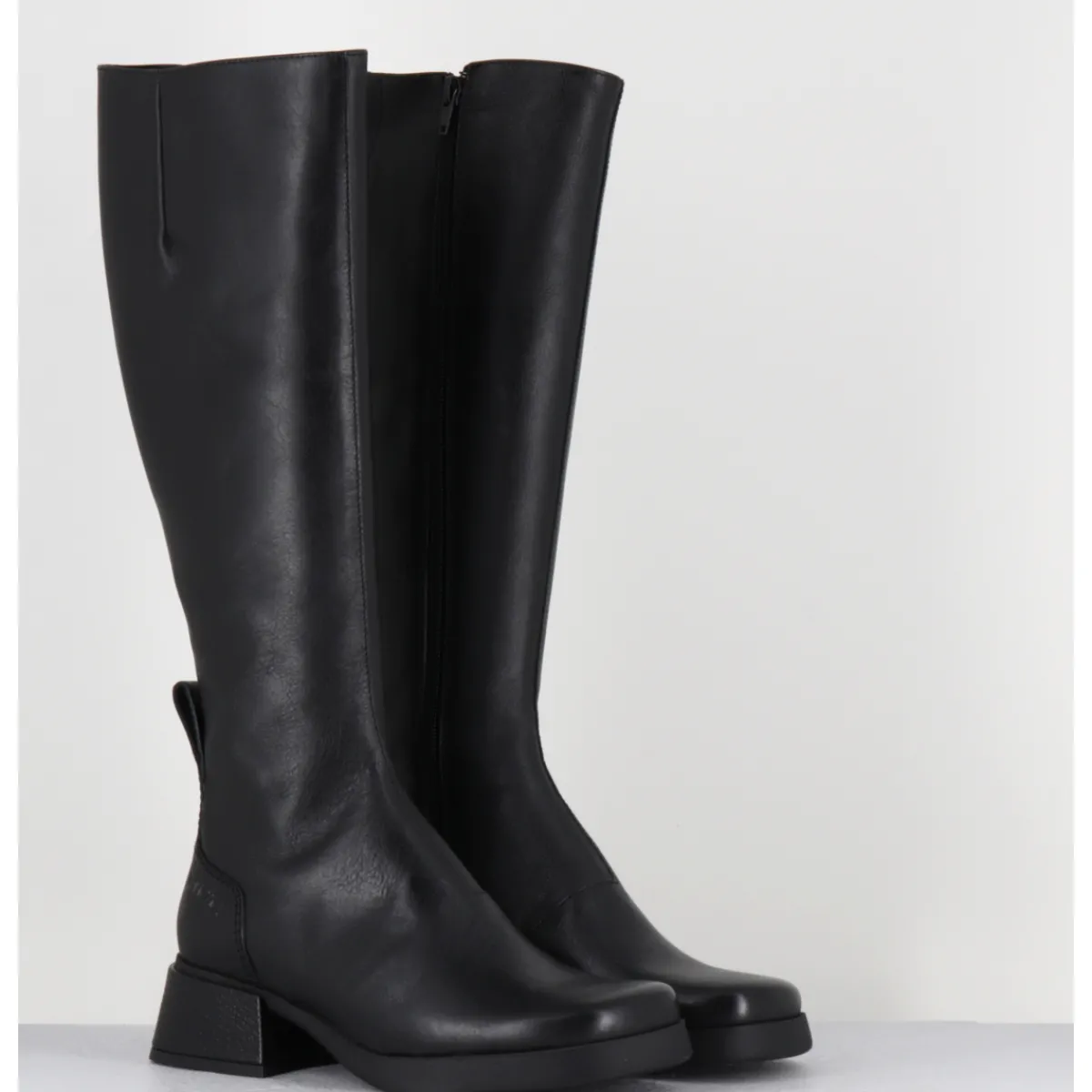 Bottes en cuir noir, bout carré arrondi, montées sur une fine plateforme en gomme et un petit talon bloc recouvert de cuir grainé