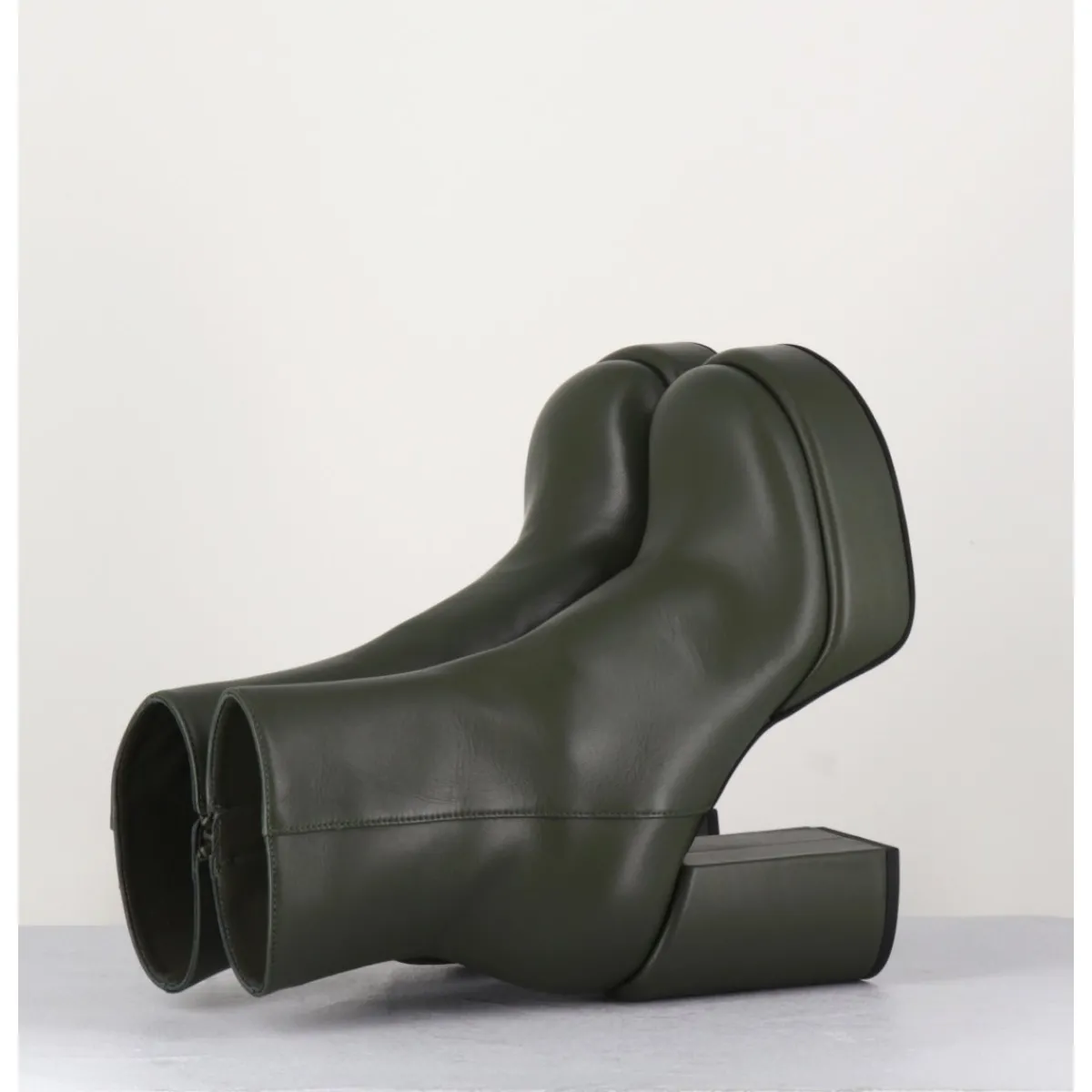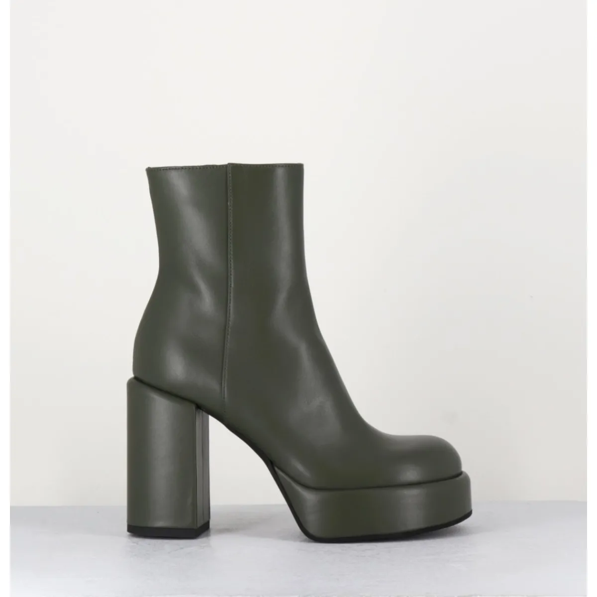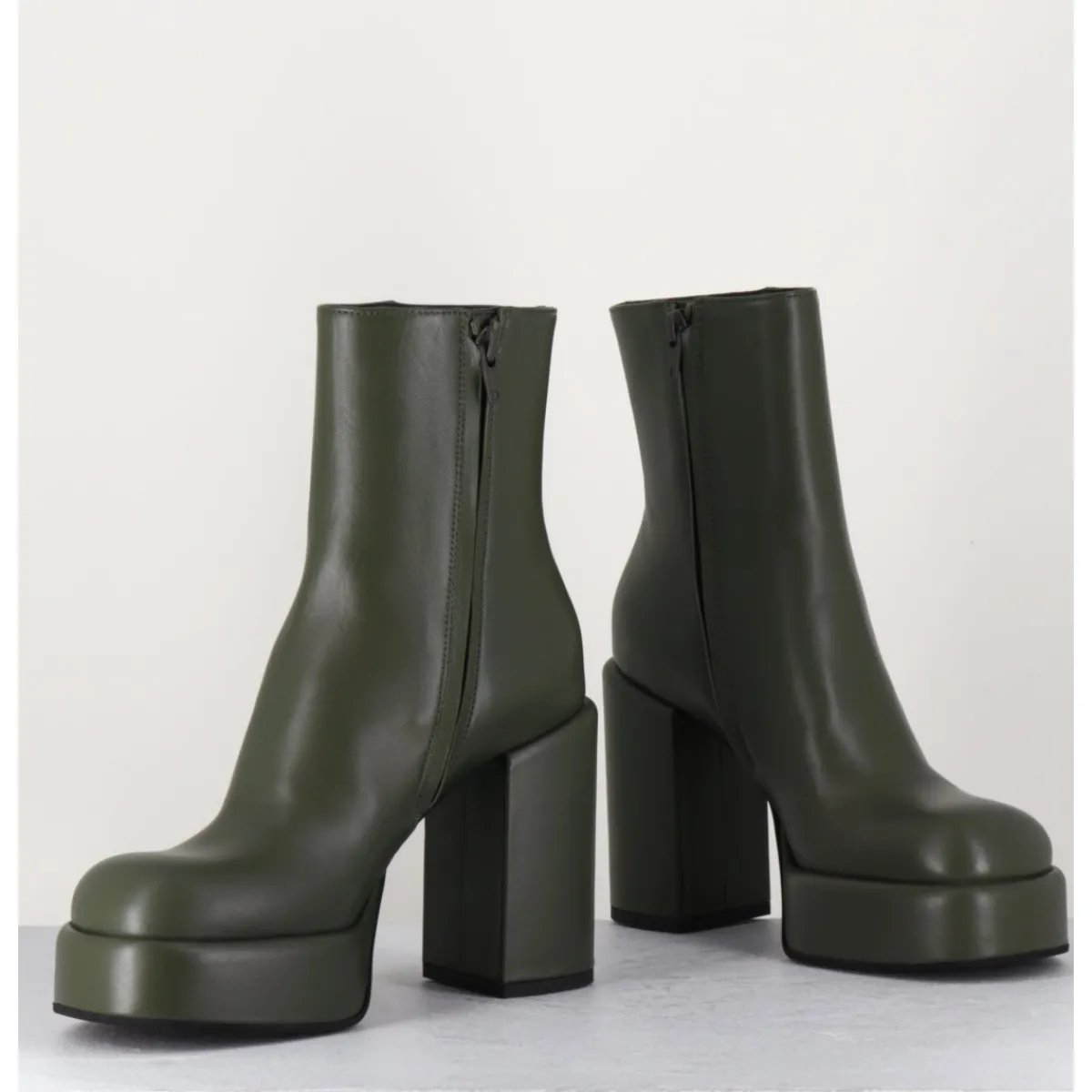 Boots 70s en cuir khaki, bout rond anatomique, zip intérieur, montées sur une plateforme et un talon stylisés et recouverts.