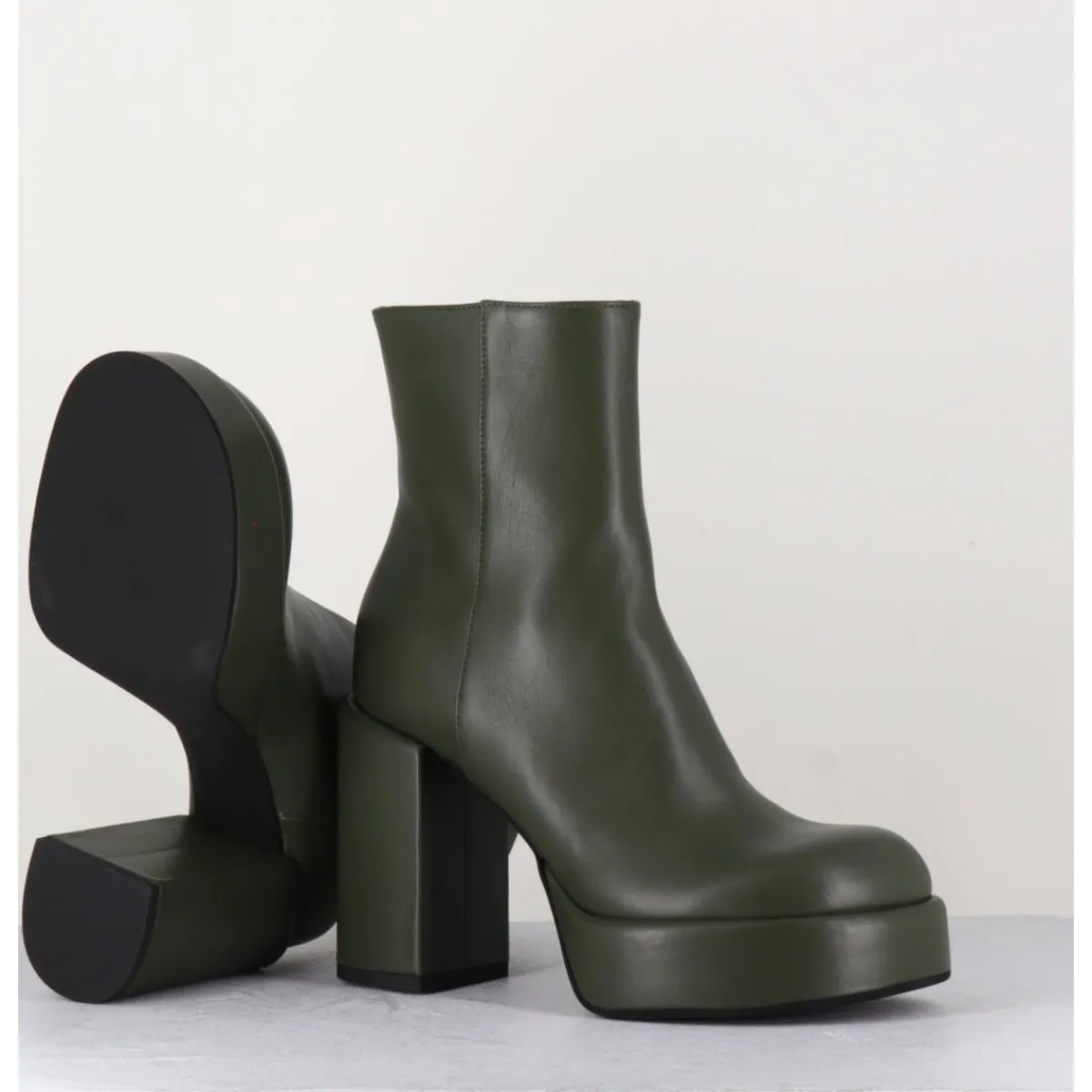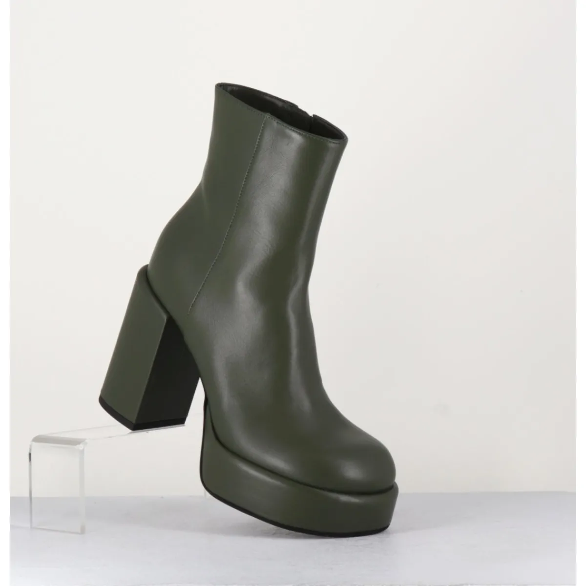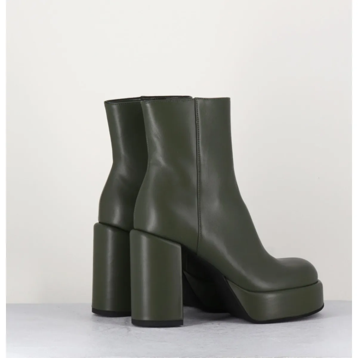 Boots 70s en cuir khaki, bout rond anatomique, zip intérieur, montées sur une plateforme et un talon stylisés et recouverts.