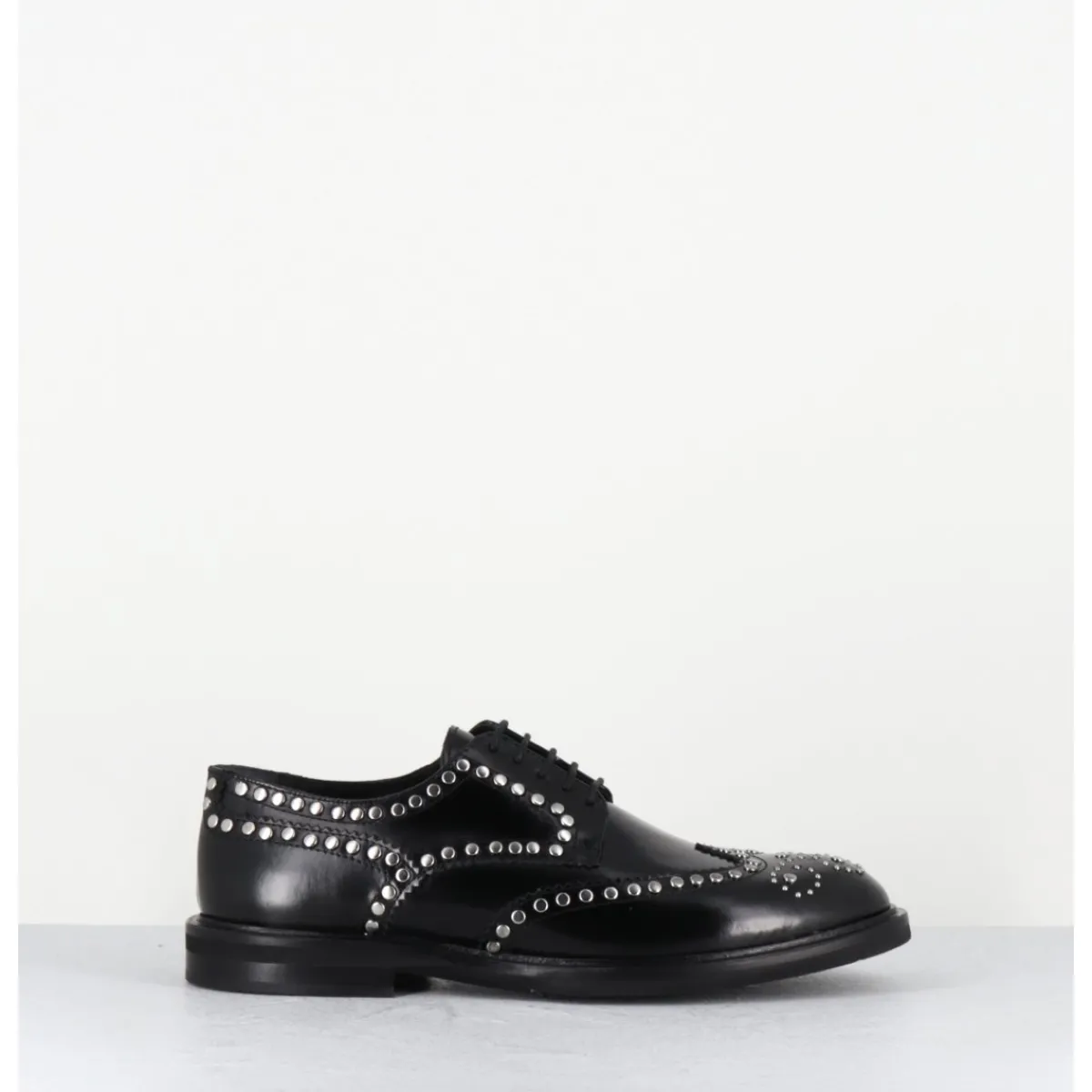 Derbies plats à lacets en cuir légèrement glacé noir, ornés de rivets argentés et d’un bout fleuri à l’avant, montées sur une semelle légère
