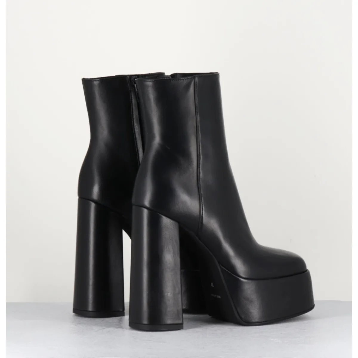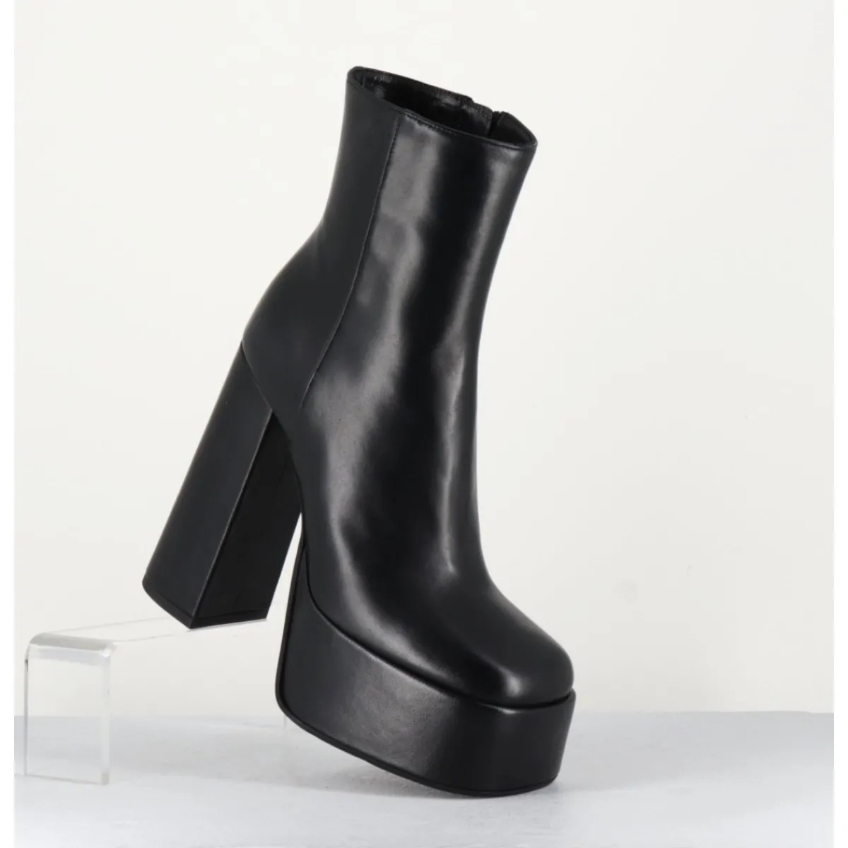 Boots à plateforme en cuir lisse noir, montés un très haut talon large.