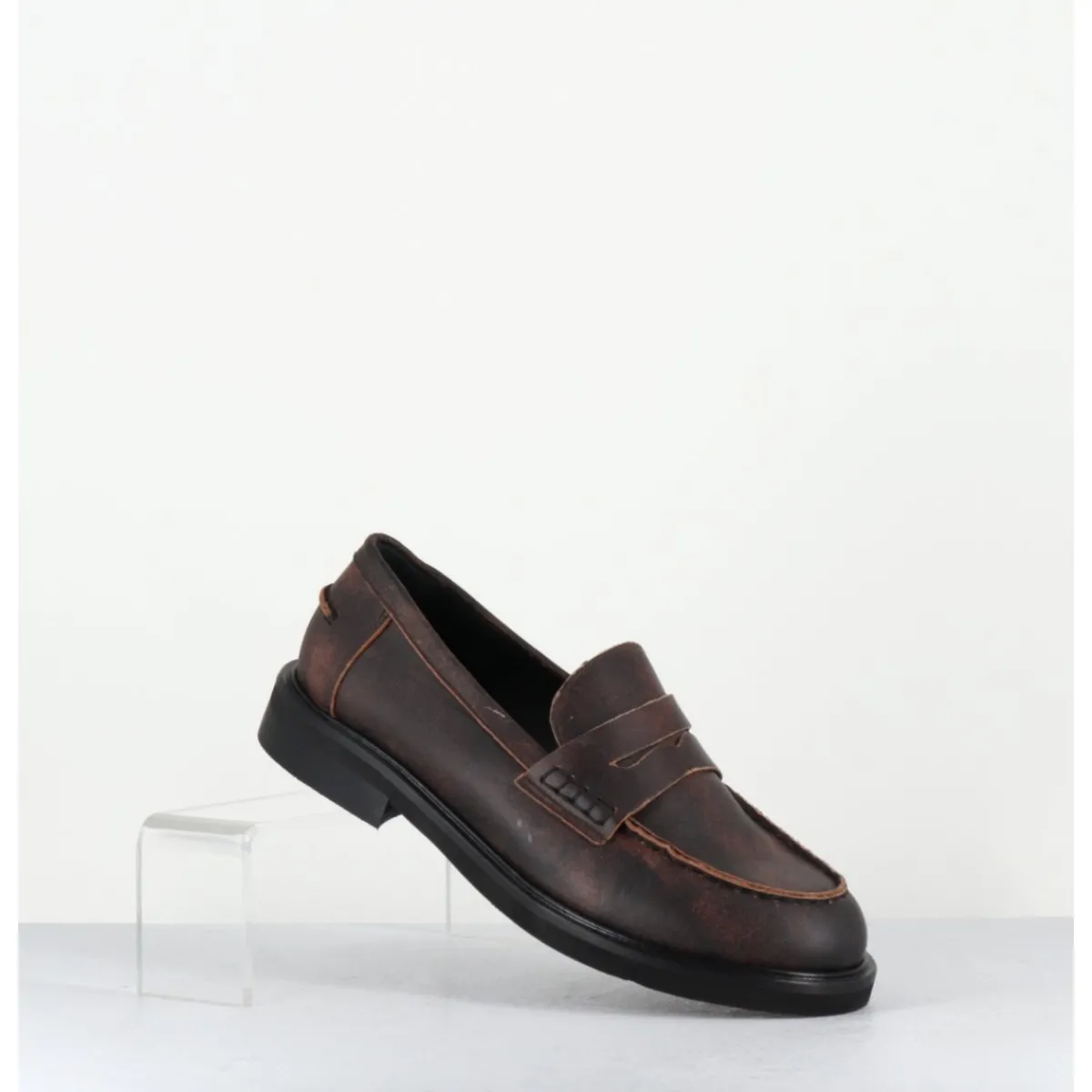 Mocassins plats en cuir souple imprimé effet cuir vieilli marron & camel, bout rond esprit collège, montés sur une semelle légère en gomme