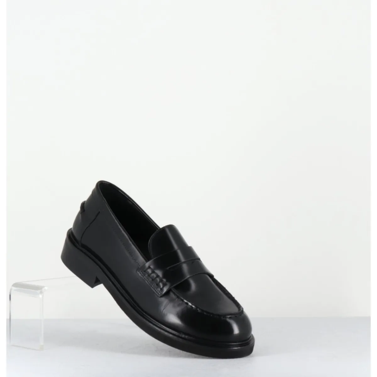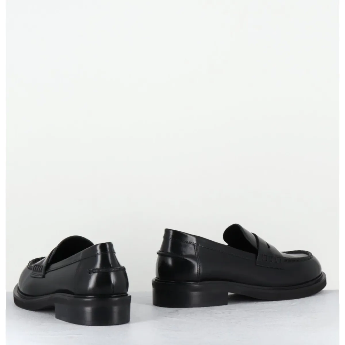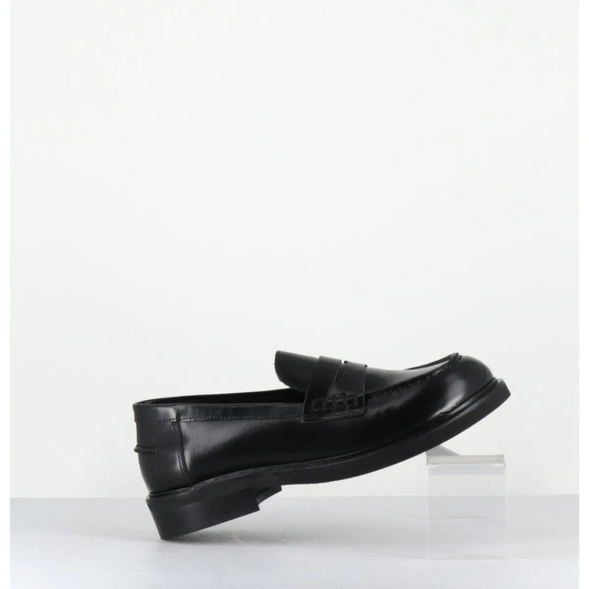 Mocassins plats en cuir noir légèrement glacé, bout rond esprit collège, montés sur une semelle légère en gomme