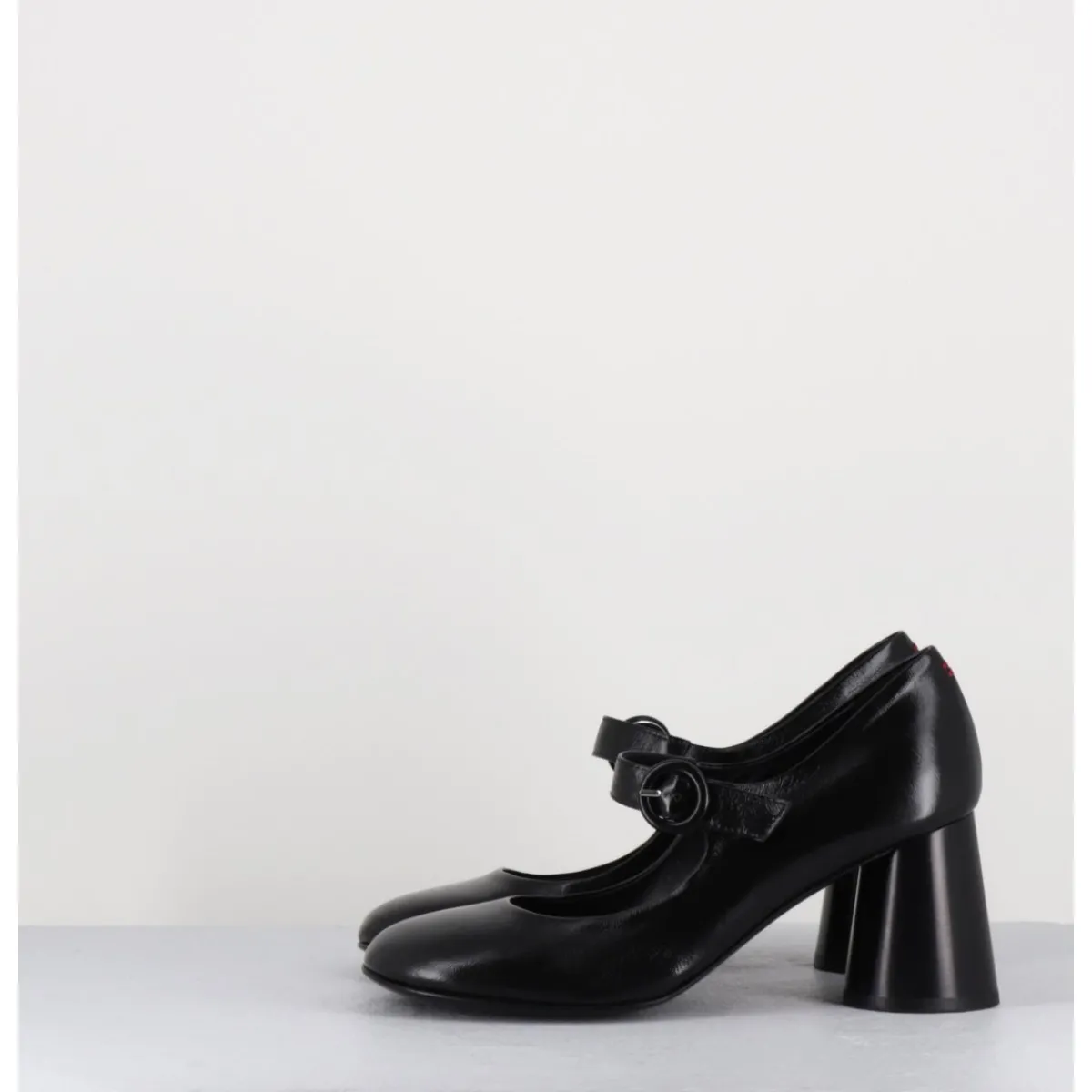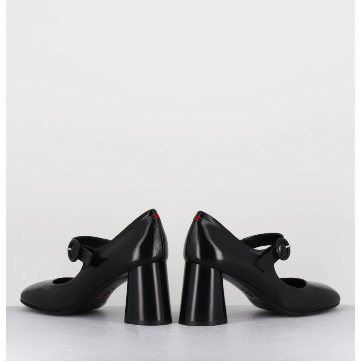 Babies à talon en cuir souple noir légèrement brillant, bout très rond, bride cheville réglable, couture signature de la maison sur le contrefort, montés sur un talon cylindrique évasé peint à la main en noir.
