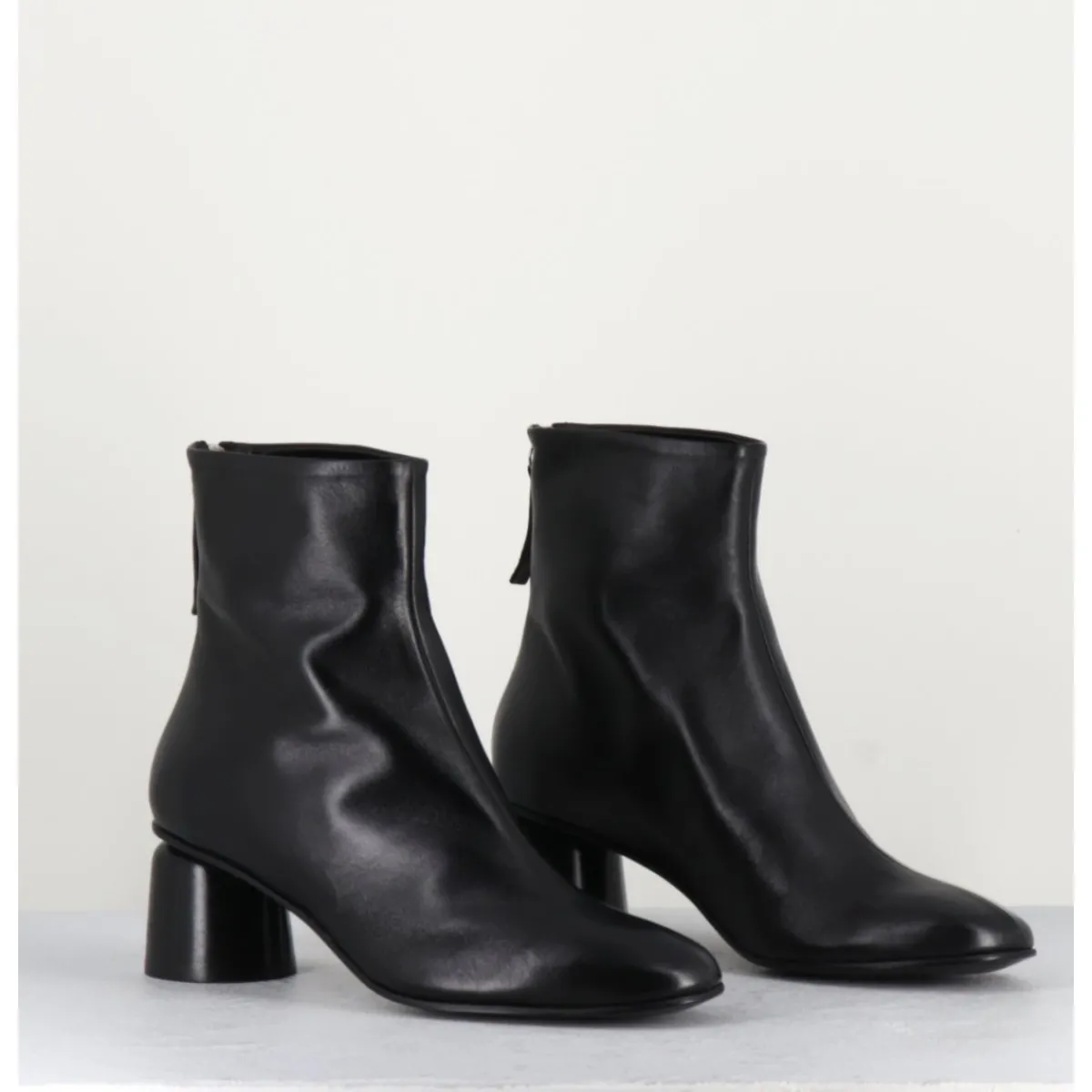Bottines en cuir ultra souple noir, bout rond et couture central 60s, montées sur un petit talon cylindrique noir, peint à la main.