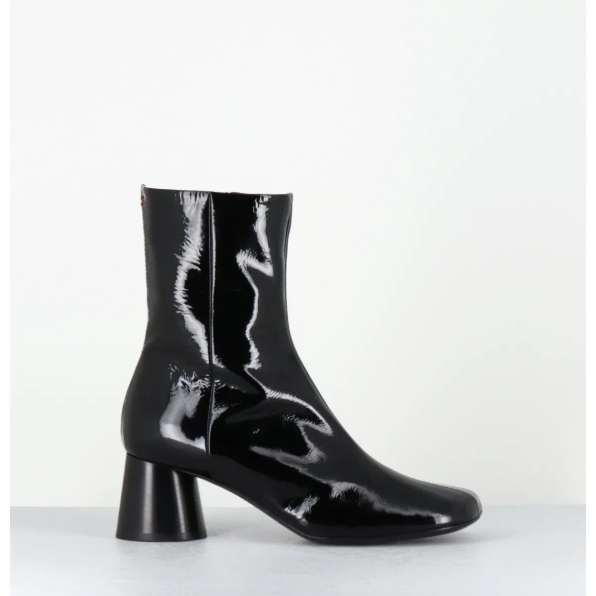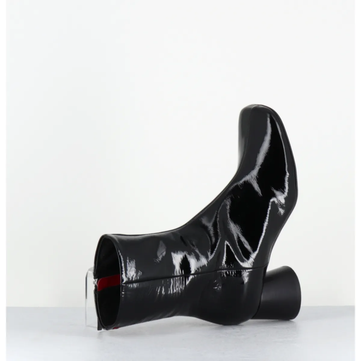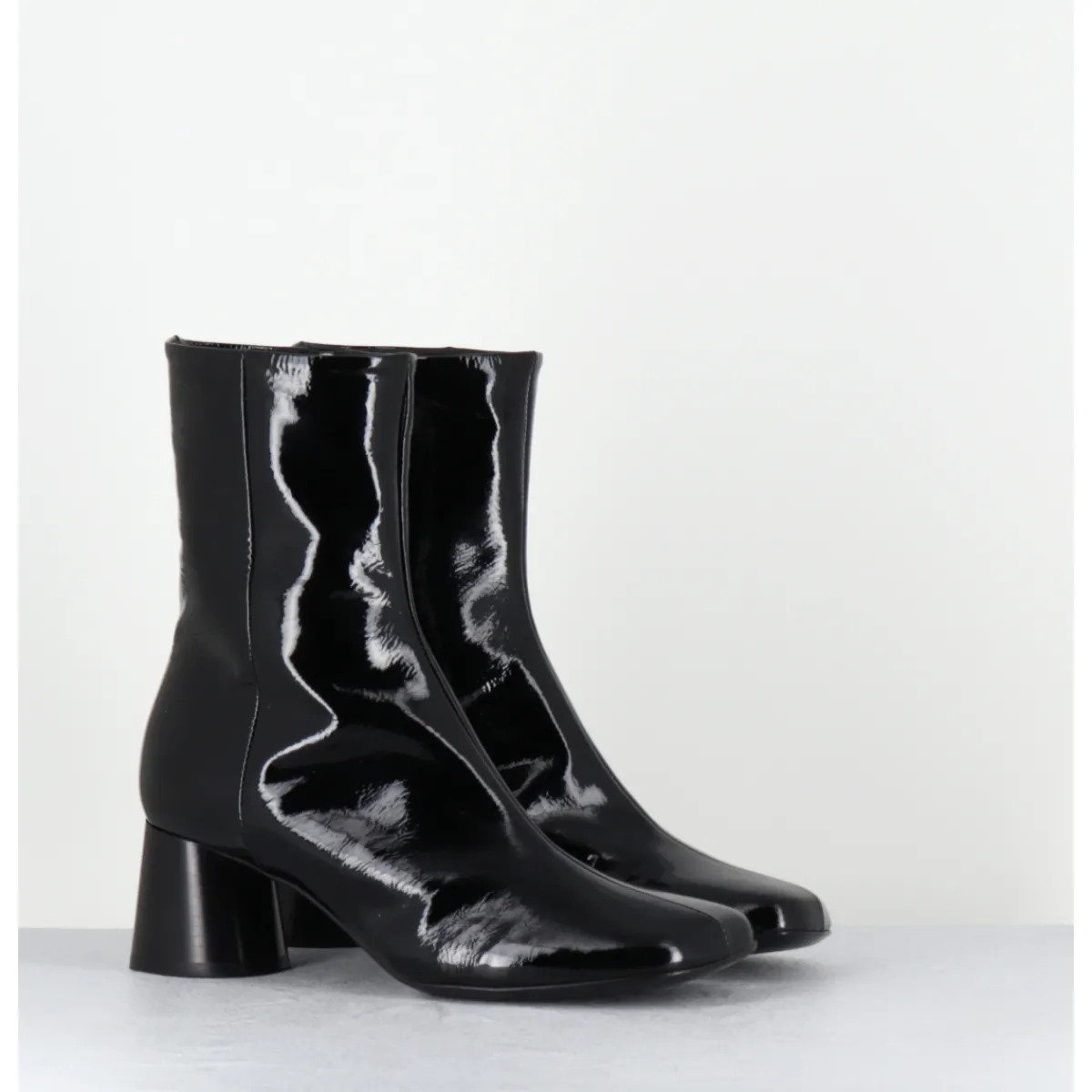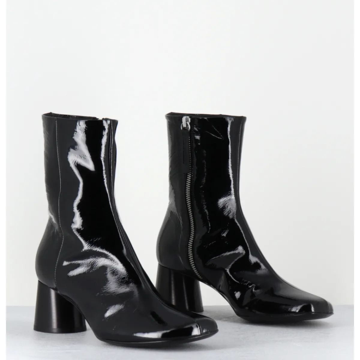 Boots en cuir noir vernis souple, bout carré légèrement asymétrique, zip intérieur, couture signature de la maison sur le contrefort, montés sur un talon cylindrique évasé peint à la main en noir