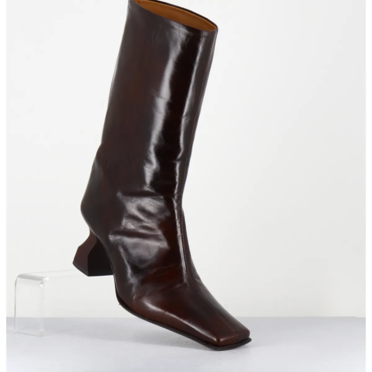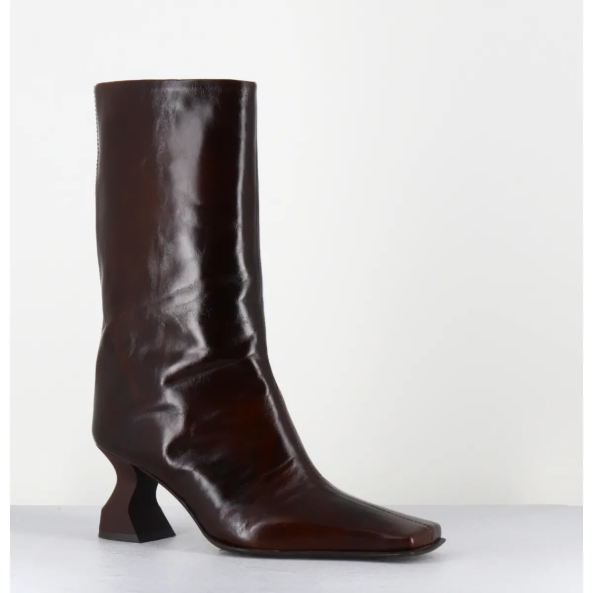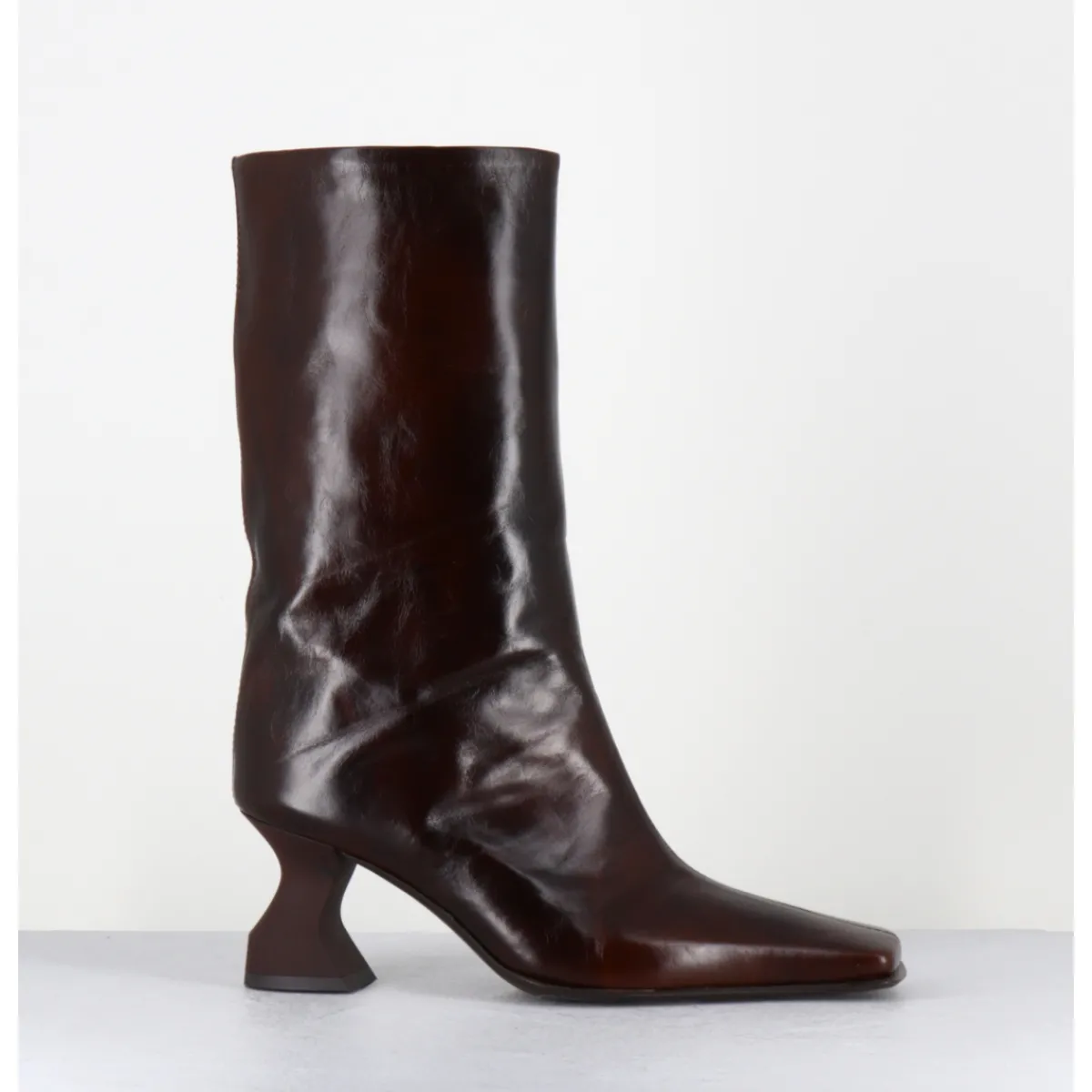 Boots en cuir froissé marron brossé pour un effet ‘vintage’, ligne effilée à bout carré 90s, tige droite large qui s’enfile, montées sur un talon virgule stylisé recouvert de gomme
