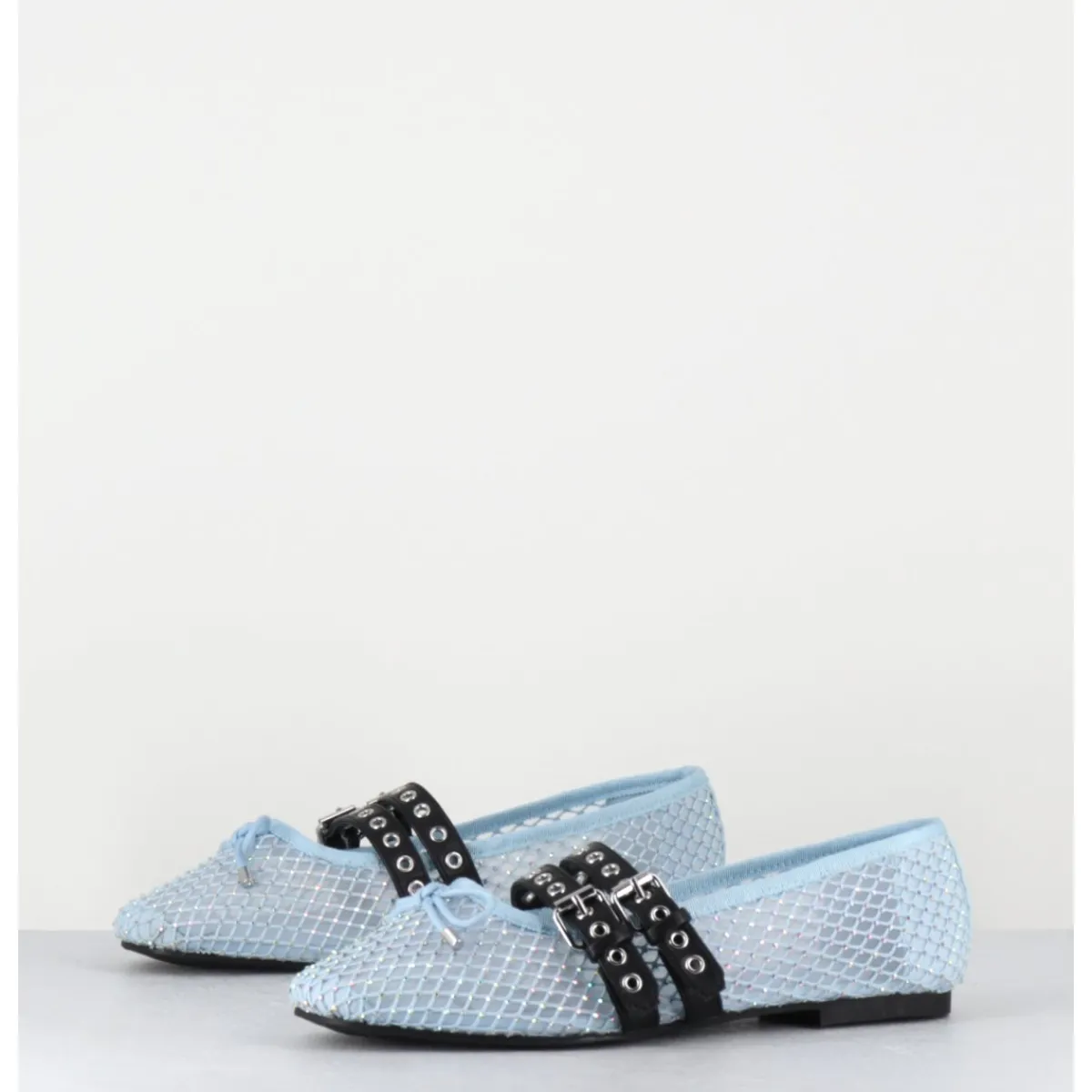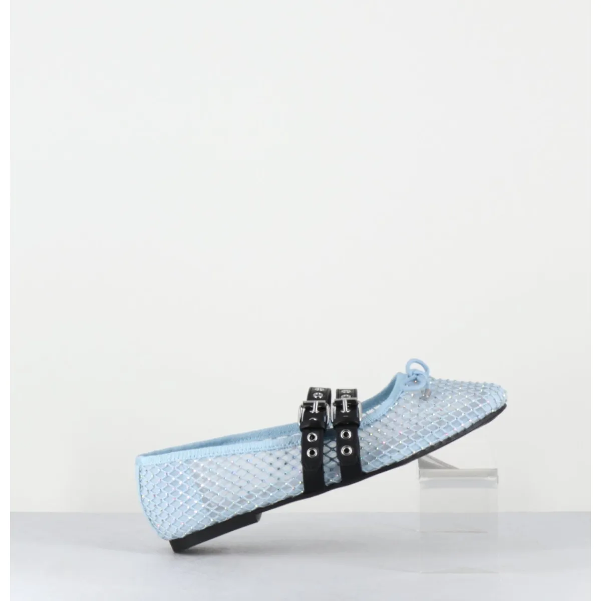 Ballerines en mesh bleu ciel effet résille orné de petits strass, double brides réglables en cuir noir esprit Mary-Jane, ligne effilée avec bout arrondi et petit noeud décoratif, montées sur une semelle plate en gomme